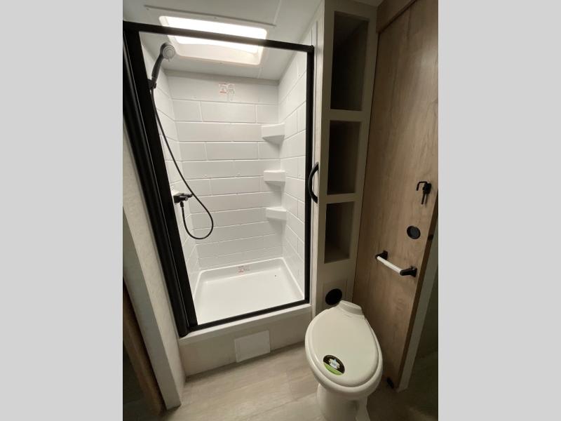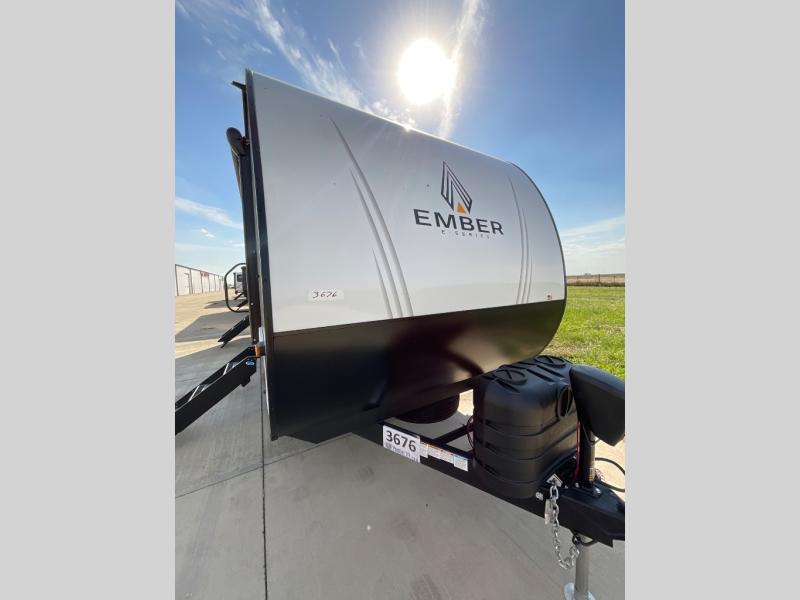 With any E-Series travel trailer by Ember RV you will enjoy a lightweight RV with all the "Essentials" needed for memorable trips in the great outdoors! Each model is constructed with durable laminated Azdel Onboard composite walls, a full walkable roof with a one-piece Tufflex PVC roofing material, and a gel-coated fiberglass exterior. The Dexter axles with E-Z lube hubs and forward self-adjusting electric brakes plus Goodyear Endurance tires will provide a smooth tow from home to campground. You will appreciate the Congoleum DiamondFlor "carpetless" interior that is easy to clean, and the hardwood framed cabinet doors will create a more residential feel. Each model includes a tankless on-demand water heater for endless hot showers and an 18,000 BTU Max Cool "Whisper Quiet" A/C, which is the largest single A/C in its class! An EmberLink Smart RV system will let you easily control features such as lights and slides and you can wash away those rainy day blues by watching the HDTV with a built-in Bluetooth AV system. If you're looking for off-grid capabilities, you might want to choose the optional Off-Grid Solar Package with 400 total watts of solar panels, a 2,000W Pure Sine wave inverter, and a Victron MPPT solar controller!