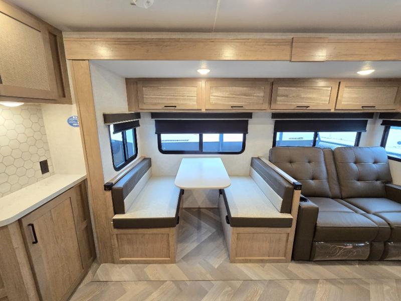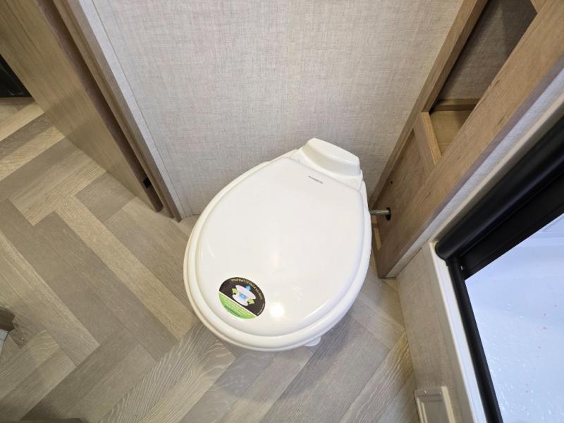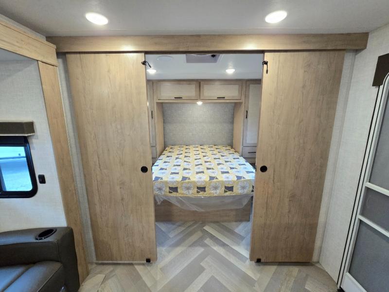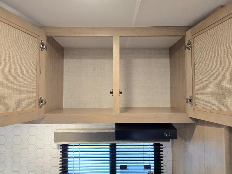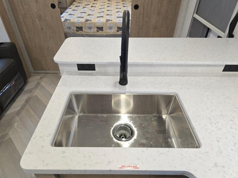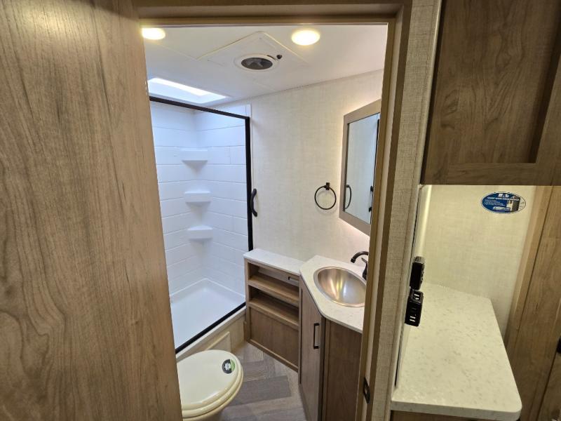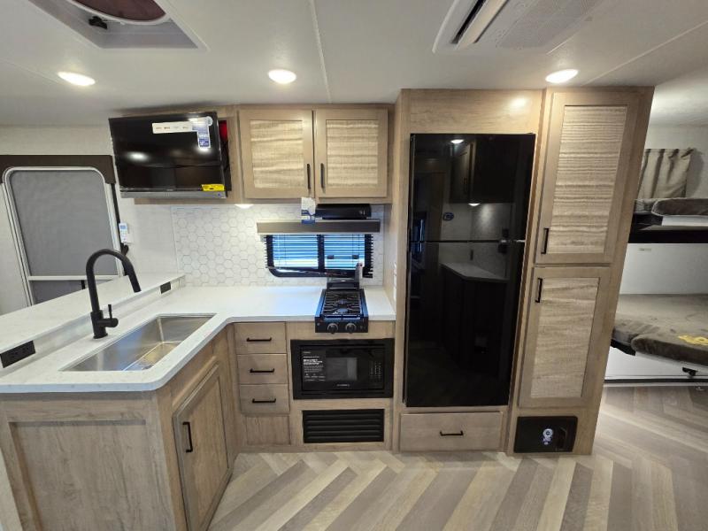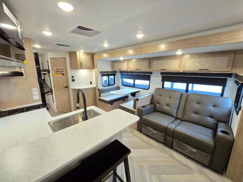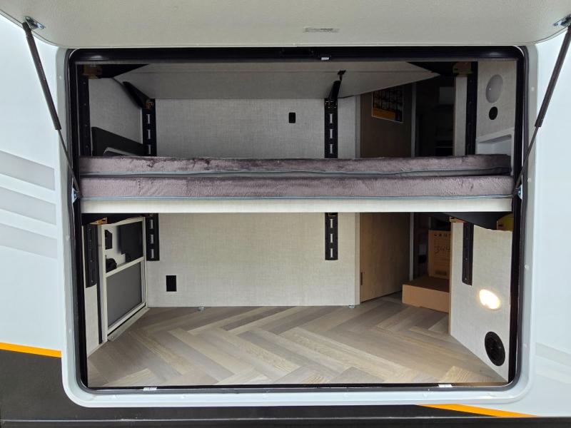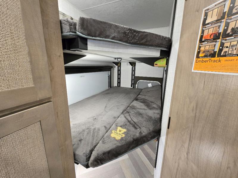 This model resembles 22ETS, but you'll enjoy added theater seating and a larger exterior length for more interior space! The patent-pending repositionable EmberTrack E-Track bunk/storage system includes 74" x 45" cargo space, and there are multiple single/double bunk configurations to fit your needs. The front walk-around true residential queen bed includes dual nightstands and dual wardrobes, and you'll appreciate sliding doors that makes a private bedroom. This E-Series kitchen includes an air fryer convection microwave, a two burner cooktop, plus a breakfast bar with bar stools so you can visit with the chef as they cook meals. A legless dinette will provide a place to dine, or you can take your plate outdoors to sit under the 18' power awning with a dimmable LED light. You'll also find a pass-through storage outside, along with a docking station and a kayak/bike storage door!