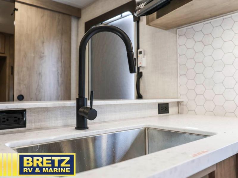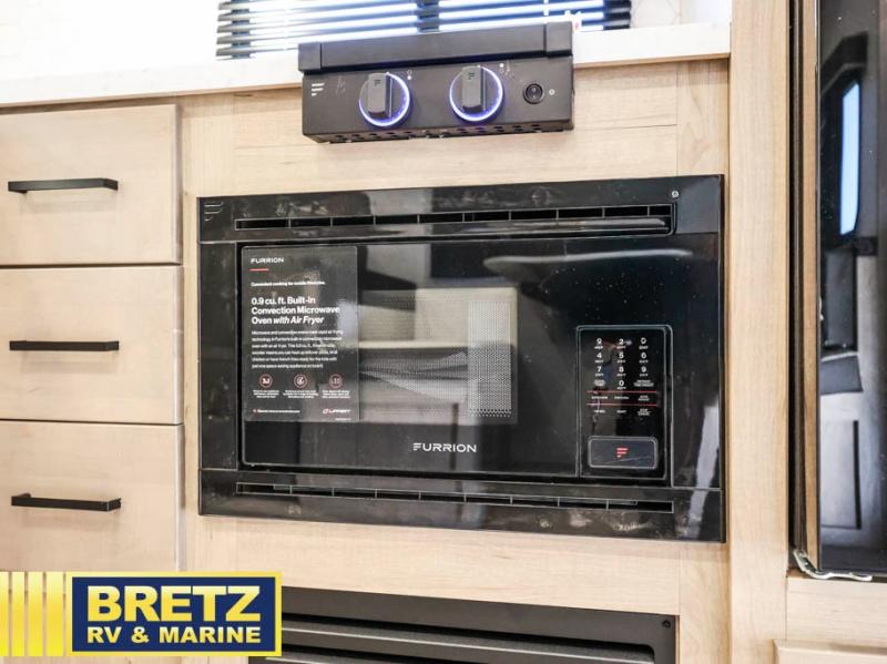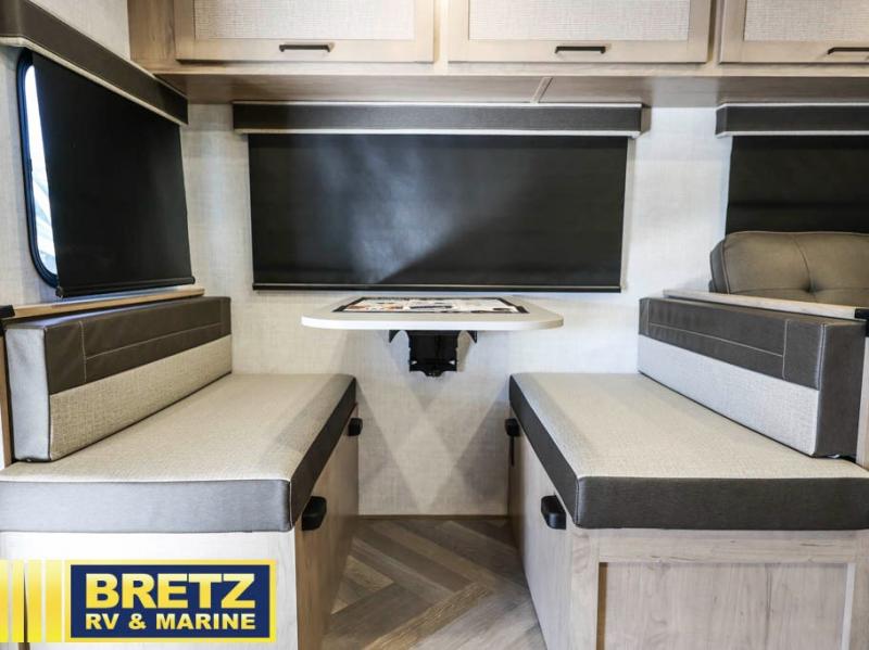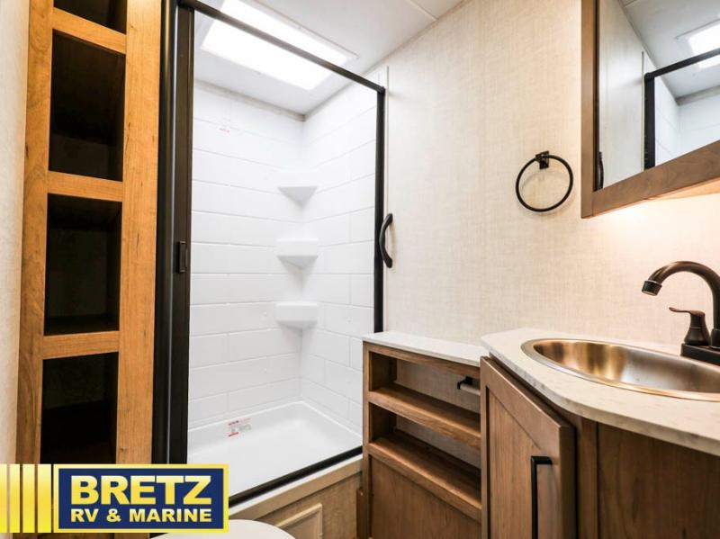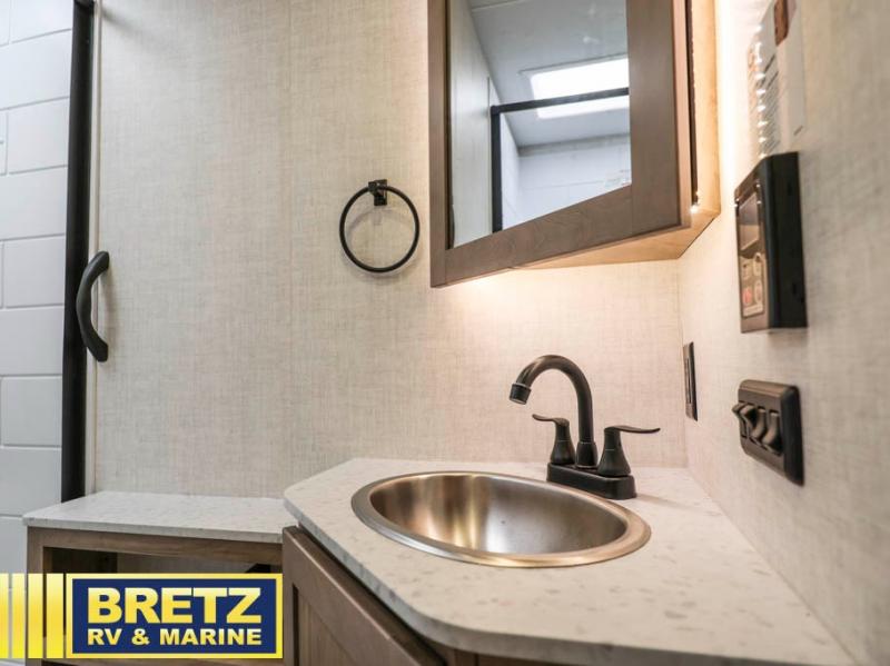 This model resembles 22ETS, but you'll enjoy added theater seating and a larger exterior length for more interior space! The patent-pending repositionable EmberTrack E-Track bunk/storage system includes 74" x 45" cargo space, and there are multiple single/double bunk configurations to fit your needs. The front walk-around true residential queen bed includes dual nightstands and dual wardrobes, and you'll appreciate sliding doors that makes a private bedroom. This E-Series kitchen includes an air fryer convection microwave, a two burner cooktop, plus a breakfast bar with bar stools so you can visit with the chef as they cook meals. A legless dinette will provide a place to dine, or you can take your plate outdoors to sit under the 18' power awning with a dimmable LED light. You'll also find a pass-through storage outside, along with a docking station and a kayak/bike storage door!