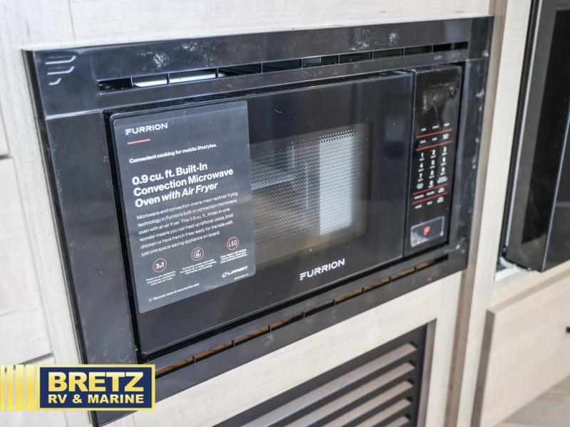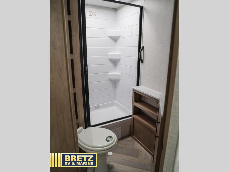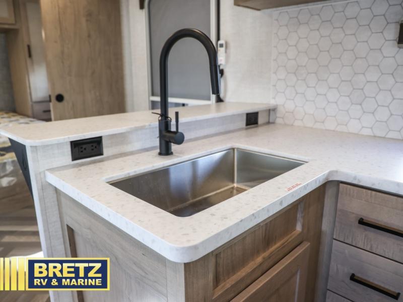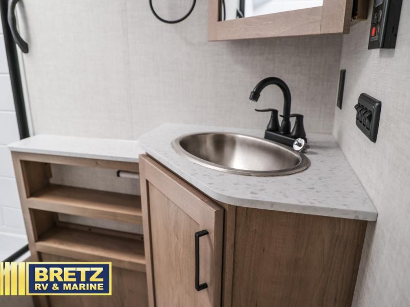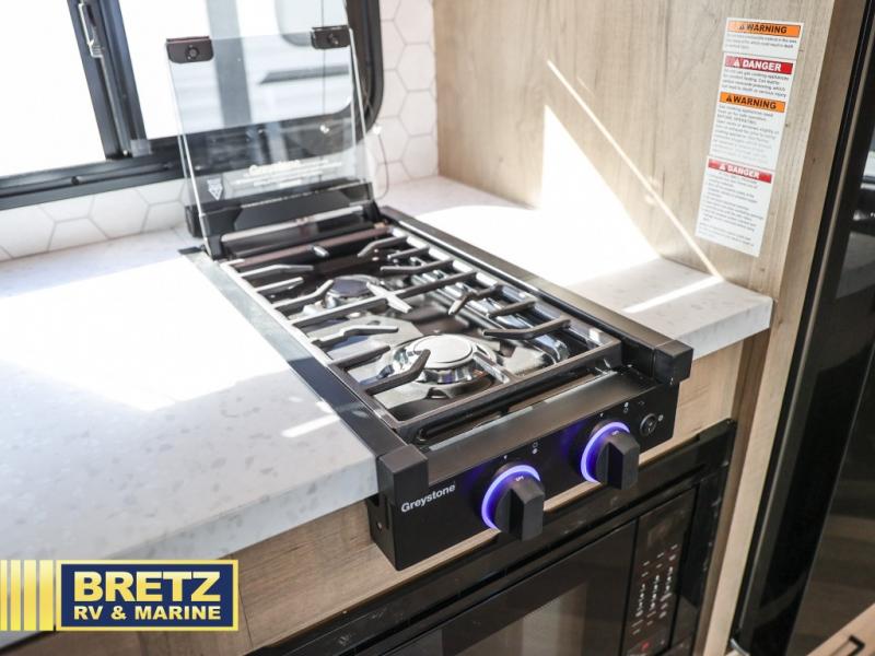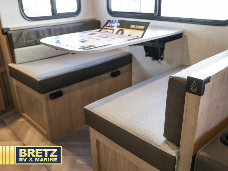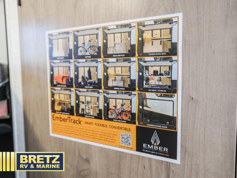 This model resembles 22ETS, but you'll enjoy added theater seating and a larger exterior length for more interior space! The patent-pending repositionable EmberTrack E-Track bunk/storage system includes 74" x 45" cargo space, and there are multiple single/double bunk configurations to fit your needs. The front walk-around true residential queen bed includes dual nightstands and dual wardrobes, and you'll appreciate sliding doors that makes a private bedroom. This E-Series kitchen includes an air fryer convection microwave, a two burner cooktop, plus a breakfast bar with bar stools so you can visit with the chef as they cook meals. A legless dinette will provide a place to dine, or you can take your plate outdoors to sit under the 18' power awning with a dimmable LED light. You'll also find a pass-through storage outside, along with a docking station and a kayak/bike storage door!