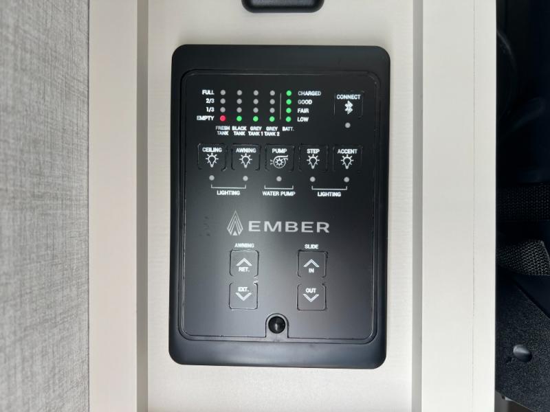 With any E-Series travel trailer by Ember RV you will enjoy a lightweight RV with all the "Essentials" needed for memorable trips in the great outdoors! Each model is constructed with durable laminated Azdel Onboard composite walls, a full walkable roof with a one-piece Tufflex PVC roofing material, and a gel-coated fiberglass exterior. The Dexter axles with E-Z lube hubs and forward self-adjusting electric brakes plus Goodyear Endurance tires will provide a smooth tow from home to campground. You will appreciate the Congoleum DiamondFlor "carpetless" interior that is easy to clean, and the hardwood framed cabinet doors will create a more residential feel. Each model includes a tankless on-demand water heater for endless hot showers and an 18,000 BTU Max Cool "Whisper Quiet" A/C, which is the largest single A/C in its class! An EmberLink Smart RV system will let you easily control features such as lights and slides and you can wash away those rainy day blues by watching the HDTV with a built-in Bluetooth AV system. If you're looking for off-grid capabilities, you might want to choose the optional Off-Grid Solar Package with 400 total watts of solar panels, a 2,000W Pure Sine wave inverter, and a Victron MPPT solar controller!