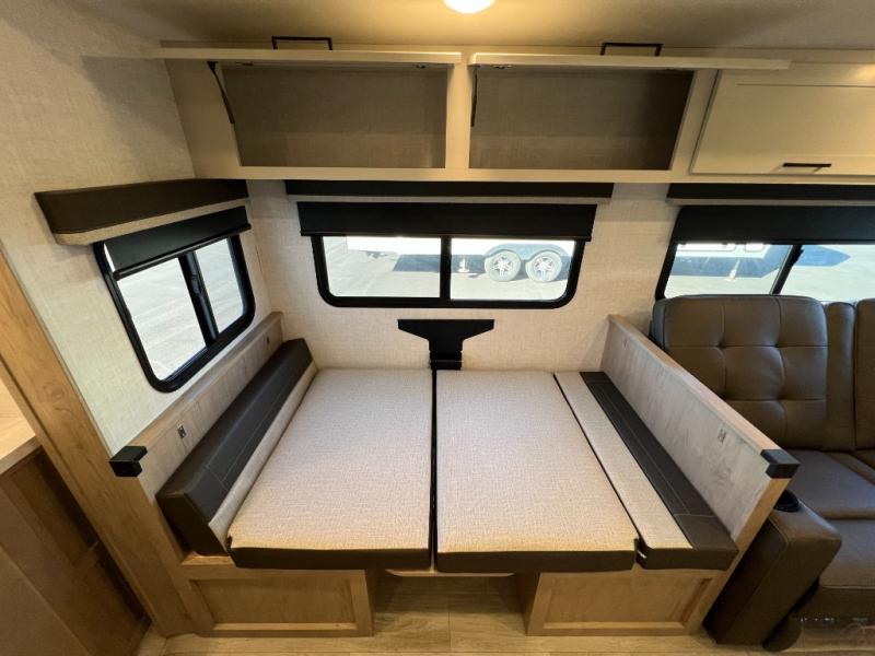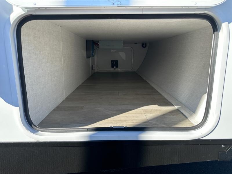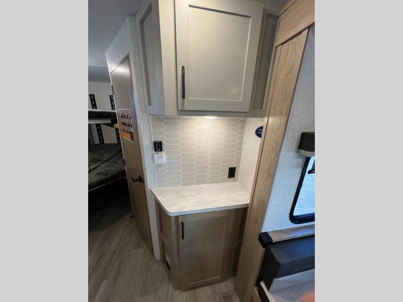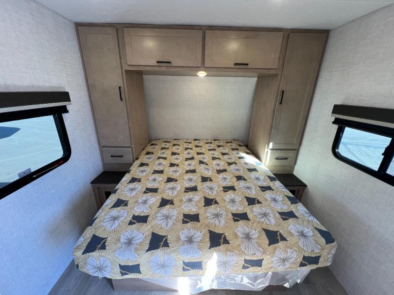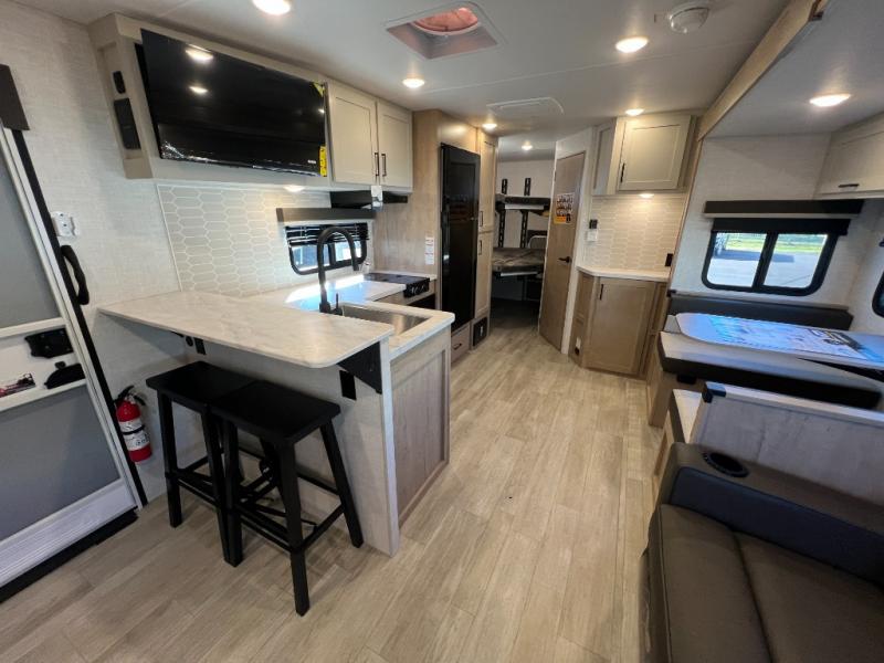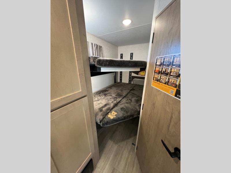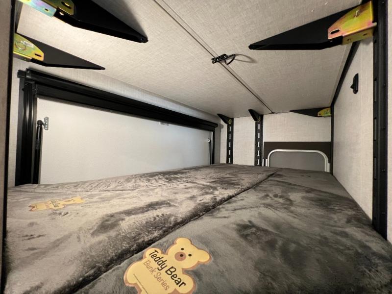This model resembles 22ETS, but you'll enjoy added theater seating and a larger exterior length for more interior space! The patent-pending repositionable EmberTrack E-Track bunk/storage system includes 74" x 45" cargo space, and there are multiple single/double bunk configurations to fit your needs. The front walk-around true residential queen bed includes dual nightstands and dual wardrobes, and you'll appreciate sliding doors that makes a private bedroom. This E-Series kitchen includes an air fryer convection microwave, a two burner cooktop, plus a breakfast bar with bar stools so you can visit with the chef as they cook meals. A legless dinette will provide a place to dine, or you can take your plate outdoors to sit under the 18' power awning with a dimmable LED light. You'll also find a pass-through storage outside, along with a docking station and a kayak/bike storage door!