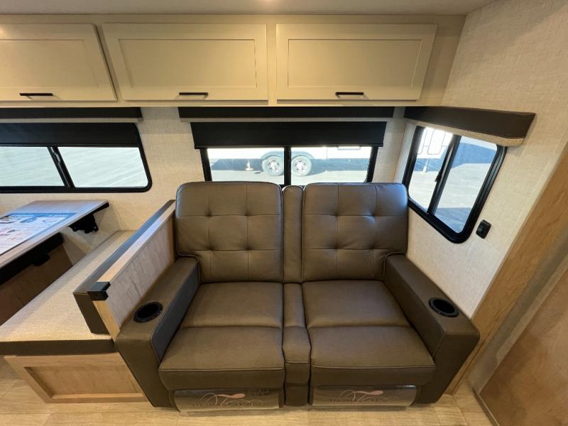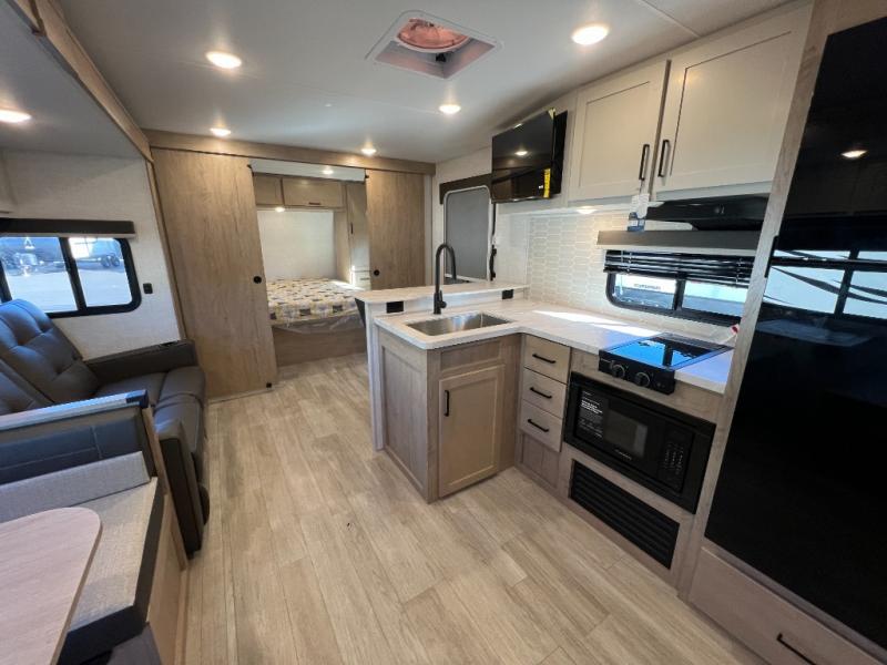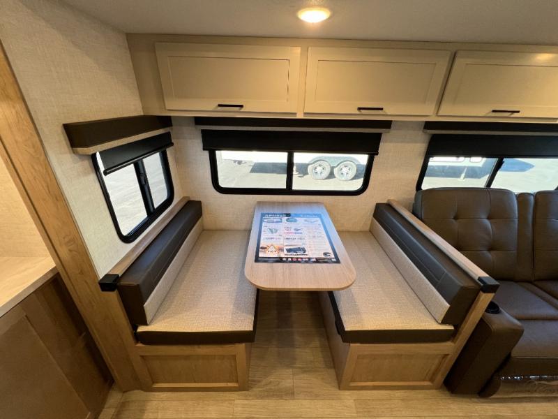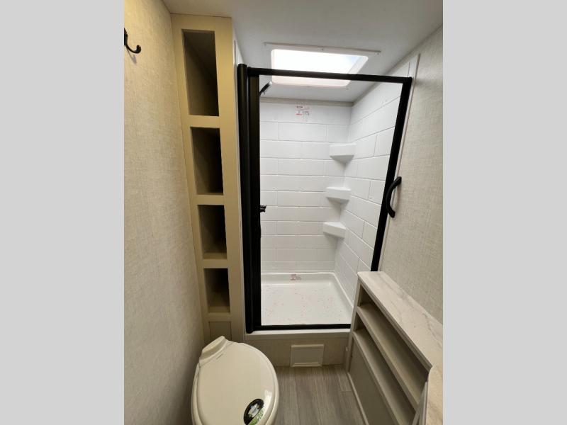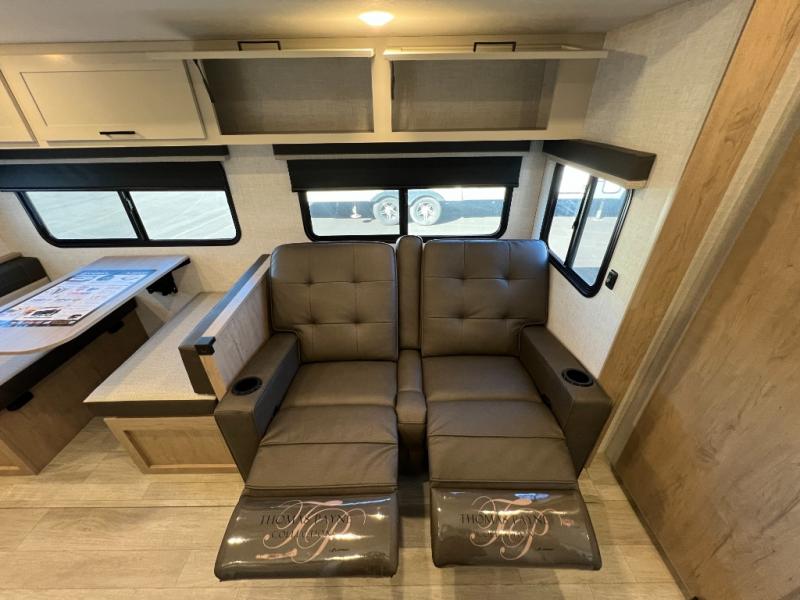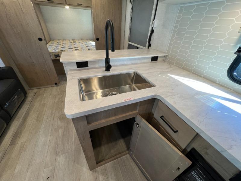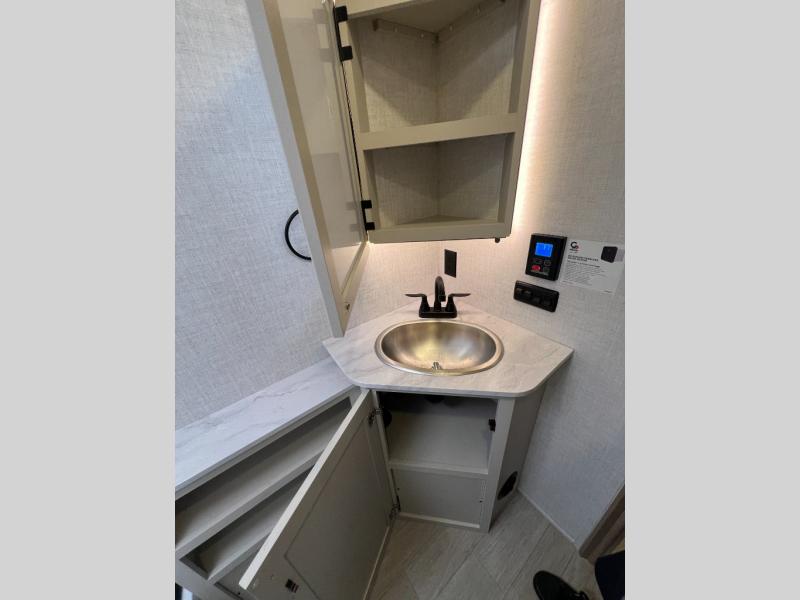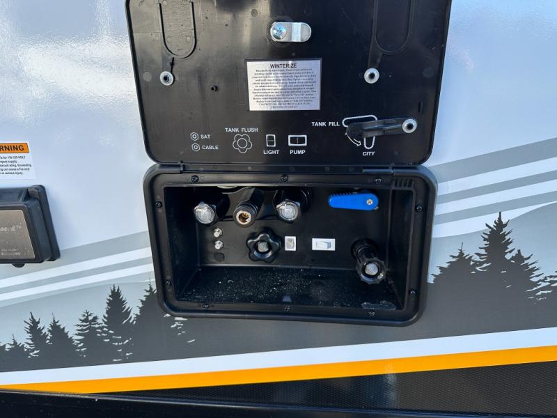 This model resembles 22ETS, but you'll enjoy added theater seating and a larger exterior length for more interior space! The patent-pending repositionable EmberTrack E-Track bunk/storage system includes 74" x 45" cargo space, and there are multiple single/double bunk configurations to fit your needs. The front walk-around true residential queen bed includes dual nightstands and dual wardrobes, and you'll appreciate sliding doors that makes a private bedroom. This E-Series kitchen includes an air fryer convection microwave, a two burner cooktop, plus a breakfast bar with bar stools so you can visit with the chef as they cook meals. A legless dinette will provide a place to dine, or you can take your plate outdoors to sit under the 18' power awning with a dimmable LED light. You'll also find a pass-through storage outside, along with a docking station and a kayak/bike storage door!