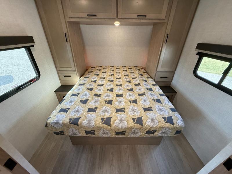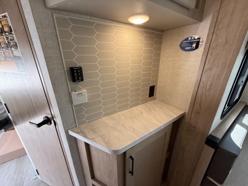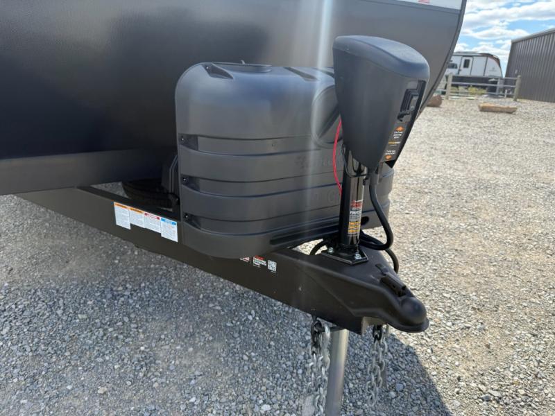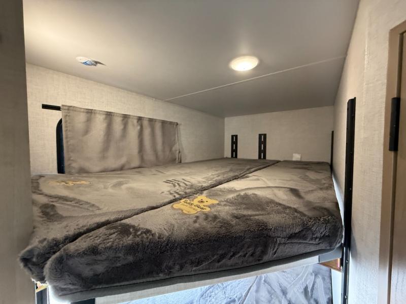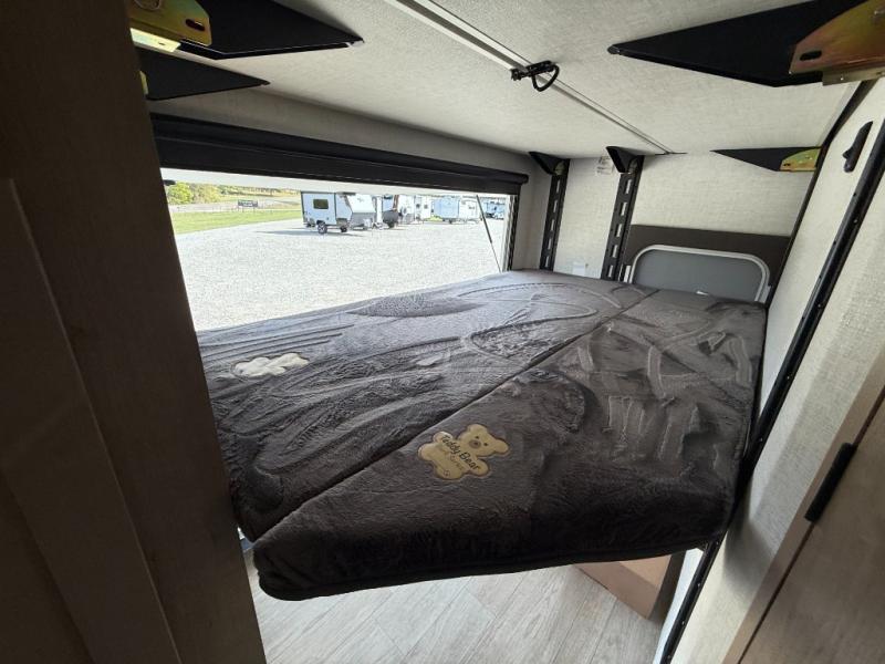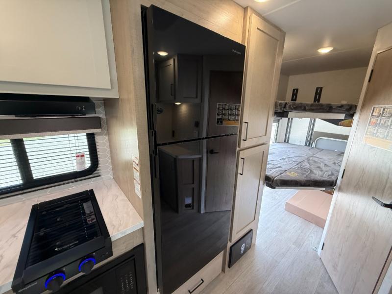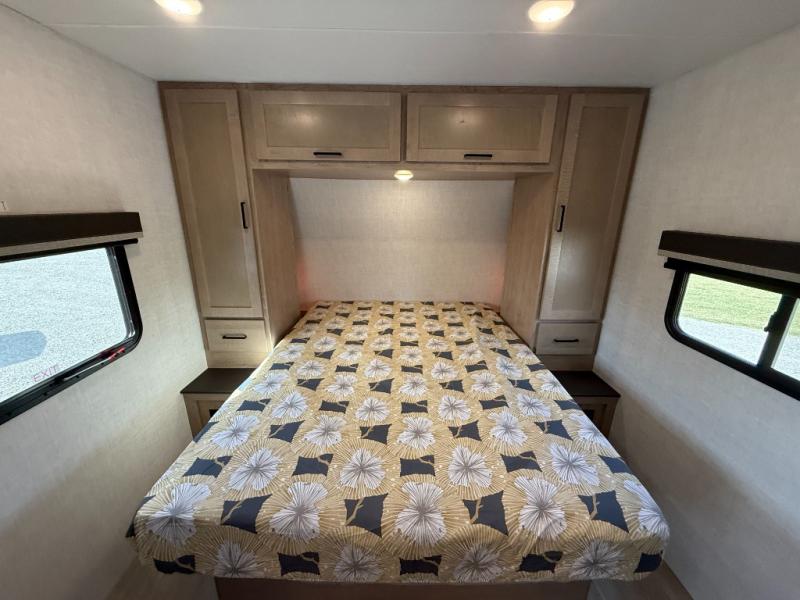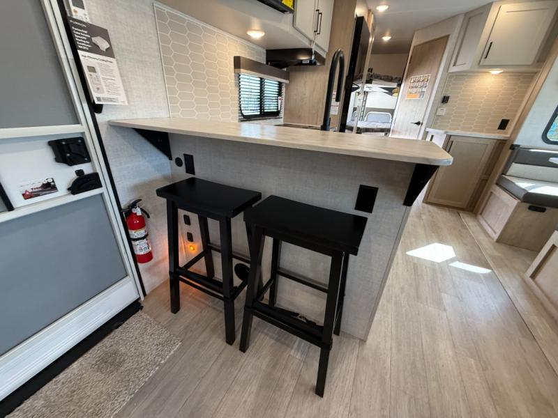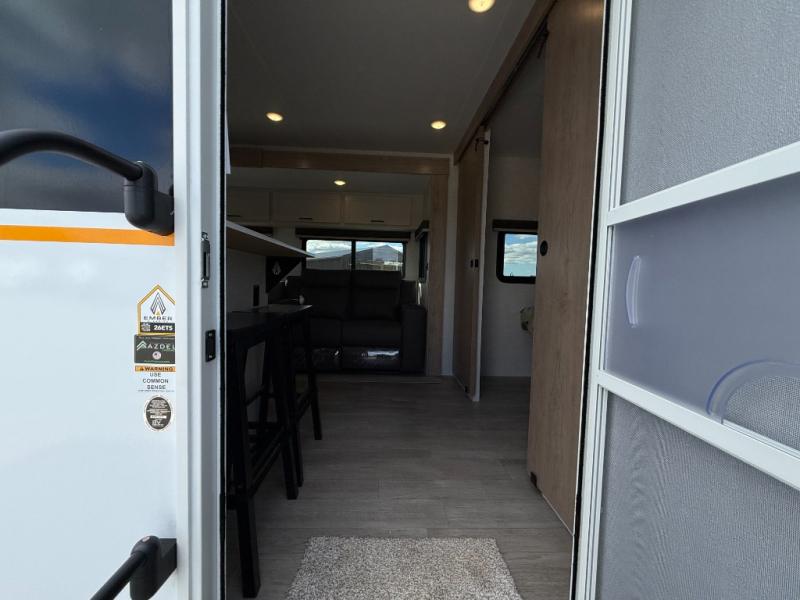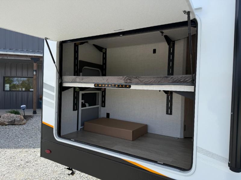 This model resembles 22ETS, but you'll enjoy added theater seating and a larger exterior length for more interior space! The patent-pending repositionable EmberTrack E-Track bunk/storage system includes 74" x 45" cargo space, and there are multiple single/double bunk configurations to fit your needs. The front walk-around true residential queen bed includes dual nightstands and dual wardrobes, and you'll appreciate sliding doors that makes a private bedroom. This E-Series kitchen includes an air fryer convection microwave, a two burner cooktop, plus a breakfast bar with bar stools so you can visit with the chef as they cook meals. A legless dinette will provide a place to dine, or you can take your plate outdoors to sit under the 18' power awning with a dimmable LED light. You'll also find a pass-through storage outside, along with a docking station and a kayak/bike storage door!