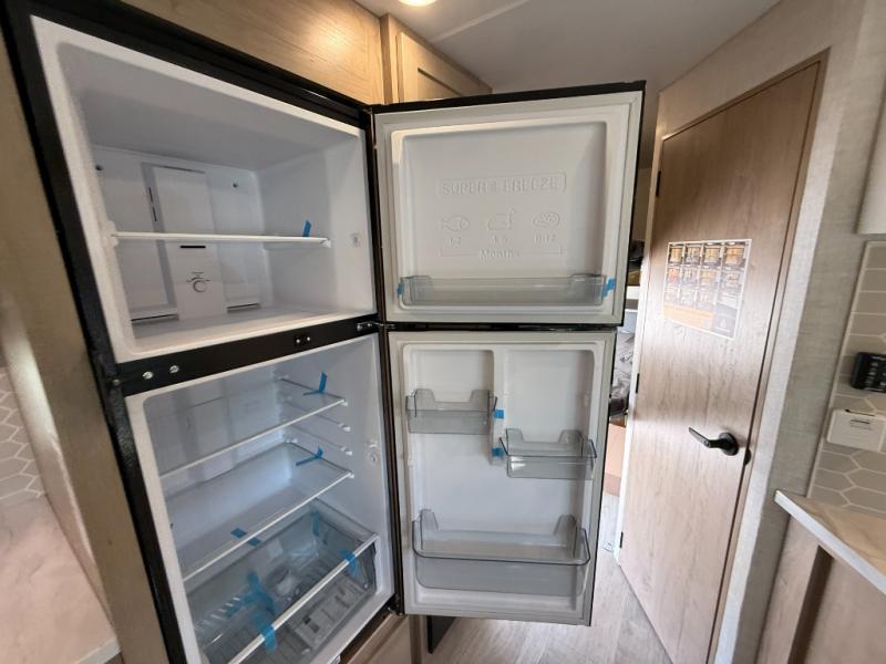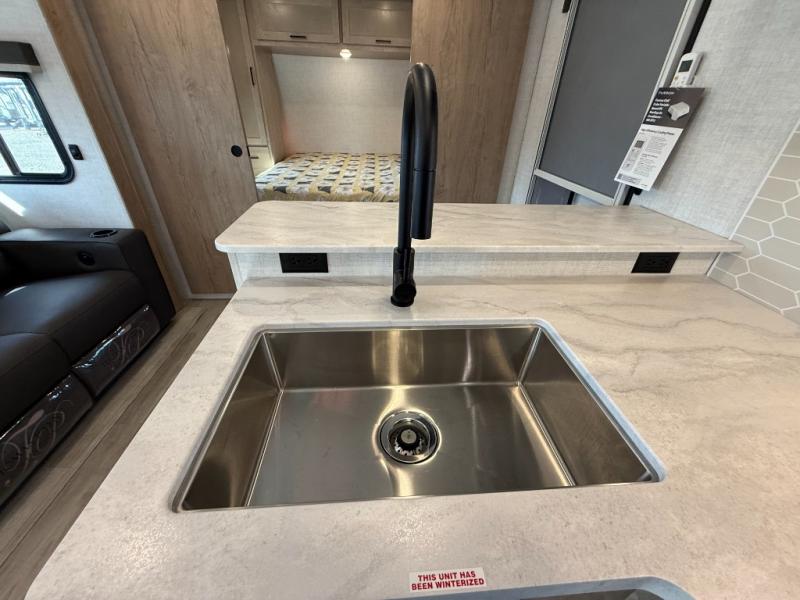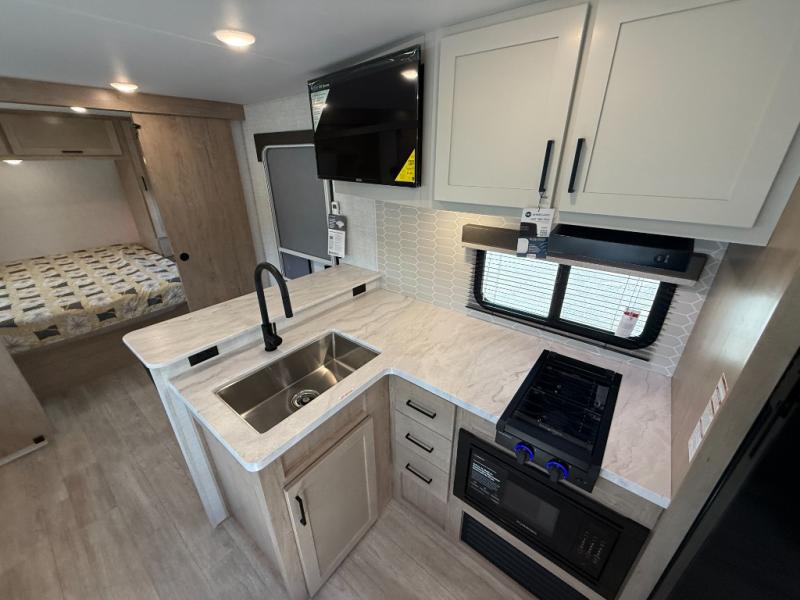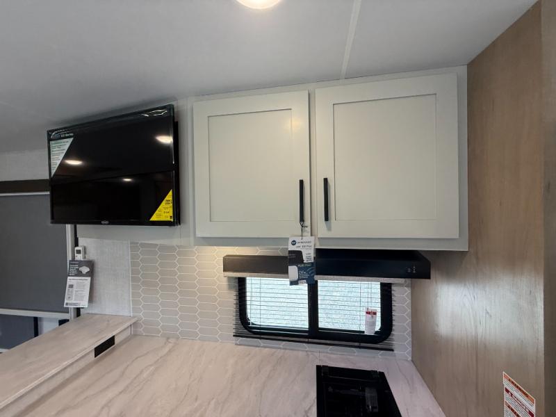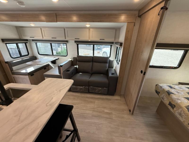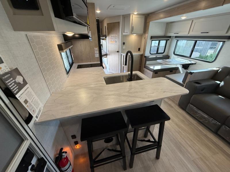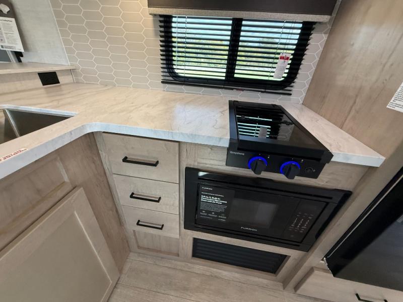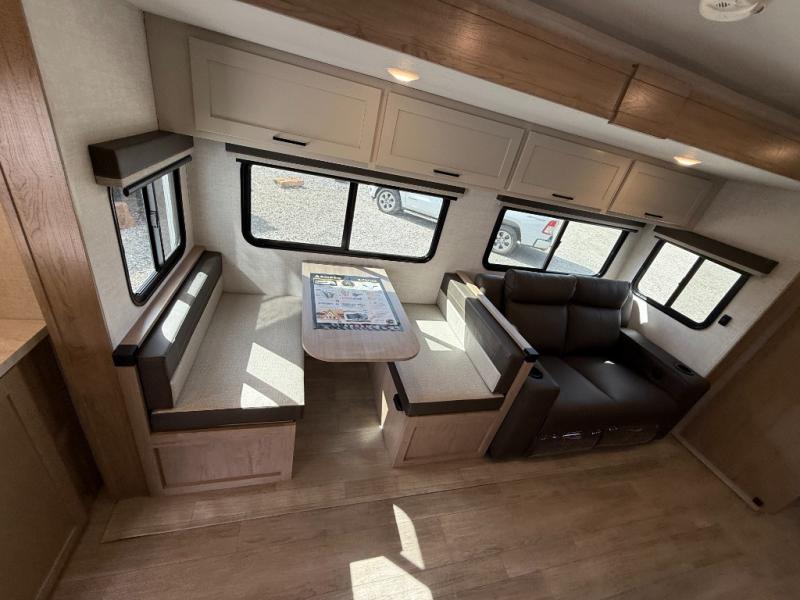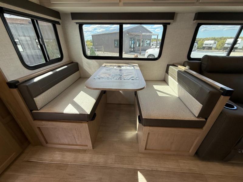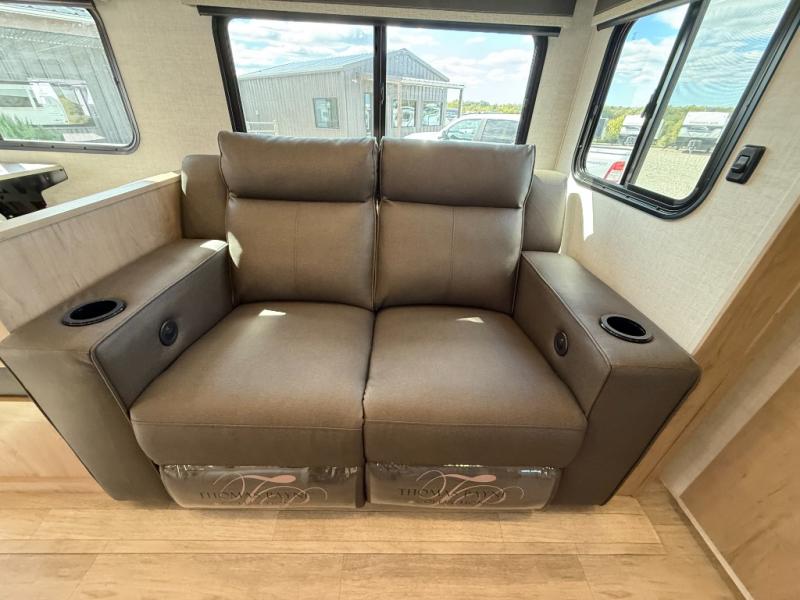 This model resembles 22ETS, but you'll enjoy added theater seating and a larger exterior length for more interior space! The patent-pending repositionable EmberTrack E-Track bunk/storage system includes 74" x 45" cargo space, and there are multiple single/double bunk configurations to fit your needs. The front walk-around true residential queen bed includes dual nightstands and dual wardrobes, and you'll appreciate sliding doors that makes a private bedroom. This E-Series kitchen includes an air fryer convection microwave, a two burner cooktop, plus a breakfast bar with bar stools so you can visit with the chef as they cook meals. A legless dinette will provide a place to dine, or you can take your plate outdoors to sit under the 18' power awning with a dimmable LED light. You'll also find a pass-through storage outside, along with a docking station and a kayak/bike storage door!