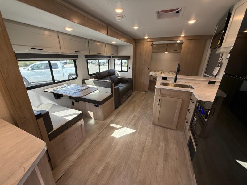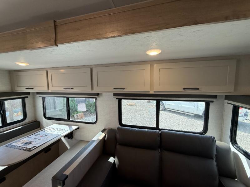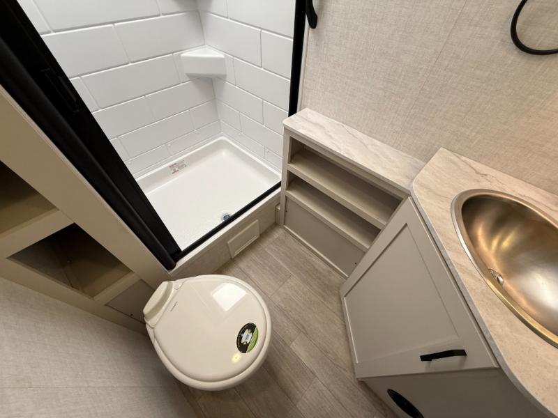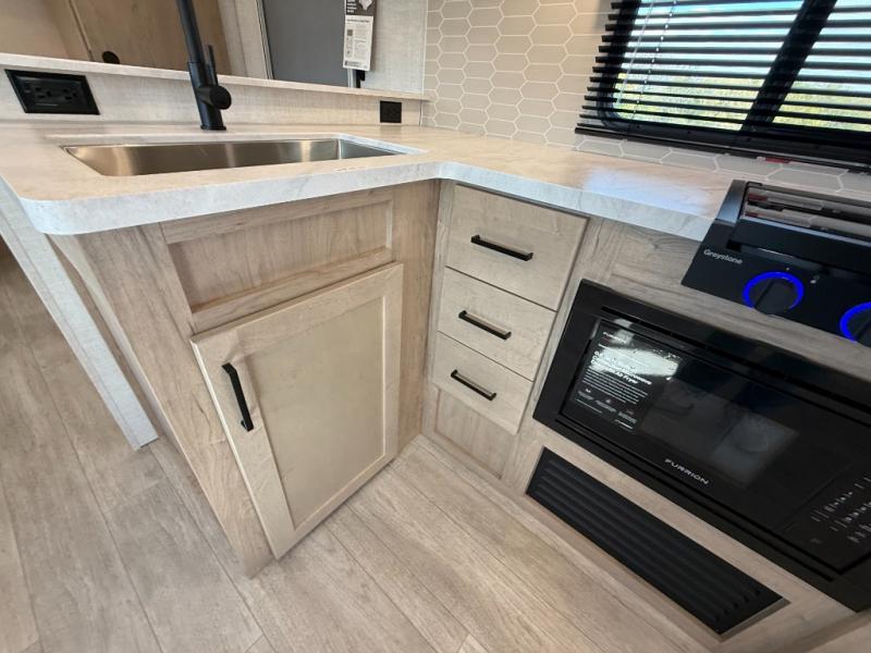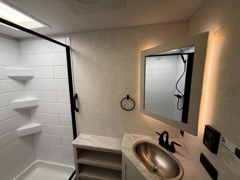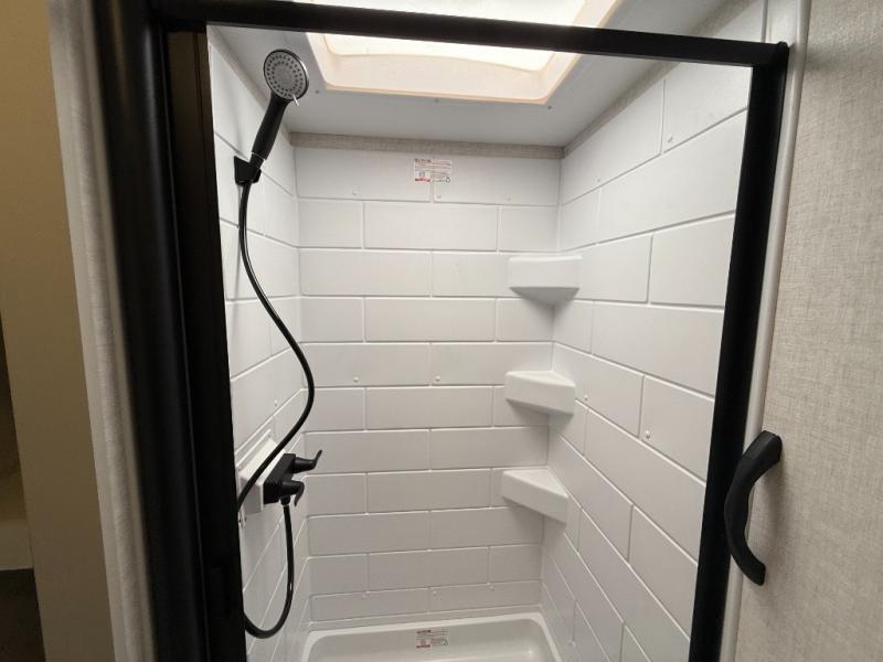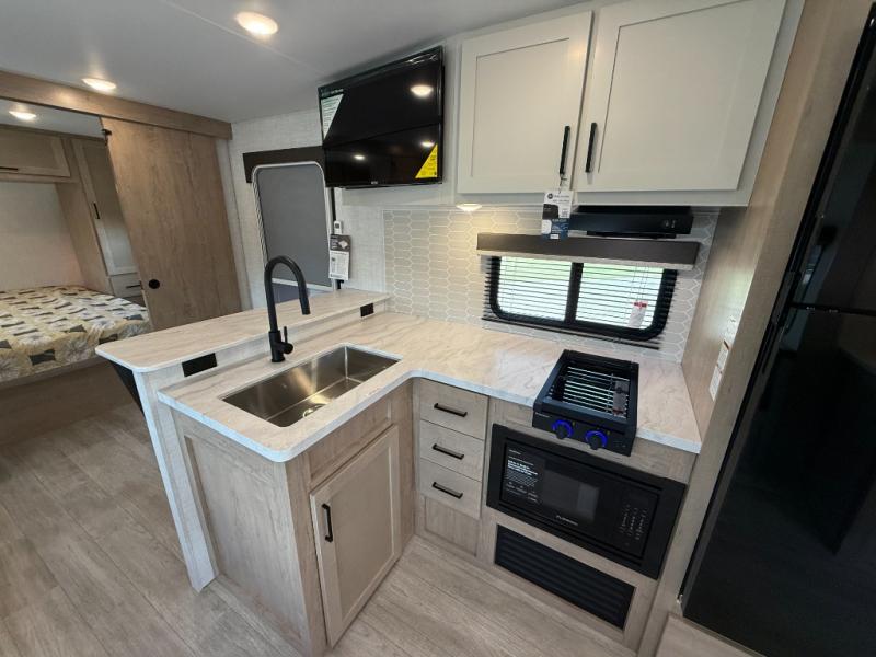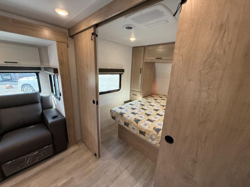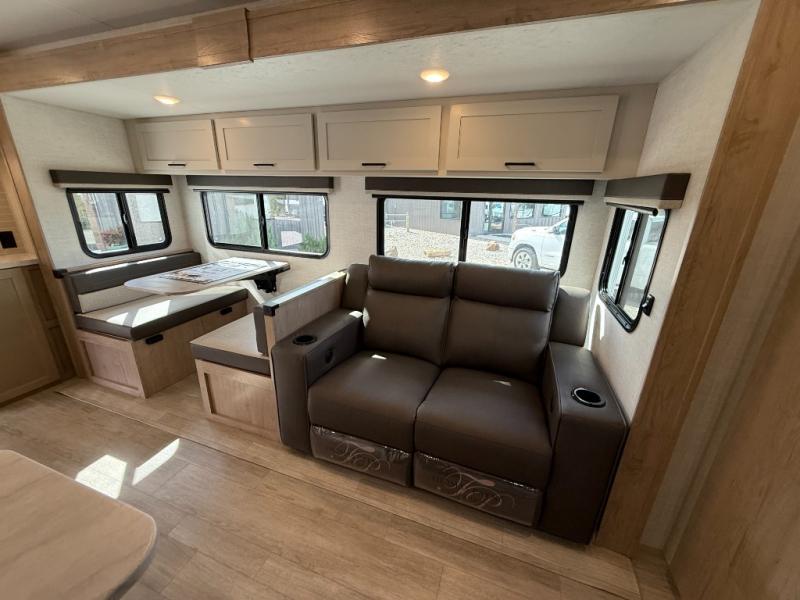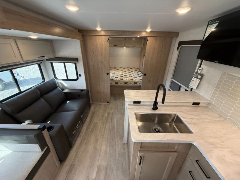 This model resembles 22ETS, but you'll enjoy added theater seating and a larger exterior length for more interior space! The patent-pending repositionable EmberTrack E-Track bunk/storage system includes 74" x 45" cargo space, and there are multiple single/double bunk configurations to fit your needs. The front walk-around true residential queen bed includes dual nightstands and dual wardrobes, and you'll appreciate sliding doors that makes a private bedroom. This E-Series kitchen includes an air fryer convection microwave, a two burner cooktop, plus a breakfast bar with bar stools so you can visit with the chef as they cook meals. A legless dinette will provide a place to dine, or you can take your plate outdoors to sit under the 18' power awning with a dimmable LED light. You'll also find a pass-through storage outside, along with a docking station and a kayak/bike storage door!