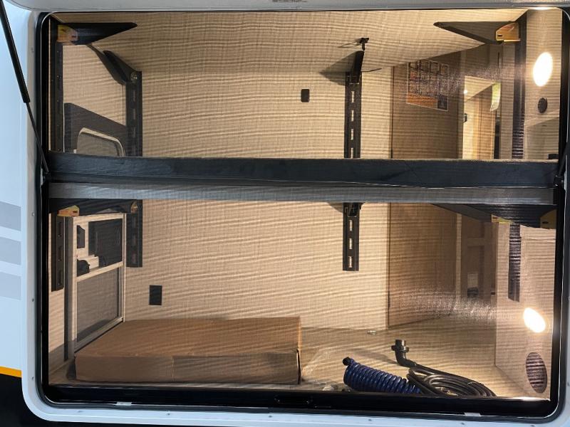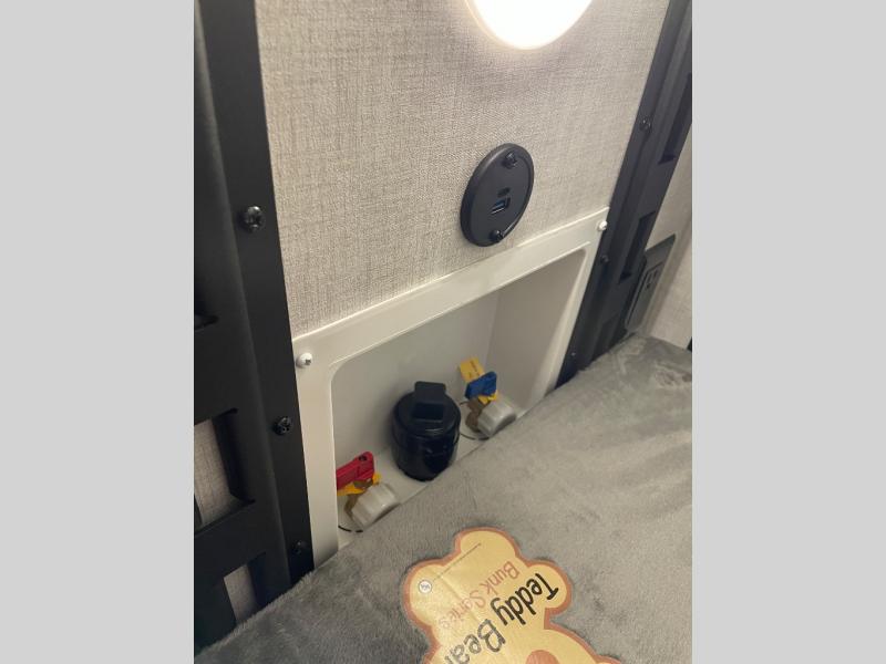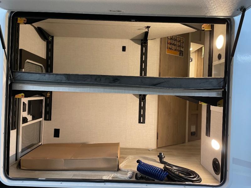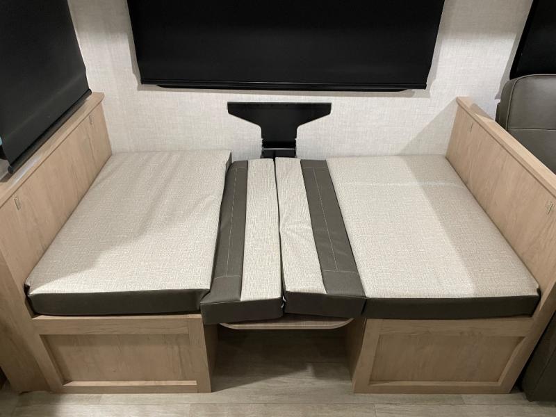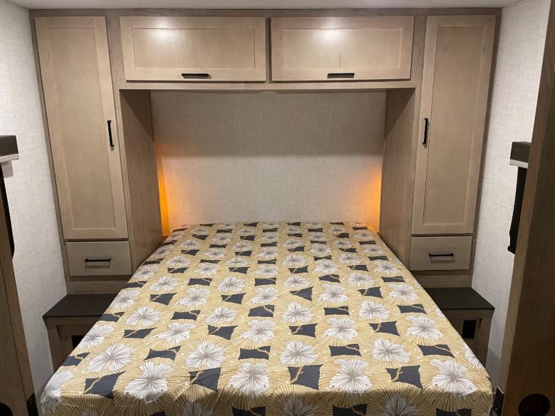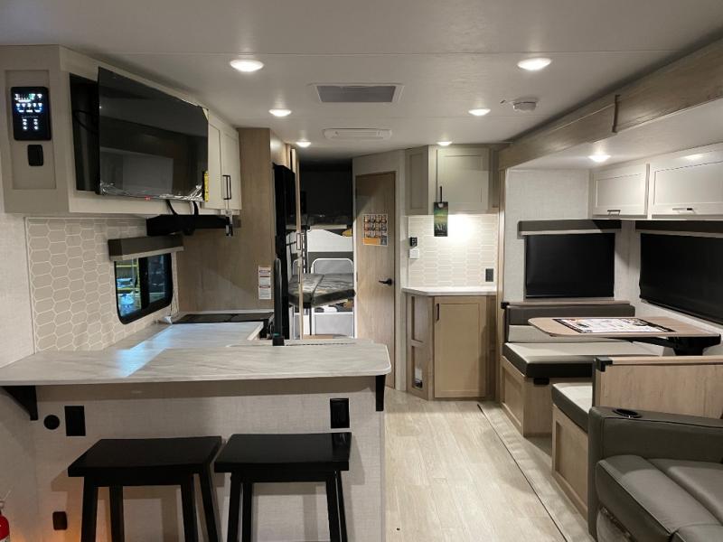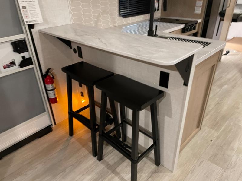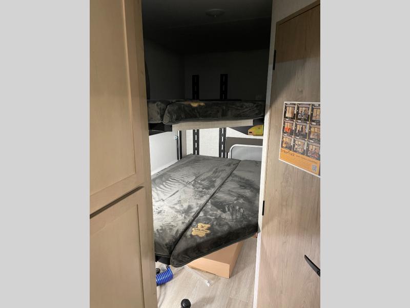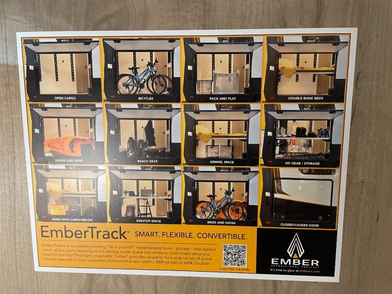 This model resembles 22ETS, but you'll enjoy added theater seating and a larger exterior length for more interior space! The patent-pending repositionable EmberTrack E-Track bunk/storage system includes 74" x 45" cargo space, and there are multiple single/double bunk configurations to fit your needs. The front walk-around true residential queen bed includes dual nightstands and dual wardrobes, and you'll appreciate sliding doors that makes a private bedroom. This E-Series kitchen includes an air fryer convection microwave, a two burner cooktop, plus a breakfast bar with bar stools so you can visit with the chef as they cook meals. A legless dinette will provide a place to dine, or you can take your plate outdoors to sit under the 18' power awning with a dimmable LED light. You'll also find a pass-through storage outside, along with a docking station and a kayak/bike storage door!