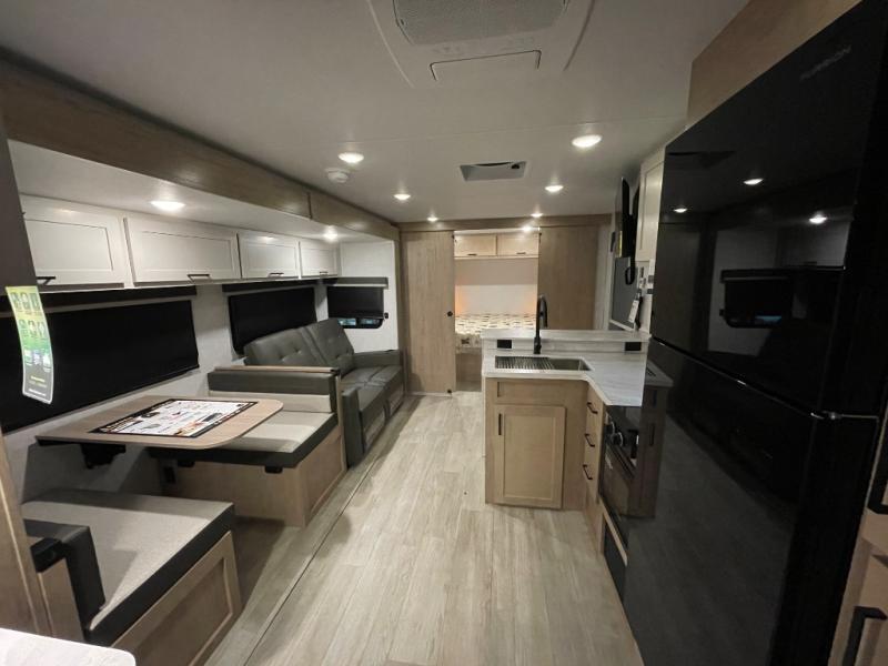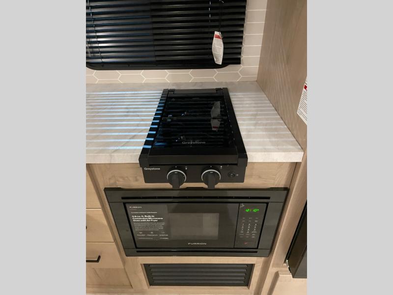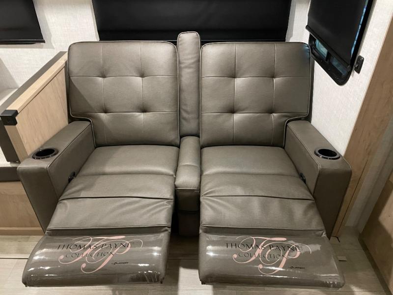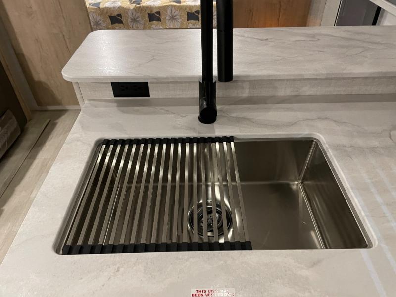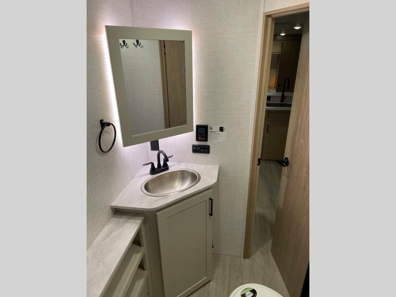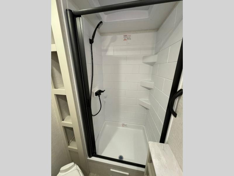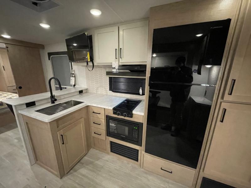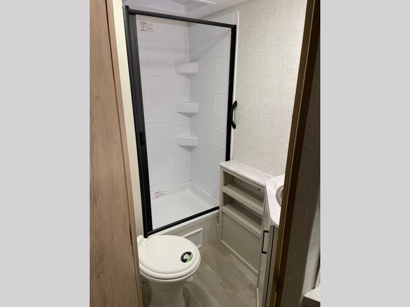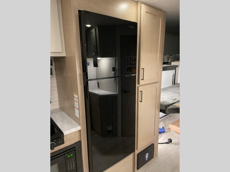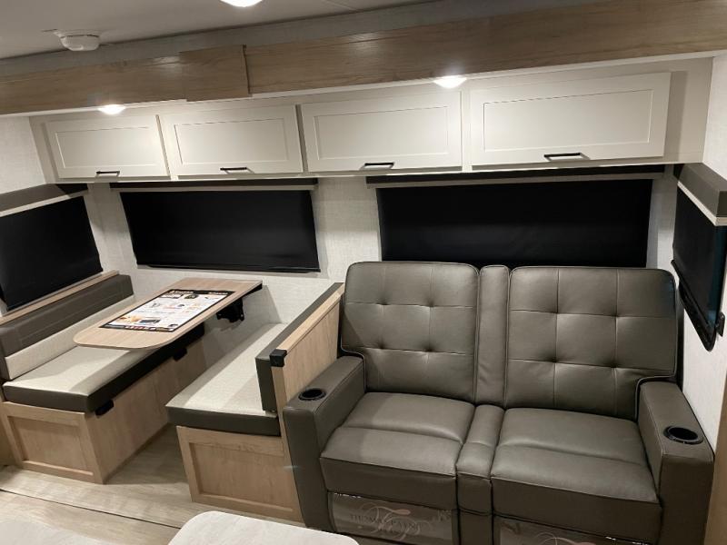 This model resembles 22ETS, but you'll enjoy added theater seating and a larger exterior length for more interior space! The patent-pending repositionable EmberTrack E-Track bunk/storage system includes 74" x 45" cargo space, and there are multiple single/double bunk configurations to fit your needs. The front walk-around true residential queen bed includes dual nightstands and dual wardrobes, and you'll appreciate sliding doors that makes a private bedroom. This E-Series kitchen includes an air fryer convection microwave, a two burner cooktop, plus a breakfast bar with bar stools so you can visit with the chef as they cook meals. A legless dinette will provide a place to dine, or you can take your plate outdoors to sit under the 18' power awning with a dimmable LED light. You'll also find a pass-through storage outside, along with a docking station and a kayak/bike storage door!