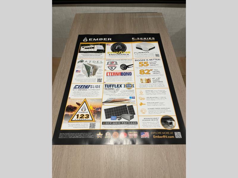 With any E-Series travel trailer by Ember RV you will enjoy a lightweight RV with all the "Essentials" needed for memorable trips in the great outdoors! Each model is constructed with durable laminated Azdel Onboard composite walls, a full walkable roof with a one-piece Tufflex PVC roofing material, and a gel-coated fiberglass exterior. The Dexter axles with E-Z lube hubs and forward self-adjusting electric brakes plus Goodyear Endurance tires will provide a smooth tow from home to campground. You will appreciate the Congoleum DiamondFlor "carpetless" interior that is easy to clean, and the hardwood framed cabinet doors will create a more residential feel. Each model includes a tankless on-demand water heater for endless hot showers and an 18,000 BTU Max Cool "Whisper Quiet" A/C, which is the largest single A/C in its class! An EmberLink Smart RV system will let you easily control features such as lights and slides and you can wash away those rainy day blues by watching the HDTV with a built-in Bluetooth AV system. If you're looking for off-grid capabilities, you might want to choose the optional Off-Grid Solar Package with 400 total watts of solar panels, a 2,000W Pure Sine wave inverter, and a Victron MPPT solar controller!