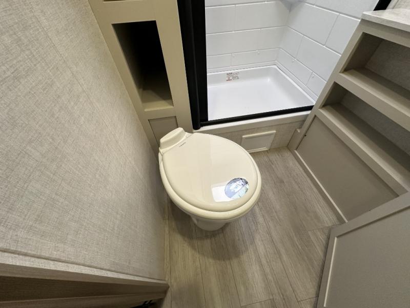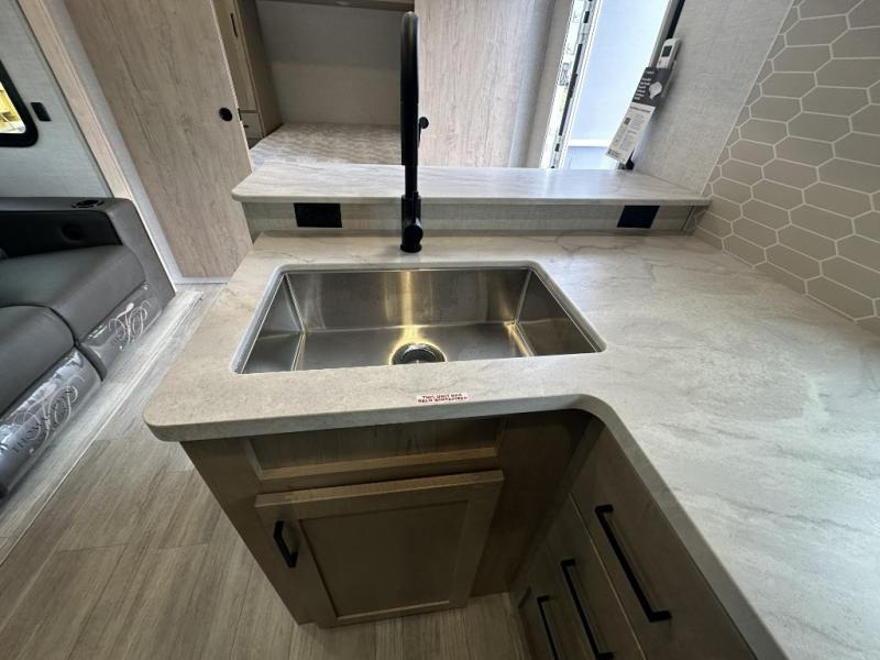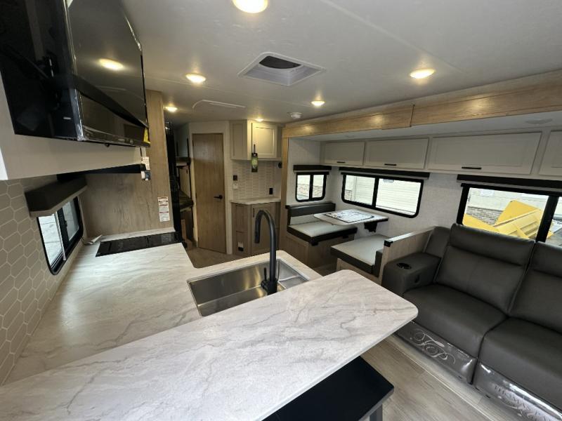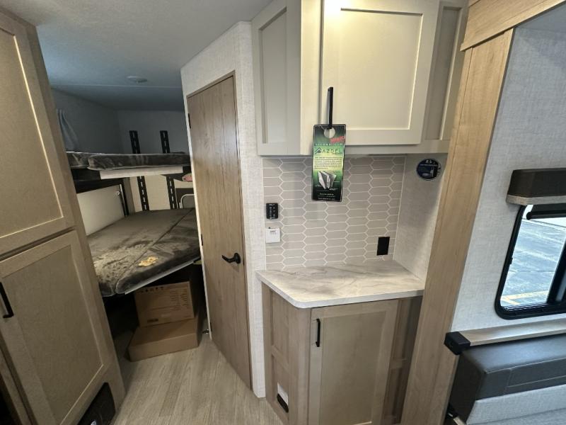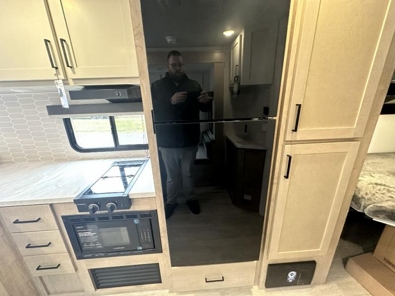 This model resembles 22ETS, but you'll enjoy added theater seating and a larger exterior length for more interior space! The patent-pending repositionable EmberTrack E-Track bunk/storage system includes 74" x 45" cargo space, and there are multiple single/double bunk configurations to fit your needs. The front walk-around true residential queen bed includes dual nightstands and dual wardrobes, and you'll appreciate sliding doors that makes a private bedroom. This E-Series kitchen includes an air fryer convection microwave, a two burner cooktop, plus a breakfast bar with bar stools so you can visit with the chef as they cook meals. A legless dinette will provide a place to dine, or you can take your plate outdoors to sit under the 18' power awning with a dimmable LED light. You'll also find a pass-through storage outside, along with a docking station and a kayak/bike storage door!