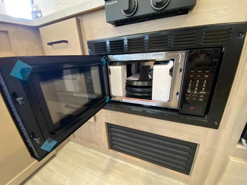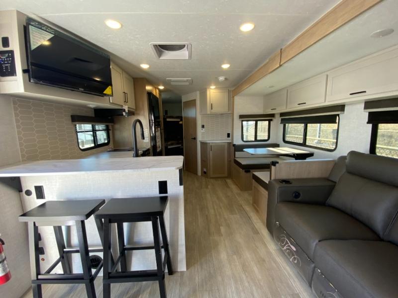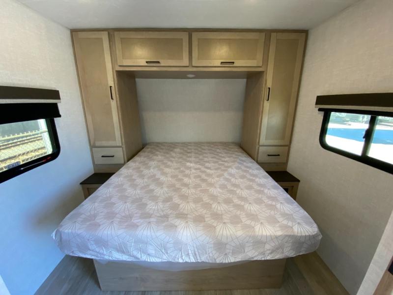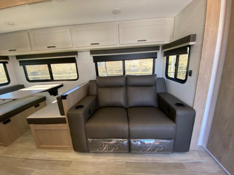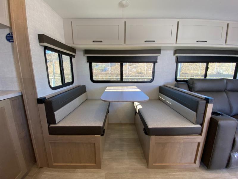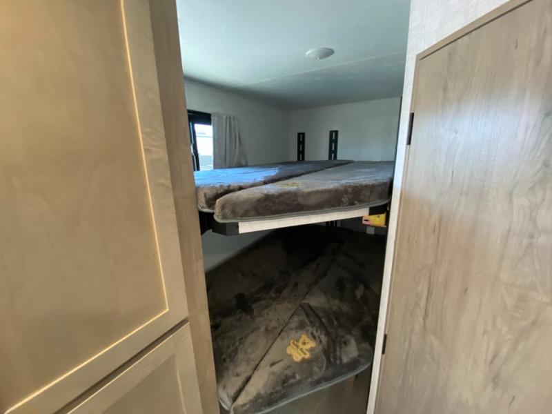 This model resembles 22ETS, but you'll enjoy added theater seating and a larger exterior length for more interior space! The patent-pending repositionable EmberTrack E-Track bunk/storage system includes 74" x 45" cargo space, and there are multiple single/double bunk configurations to fit your needs. The front walk-around true residential queen bed includes dual nightstands and dual wardrobes, and you'll appreciate sliding doors that makes a private bedroom. This E-Series kitchen includes an air fryer convection microwave, a two burner cooktop, plus a breakfast bar with bar stools so you can visit with the chef as they cook meals. A legless dinette will provide a place to dine, or you can take your plate outdoors to sit under the 18' power awning with a dimmable LED light. You'll also find a pass-through storage outside, along with a docking station and a kayak/bike storage door!