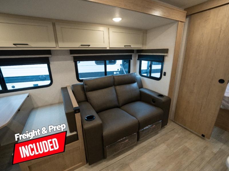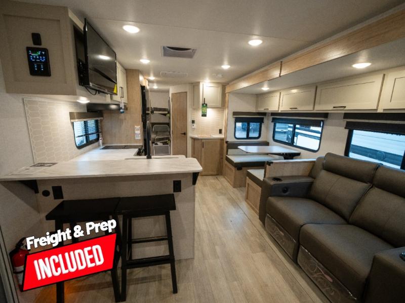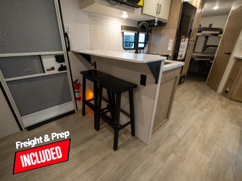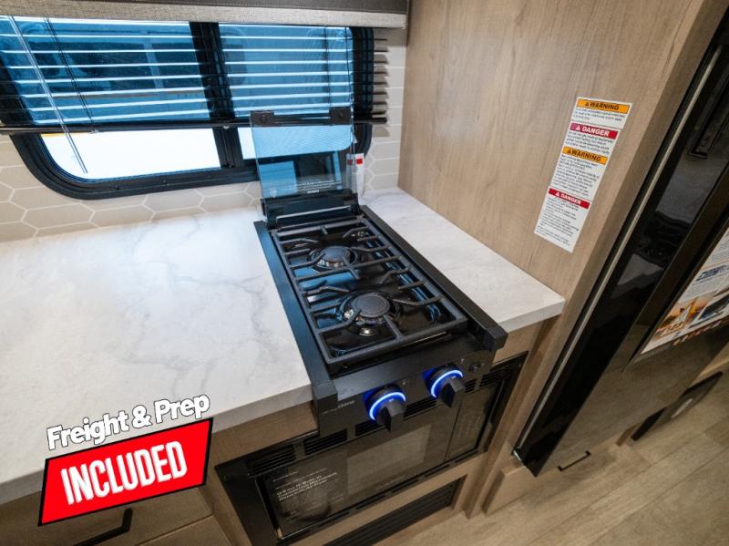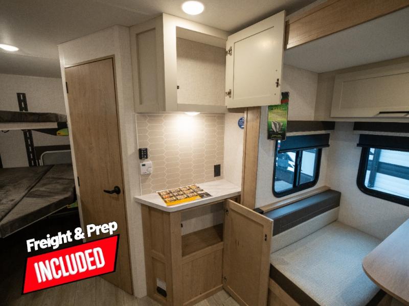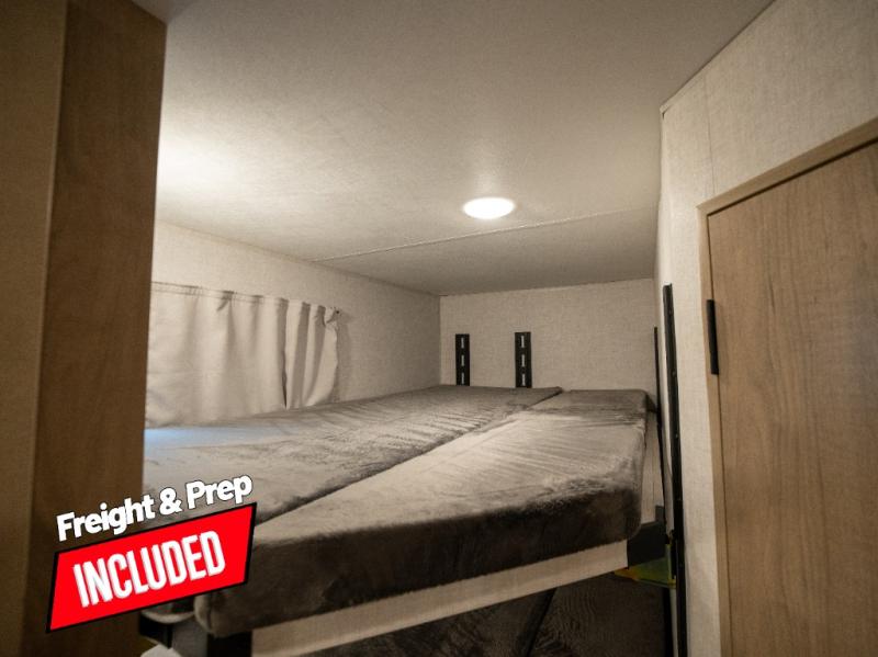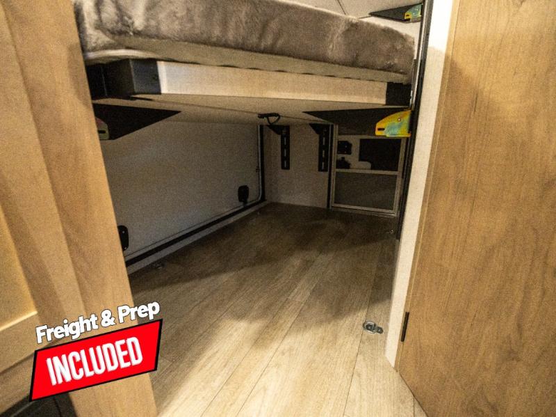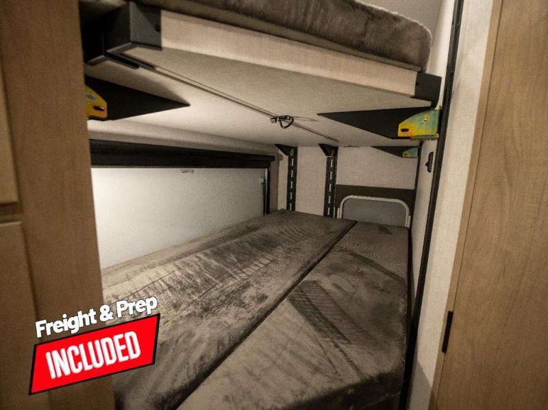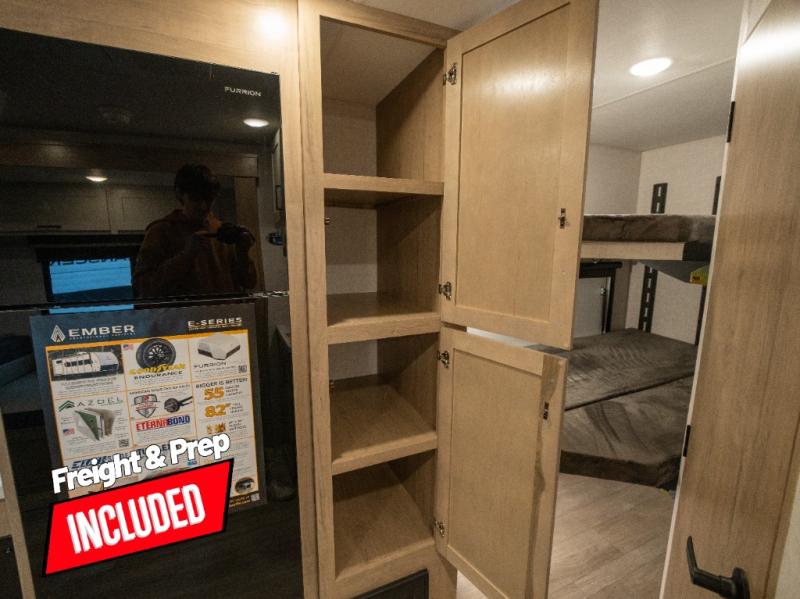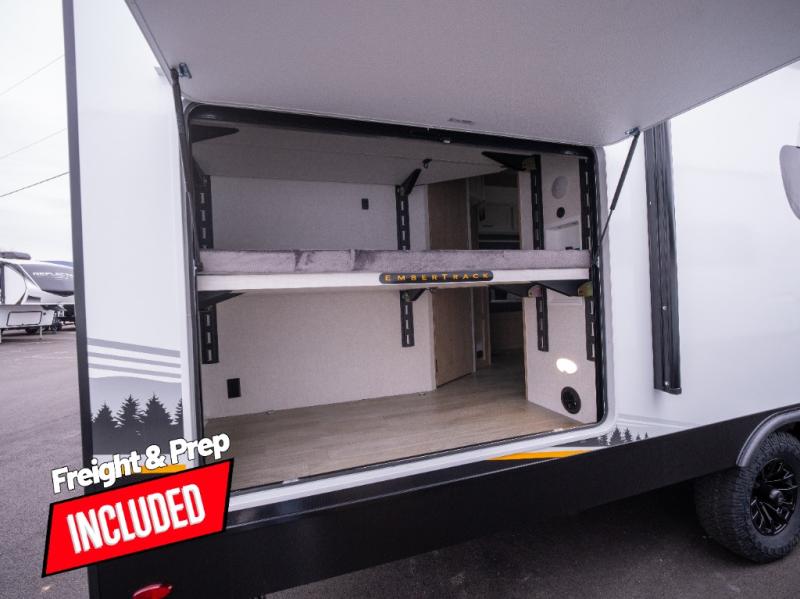 This model resembles 22ETS, but you'll enjoy added theater seating and a larger exterior length for more interior space! The repositionable EmberTrack E-Track bunk/storage system includes 74" x 46" cargo space, and there are multiple single/double bunk configurations to fit your needs. The front walk-around residential queen bed or optional Murphy bed includes dual nightstands and dual wardrobes, and you'll appreciate sliding doors that makes a private bedroom. This E-Series kitchen includes an air fryer convection microwave, a two-burner cooktop, plus a breakfast bar with bar stools so you can visit with the chef as they cook meals. A legless dinette will provide a place to dine, or you can take your plate outdoors to sit under the 18' power awning with a dimmable LED light. You'll also find a pass-through storage outside, along with a docking station and a kayak/bike storage door!