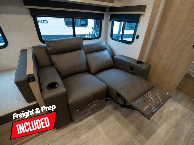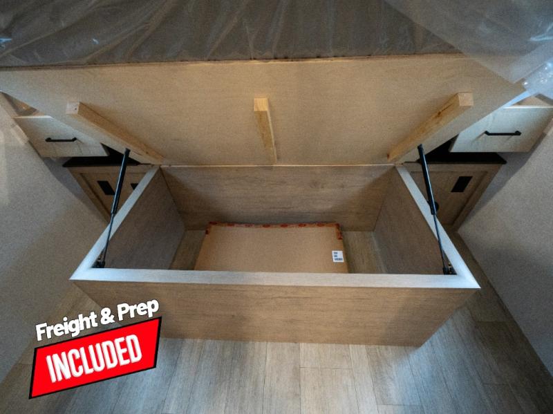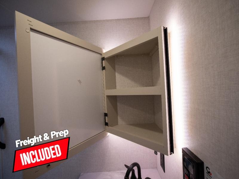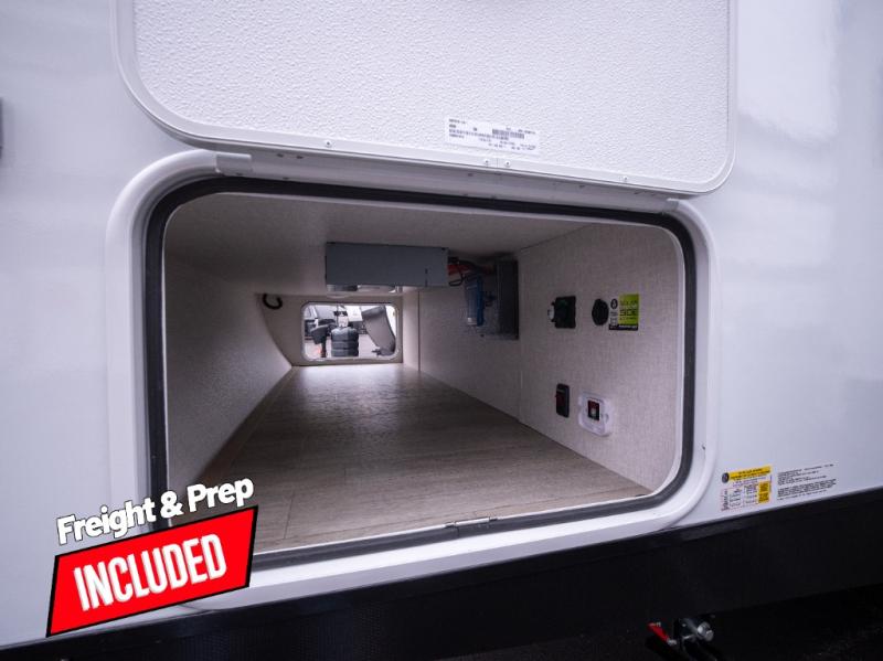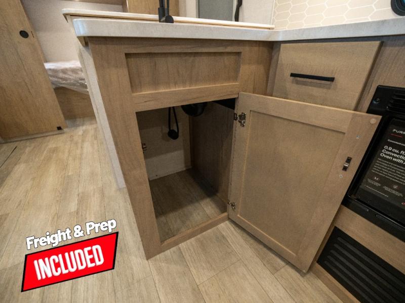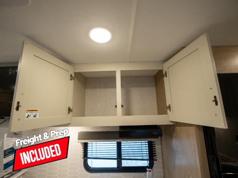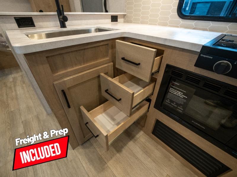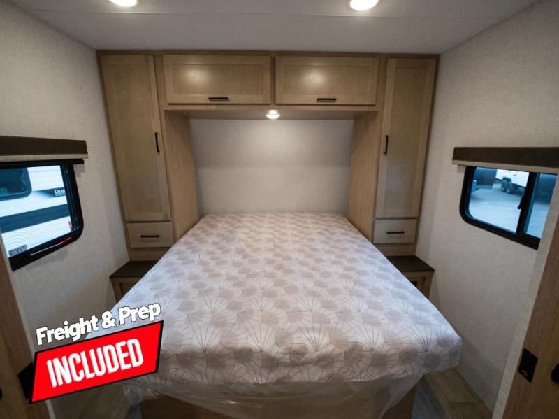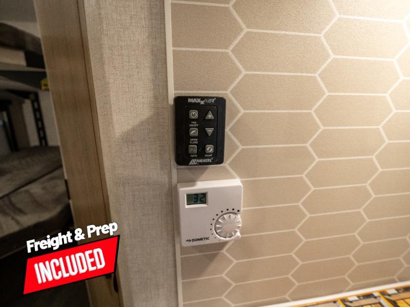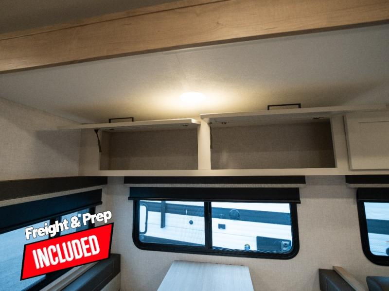 This model resembles 22ETS, but you'll enjoy added theater seating and a larger exterior length for more interior space! The repositionable EmberTrack E-Track bunk/storage system includes 74" x 46" cargo space, and there are multiple single/double bunk configurations to fit your needs. The front walk-around residential queen bed or optional Murphy bed includes dual nightstands and dual wardrobes, and you'll appreciate sliding doors that makes a private bedroom. This E-Series kitchen includes an air fryer convection microwave, a two-burner cooktop, plus a breakfast bar with bar stools so you can visit with the chef as they cook meals. A legless dinette will provide a place to dine, or you can take your plate outdoors to sit under the 18' power awning with a dimmable LED light. You'll also find a pass-through storage outside, along with a docking station and a kayak/bike storage door!