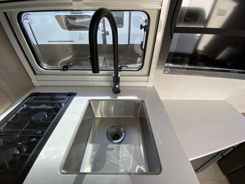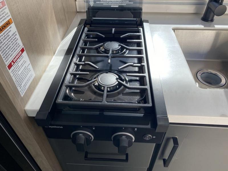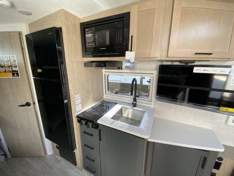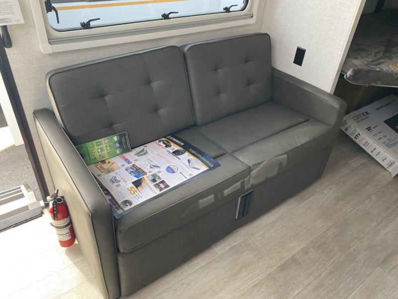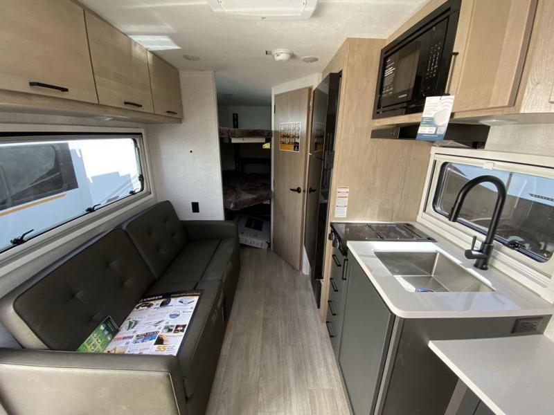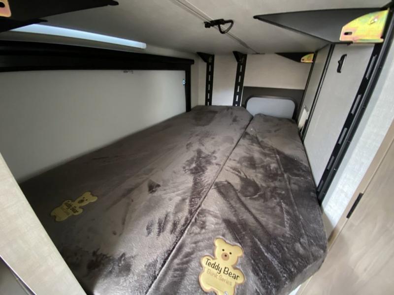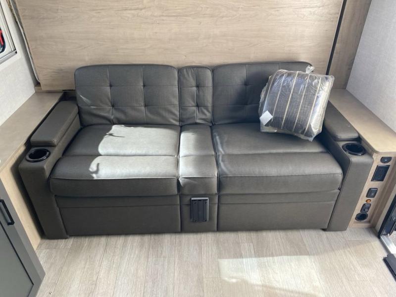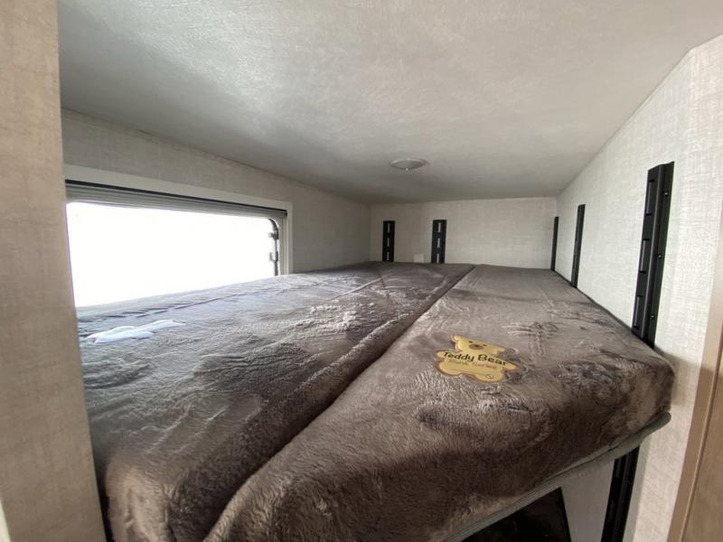 This unique travel trailer offers versatile living! Starting with the front Murphy bed that has a 60" x 80" queen bed to lay your head on at night and can convert into a sofa for seating during the day with a nightstand and a 12V HDTV/AV system to watch your favorite movies in bed. Create your best home cooked meals with the dual burner cooktop and 12V refrigerator then enjoy them at the jackknife sofa with a removable table. There is a second removable table that can be used by the Murphy bed/sofa. The repositionable Embertack E-track bunk/storage system has a 74" x 46" cargo space for your items and a storage locker door to access them from the exterior. You can enjoy twin bunks or convert them to double-size bunks to sleep two to four. The exterior also features a kayak/bike storage door, front pass-through storage area, and a 2" accessory receiver!