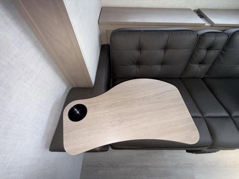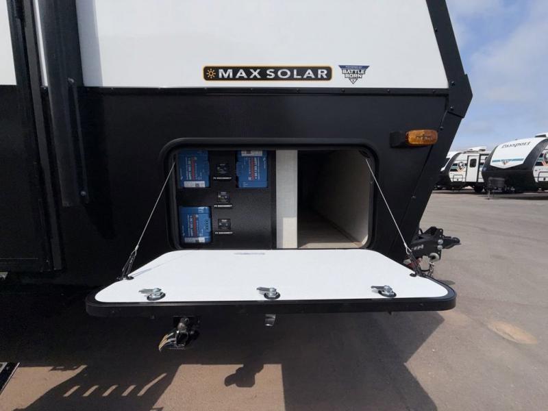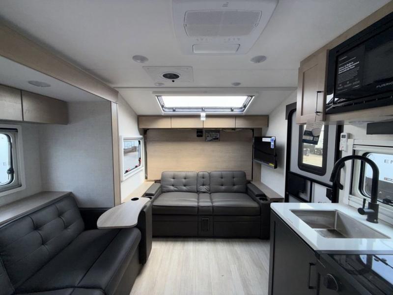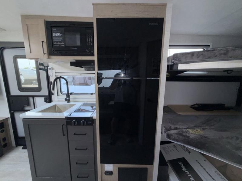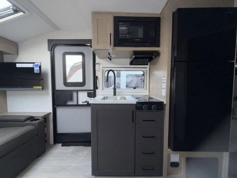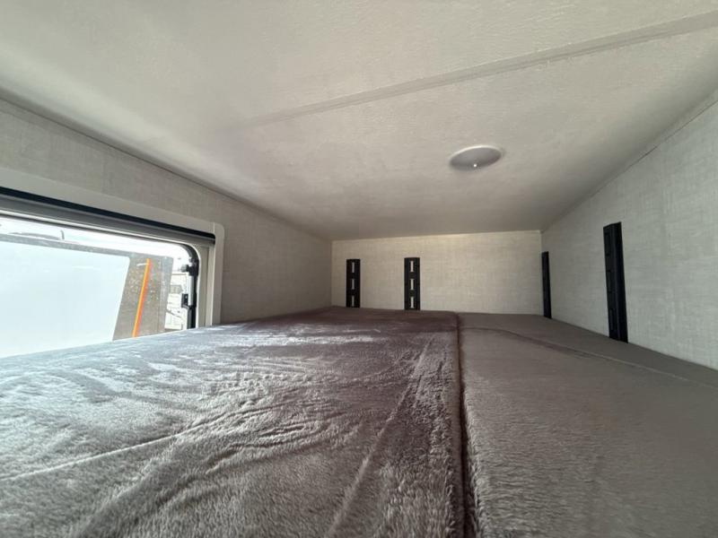 This unique travel trailer offers versatile living! Starting with the front Murphy bed that has a 60" x 80" queen bed to lay your head on at night and can convert into a sofa for seating during the day with a nightstand and a 12V HDTV/AV system to watch your favorite movies in bed. Create your best home cooked meals with the dual burner cooktop and 12V refrigerator then enjoy them at the jackknife sofa with a removable table. There is a second removable table that can be used by the Murphy bed/sofa. The repositionable Embertack E-track bunk/storage system has a 74" x 46" cargo space for your items and a storage locker door to access them from the exterior. You can enjoy twin bunks or convert them to double-size bunks to sleep two to four. The exterior also features a kayak/bike storage door, front pass-through storage area, and a 2" accessory receiver!