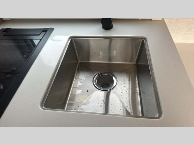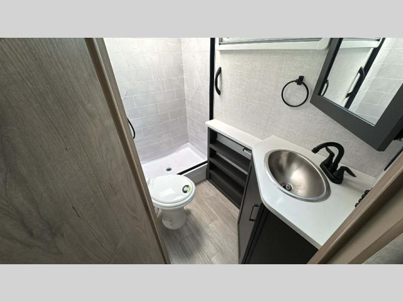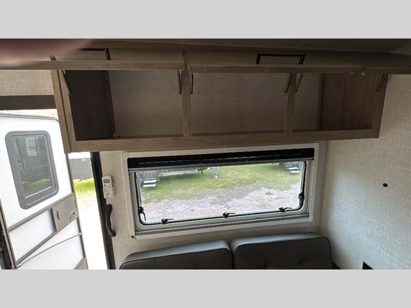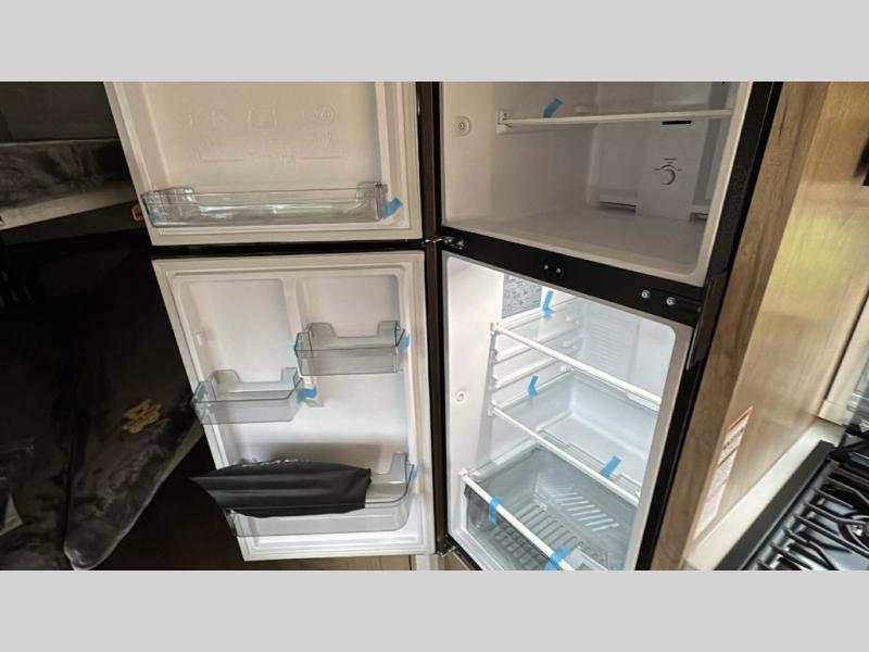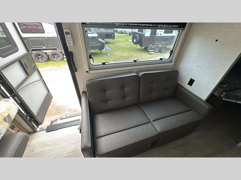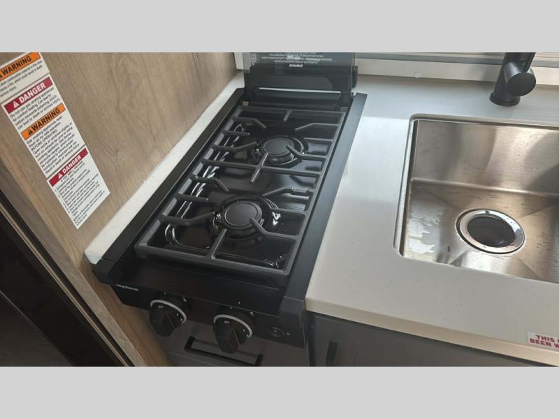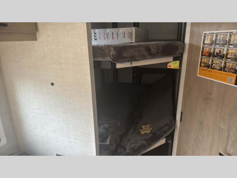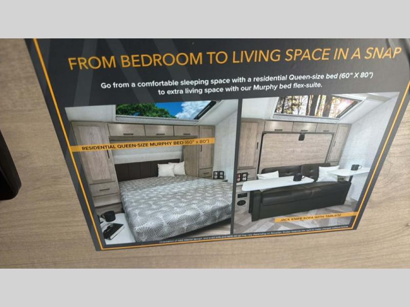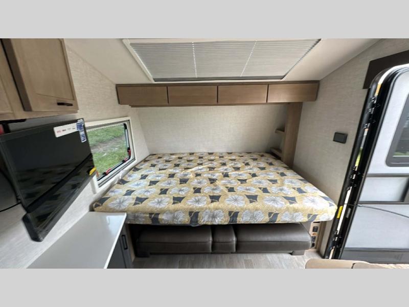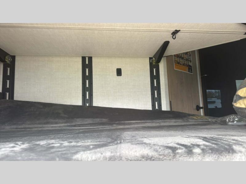 This unique travel trailer offers versatile living! Starting with the front Murphy bed that has a 60" x 80" queen bed to lay your head on at night and can convert into a sofa for seating during the day with a nightstand and a 12V HDTV/AV system to watch your favorite movies in bed. Create your best home cooked meals with the dual burner cooktop and 12V refrigerator then enjoy them at the jackknife sofa with a removable table. There is a second removable table that can be used by the Murphy bed/sofa. The repositionable Embertack E-track bunk/storage system has a 74" x 46" cargo space for your items and a storage locker door to access them from the exterior. You can enjoy twin bunks or convert them to double-size bunks to sleep two to four. The exterior also features a kayak/bike storage door, front pass-through storage area, and a 2" accessory receiver!