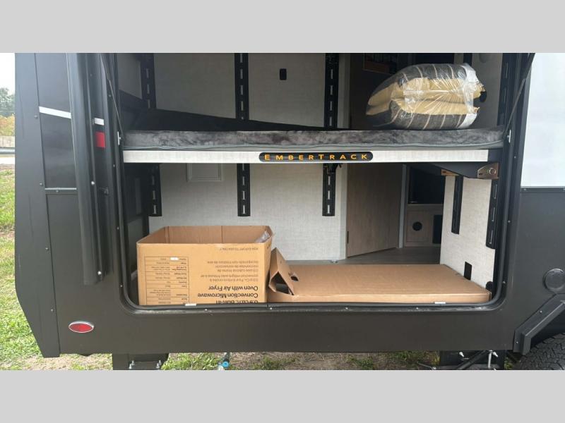 Each one of these Ember RV Overland Series travel trailers and toy hauler were built to meet the needs of today's most discerning RVers with layouts to fit couples and families! The CURT independent suspension comes with heavy-duty coil springs with dual shock absorbers on each wheel, and the 5-sided aluminum frame construction is sure to hold up through whatever adventure you throw its way. Laminated Azdel Onboard composite walls and rooftop prevent rotting or molding of the unit. Their chic interior design comes with structural composite flooring that is durable and easy to clean, dual pane caravan windows with integrated thermal shades/screens for added privacy, and an EmberLink smart RV control system to use at the touch of a finger. The Off-Grid Solar package lets you go further into the woods and the Safety First package helps you arrive safely to each destination.