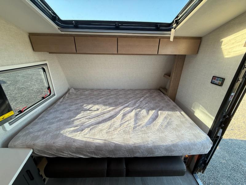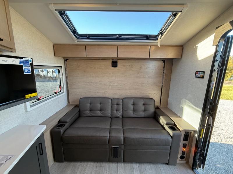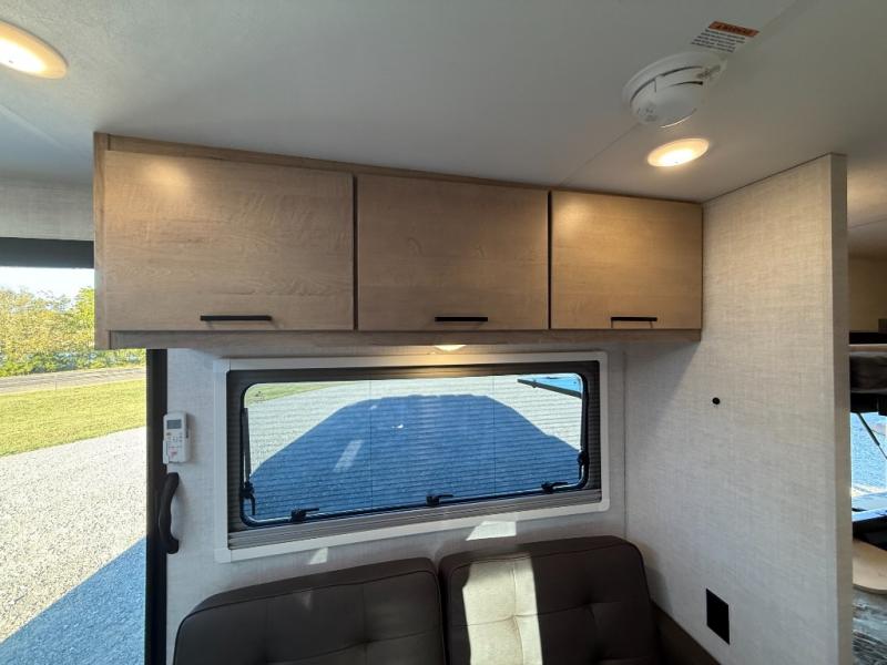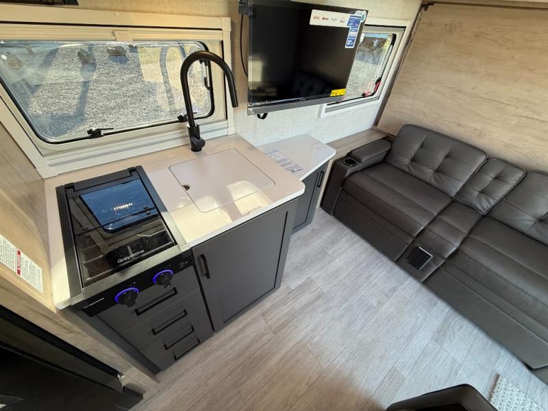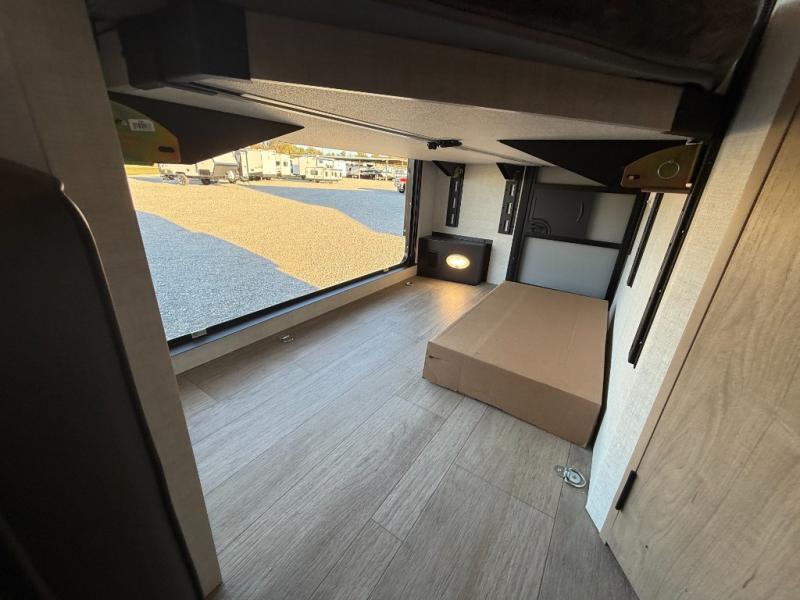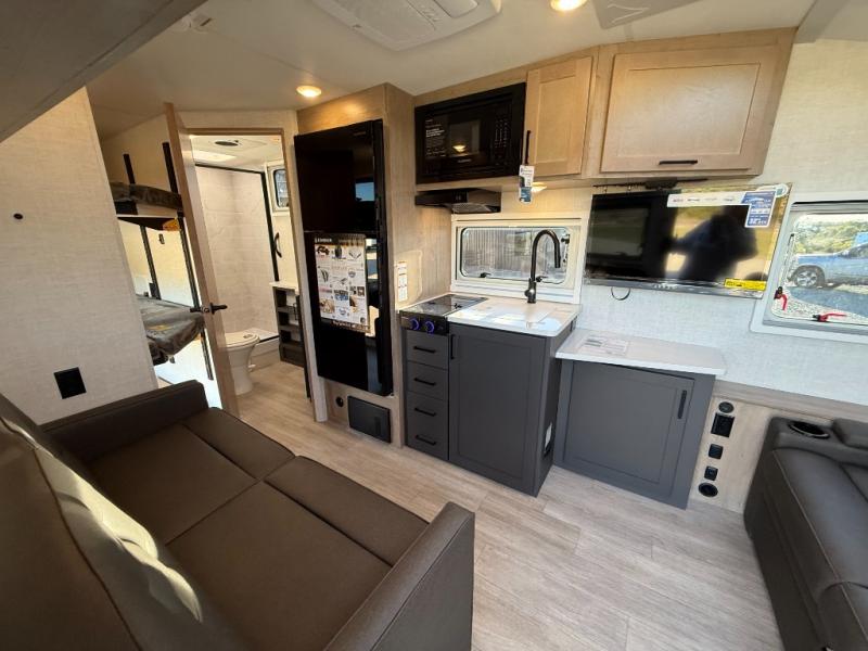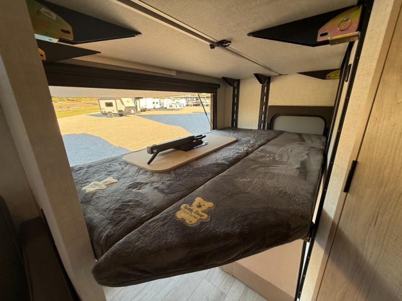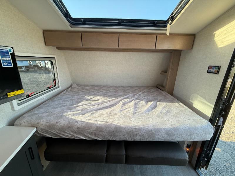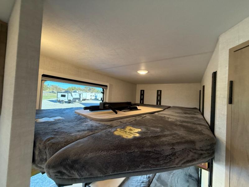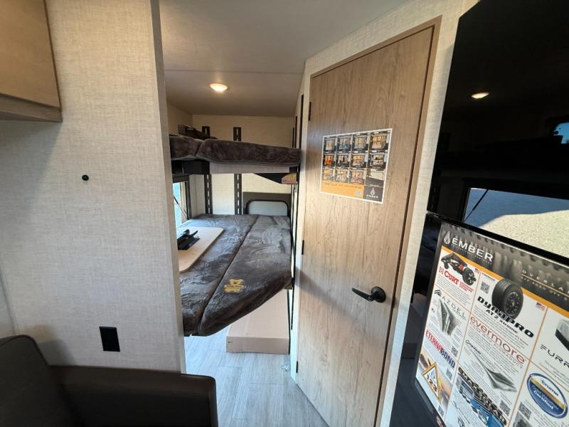 This unique travel trailer offers versatile living! Starting with the front Murphy bed that has a 60" x 80" queen bed to lay your head on at night and can convert into a sofa for seating during the day with a nightstand and a 12V HDTV/AV system to watch your favorite movies in bed. Create your best home cooked meals with the dual burner cooktop and 12V refrigerator then enjoy them at the jackknife sofa with a removable table. There is a second removable table that can be used by the Murphy bed/sofa. The repositionable Embertack E-track bunk/storage system has a 74" x 46" cargo space for your items and a storage locker door to access them from the exterior. You can enjoy twin bunks or convert them to double-size bunks to sleep two to four. The exterior also features a kayak/bike storage door, front pass-through storage area, and a 2" accessory receiver!