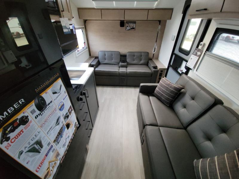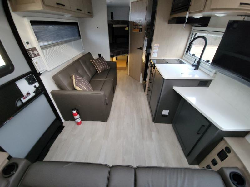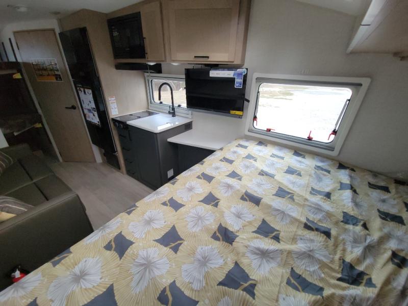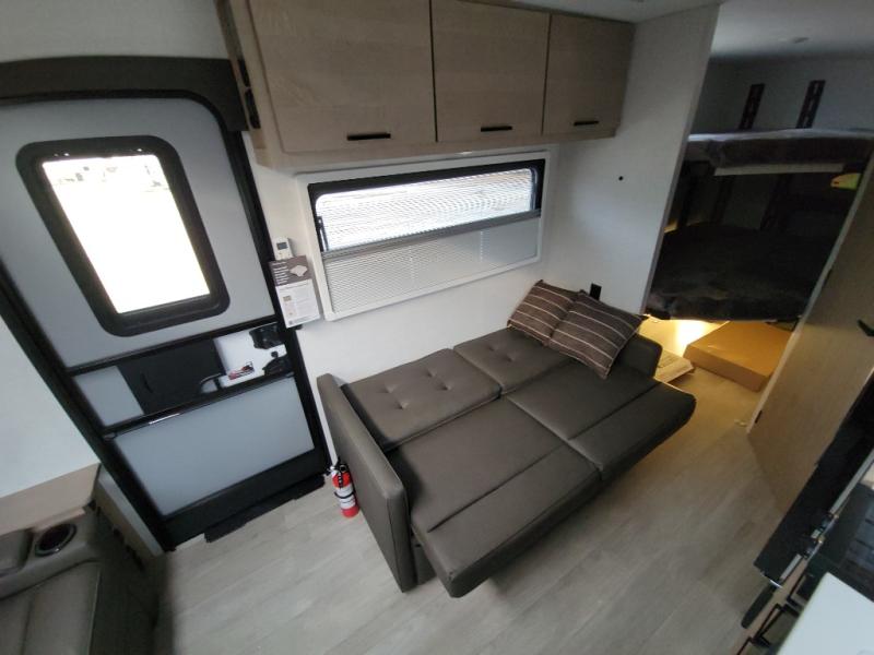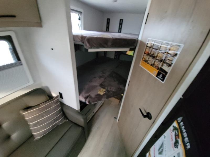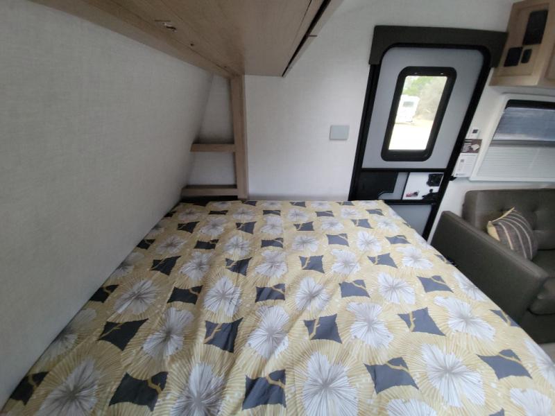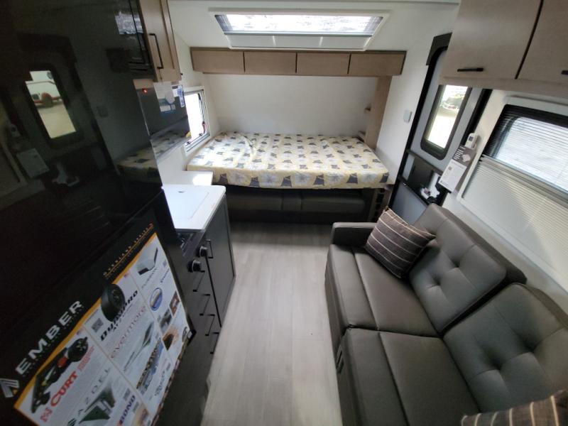 This unique travel trailer offers versatile living! Starting with the front Murphy bed that has a 60" x 80" queen bed to lay your head on at night and can convert into a sofa for seating during the day with a nightstand and a 12V HDTV/AV system to watch your favorite movies in bed. Create your best home cooked meals with the dual burner cooktop and 12V refrigerator then enjoy them at the jackknife sofa with a removable table. There is a second removable table that can be used by the Murphy bed/sofa. The repositionable Embertack E-track bunk/storage system has a 74" x 46" cargo space for your items and a storage locker door to access them from the exterior. You can enjoy twin bunks or convert them to double-size bunks to sleep two to four. The exterior also features a kayak/bike storage door, front pass-through storage area, and a 2" accessory receiver!