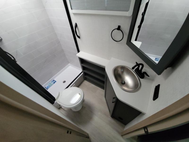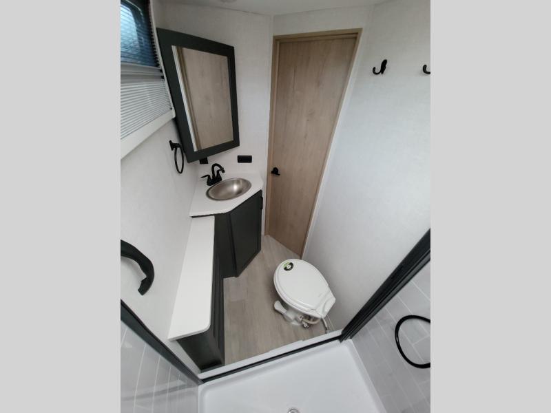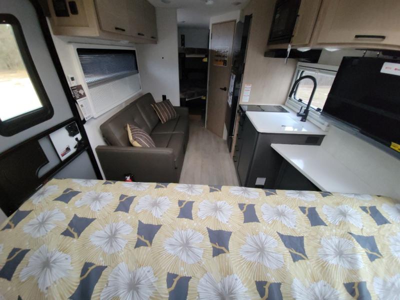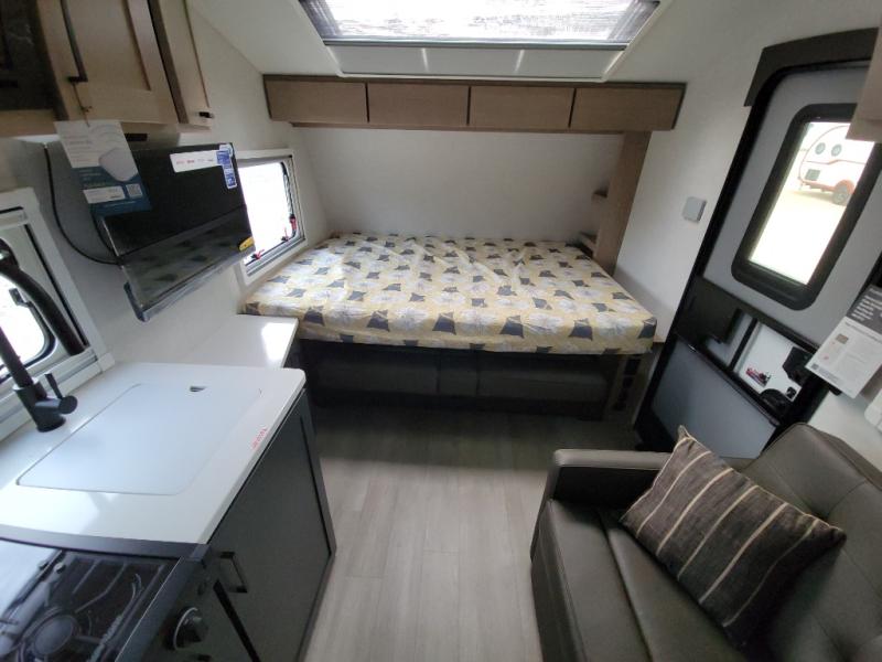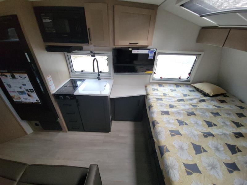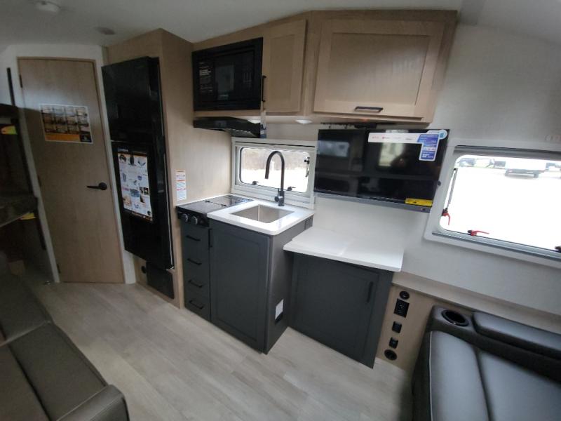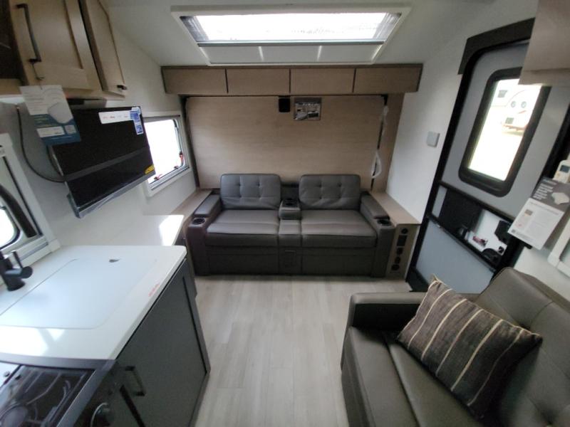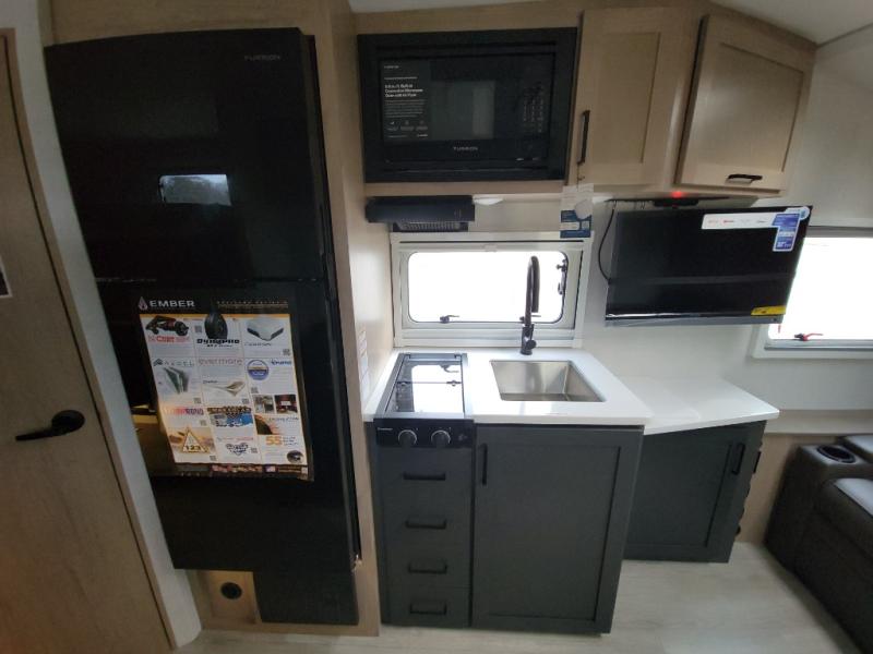 This unique travel trailer offers versatile living! Starting with the front Murphy bed that has a 60" x 80" queen bed to lay your head on at night and can convert into a sofa for seating during the day with a nightstand and a 12V HDTV/AV system to watch your favorite movies in bed. Create your best home cooked meals with the dual burner cooktop and 12V refrigerator then enjoy them at the jackknife sofa with a removable table. There is a second removable table that can be used by the Murphy bed/sofa. The repositionable Embertack E-track bunk/storage system has a 74" x 46" cargo space for your items and a storage locker door to access them from the exterior. You can enjoy twin bunks or convert them to double-size bunks to sleep two to four. The exterior also features a kayak/bike storage door, front pass-through storage area, and a 2" accessory receiver!