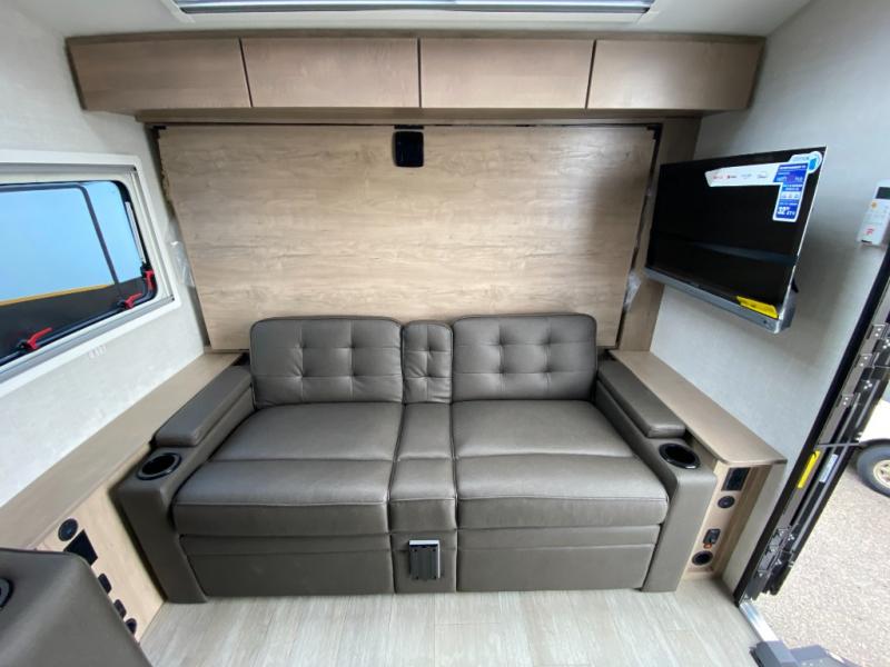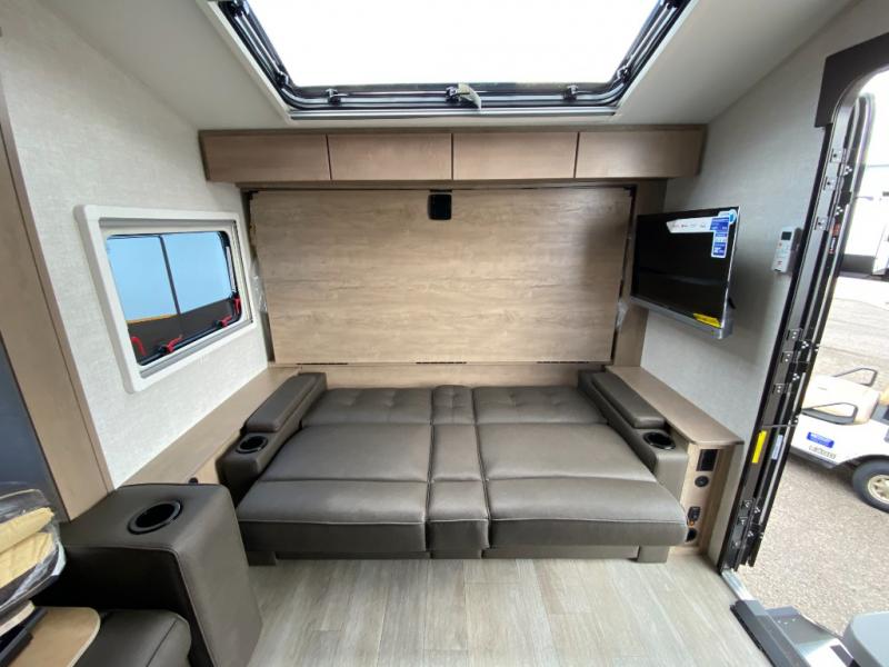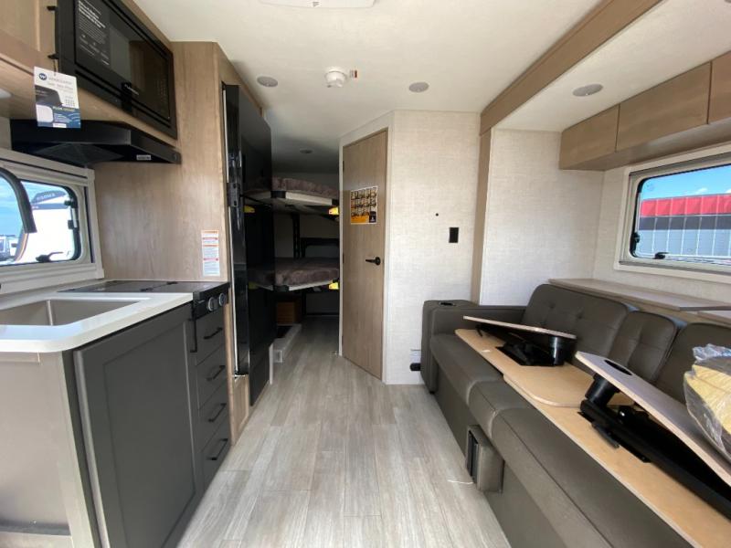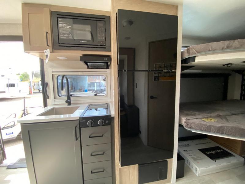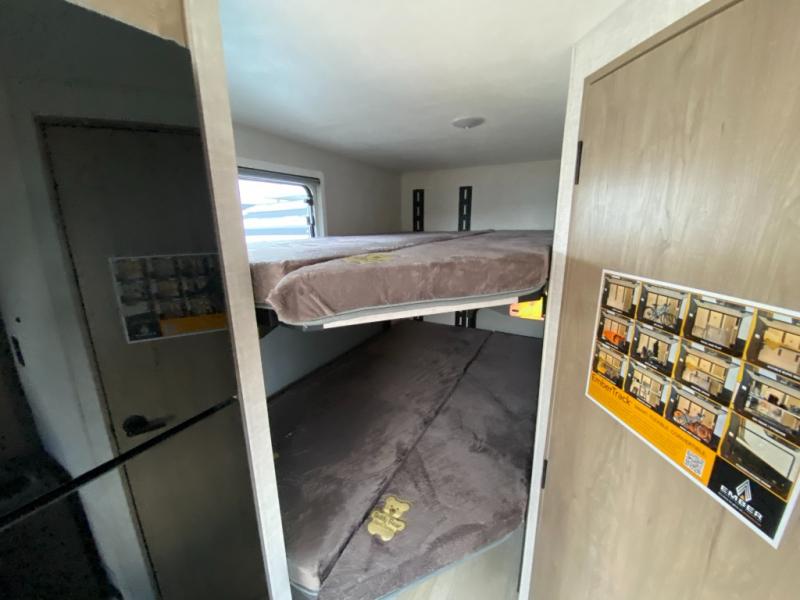 This unique travel trailer offers versatile living! Starting with the front Murphy bed that has a 60" x 80" queen bed to lay your head on at night and can convert into a sofa for seating during the day with a nightstand and a 12V HDTV/AV system to watch your favorite movies in bed. Create your best home cooked meals with the two burner cooktop and 12V refrigerator then enjoy them at the jackknife sofa slide with a removable table. Behind the sofa are dual storage cubbies and it can also convert into an extra sleeping space. The repositionable Embertack E-track bunk/storage system has a 74" x 46" cargo space for your items and a storage locker door to access them from the exterior. You can enjoy twin bunks or convert them to double-size bunks to sleep two to four. The exterior also has a kayak/bike storage door, front pass-through storage area, and a 2" accessory receiver!