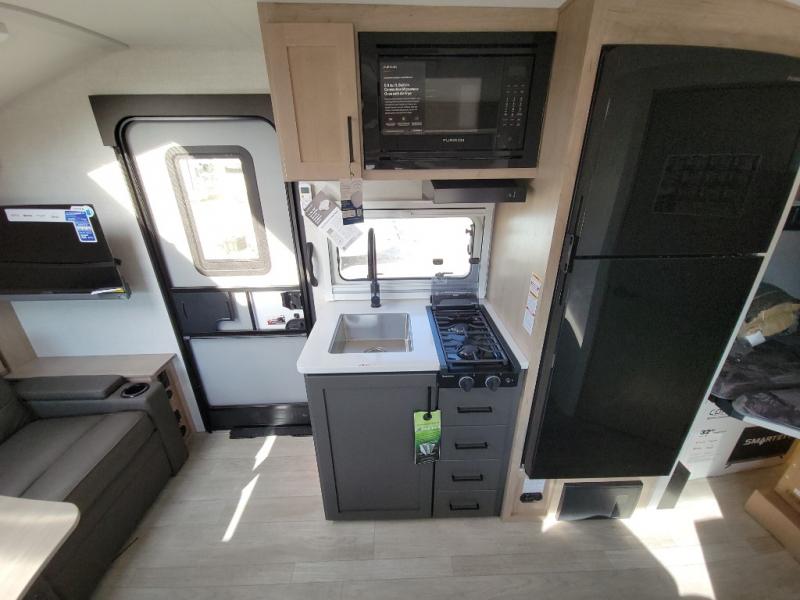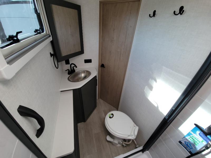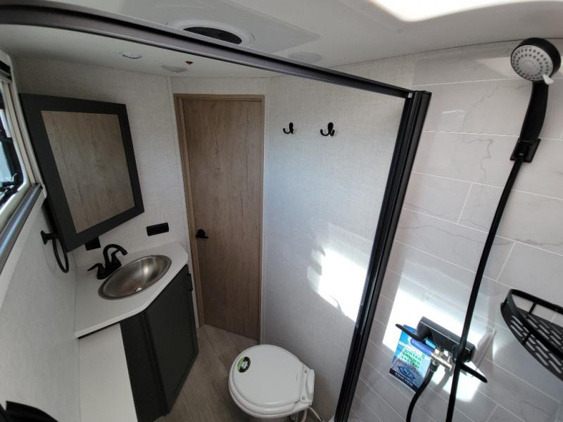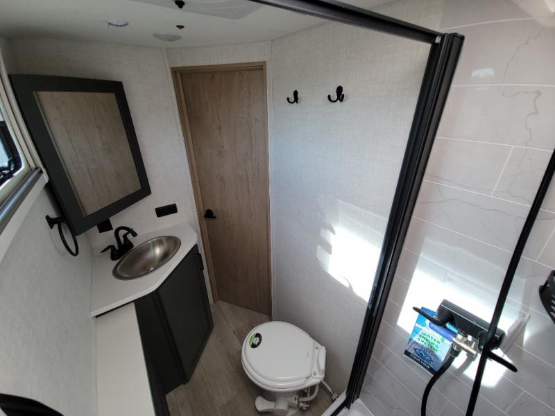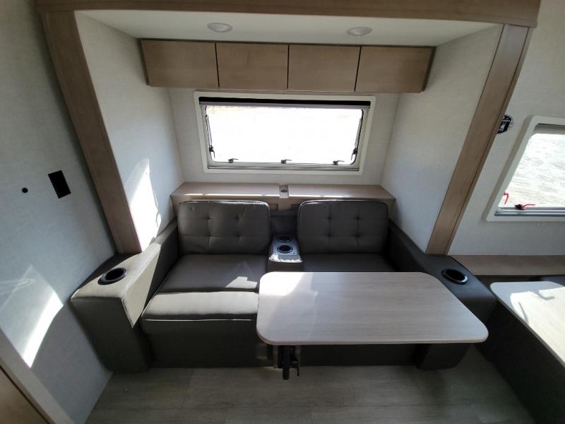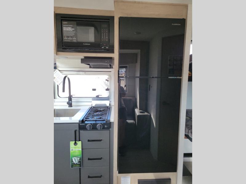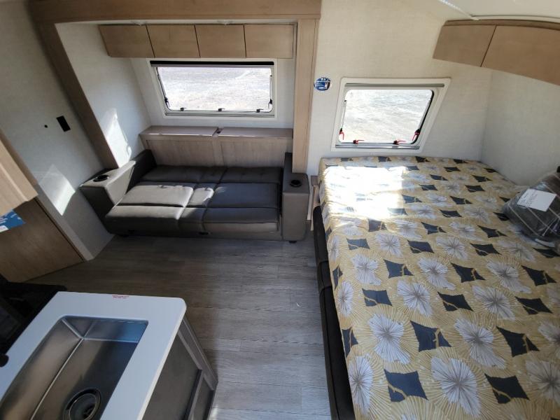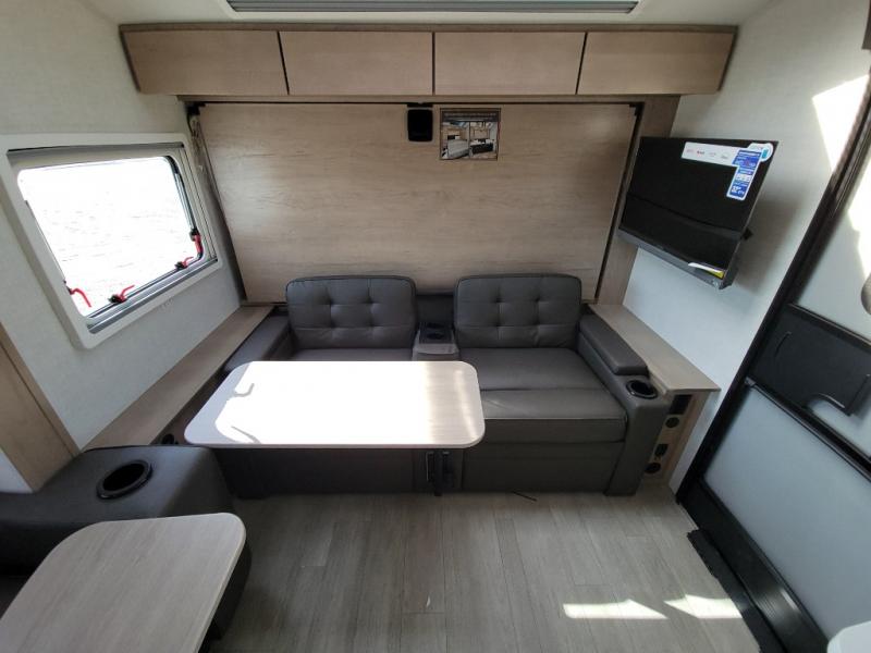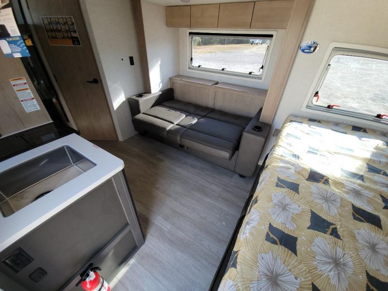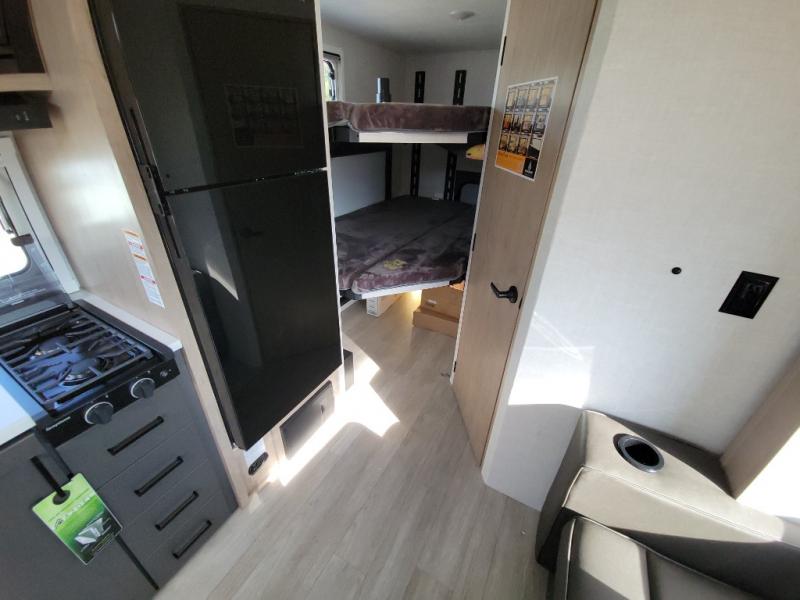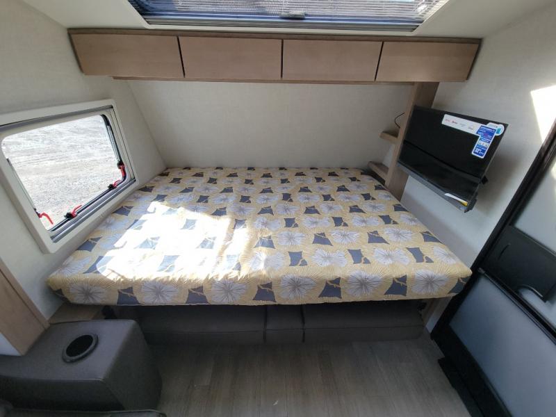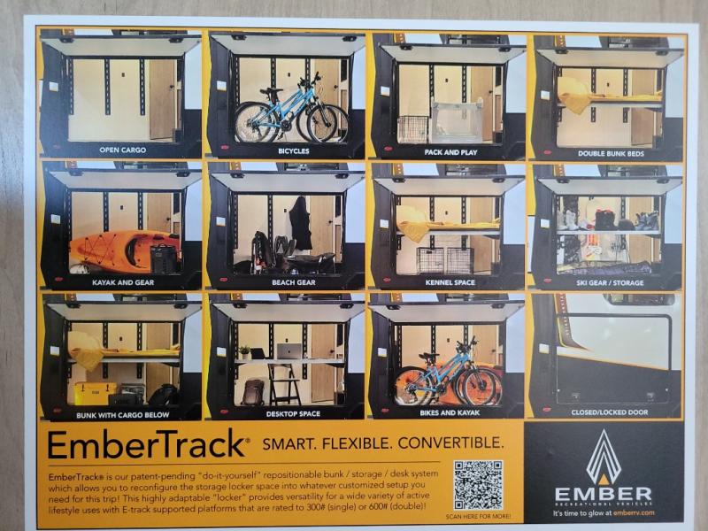 This unique travel trailer offers versatile living! Starting with the front Murphy bed that has a 60" x 80" queen bed to lay your head on at night and can convert into a sofa for seating during the day with a nightstand and a 12V HDTV/AV system to watch your favorite movies in bed. Create your best home cooked meals with the two burner cooktop and 12V refrigerator then enjoy them at the jackknife sofa slide with a removable table. Behind the sofa are dual storage cubbies and it can also convert into an extra sleeping space. The repositionable Embertack E-track bunk/storage system has a 74" x 46" cargo space for your items and a storage locker door to access them from the exterior. You can enjoy twin bunks or convert them to double-size bunks to sleep two to four. The exterior also has a kayak/bike storage door, front pass-through storage area, and a 2" accessory receiver!