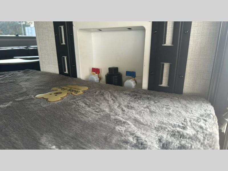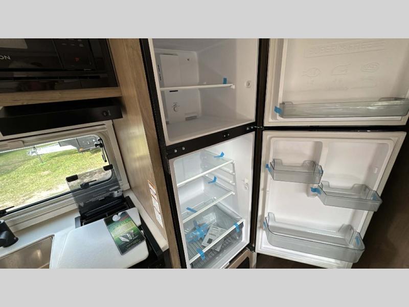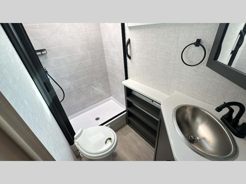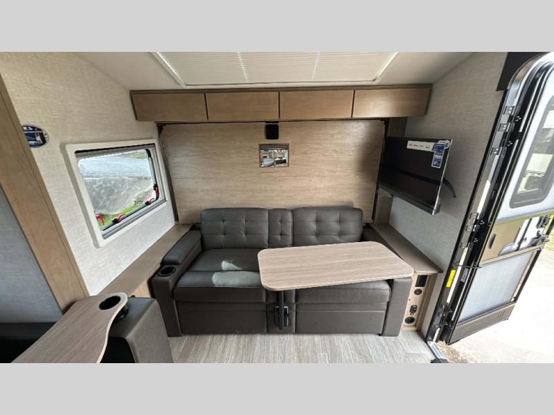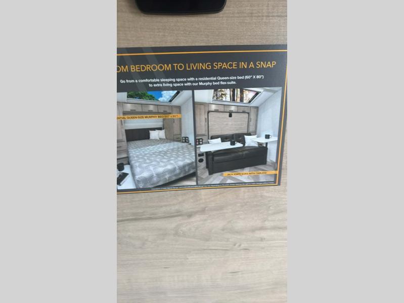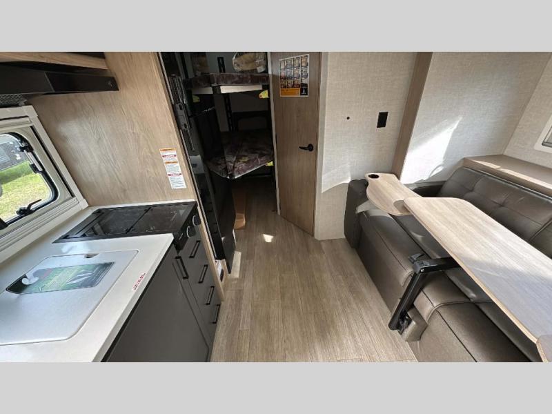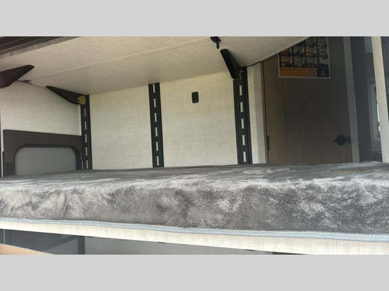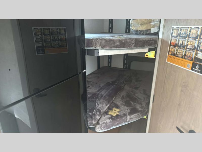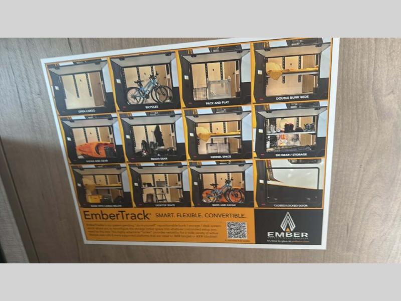 This unique travel trailer offers versatile living! Starting with the front Murphy bed that has a 60" x 80" queen bed to lay your head on at night and can convert into a sofa for seating during the day with a nightstand and a 12V HDTV/AV system to watch your favorite movies in bed. Create your best home cooked meals with the two burner cooktop and 12V refrigerator then enjoy them at the jackknife sofa slide with a removable table. Behind the sofa are dual storage cubbies and it can also convert into an extra sleeping space. The repositionable Embertack E-track bunk/storage system has a 74" x 46" cargo space for your items and a storage locker door to access them from the exterior. You can enjoy twin bunks or convert them to double-size bunks to sleep two to four. The exterior also has a kayak/bike storage door, front pass-through storage area, and a 2" accessory receiver!