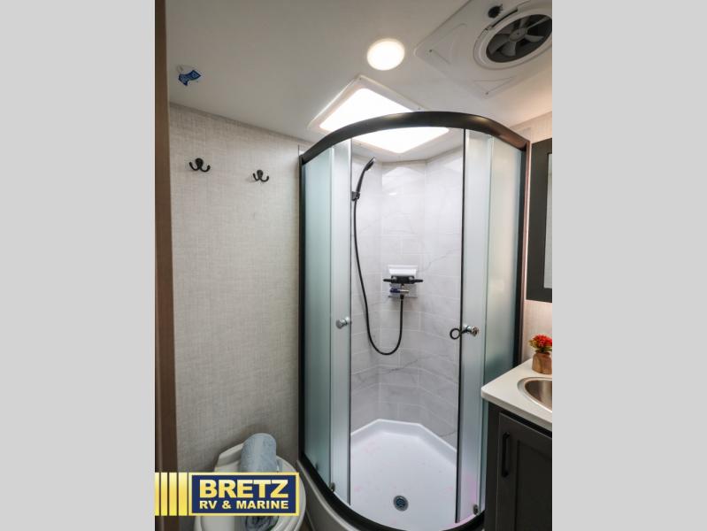 Head to your favorite campgrounds in this travel trailer! It features a front queen bed to lay your head on at night with nightstands and wardrobes on either side, plus an additional wardrobe and another hidden wardrobe behind the 12V HDTV/AV system on hinge. Prepare your best home cooked meals with the two burner cooktop and enjoy them at the jackknife sofa slide with a removable table. Behind the sofa are dual storage cubbies to keep your items out of the way too. With two pantries, you can bring all of your favorite snacks. You also have a rear corner bathroom with a 32" radius shower to rinse the sand out of your hair after a fun day at the beach!