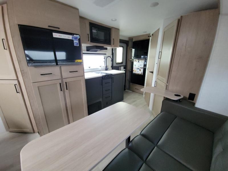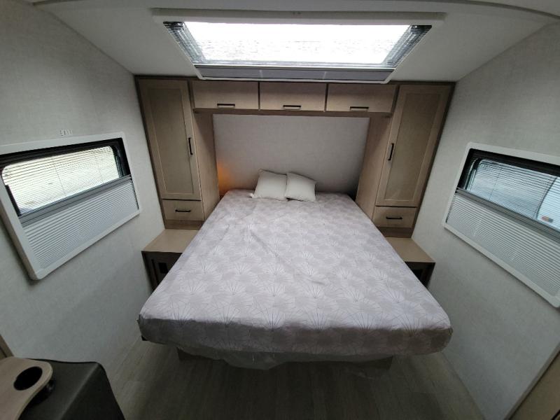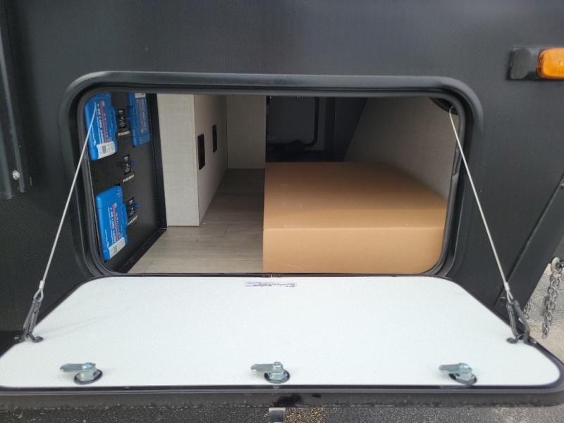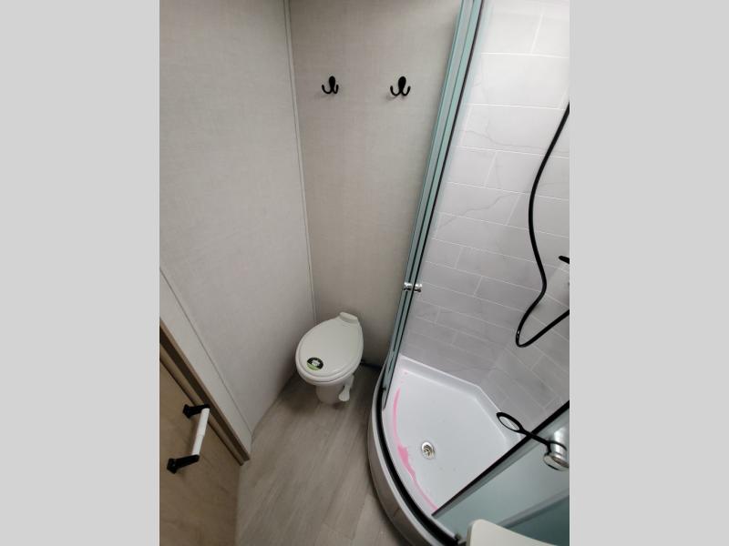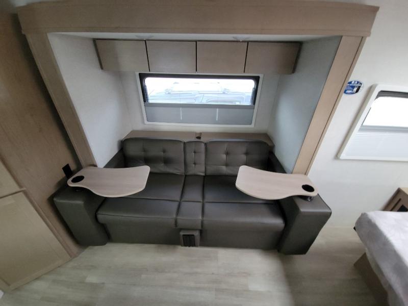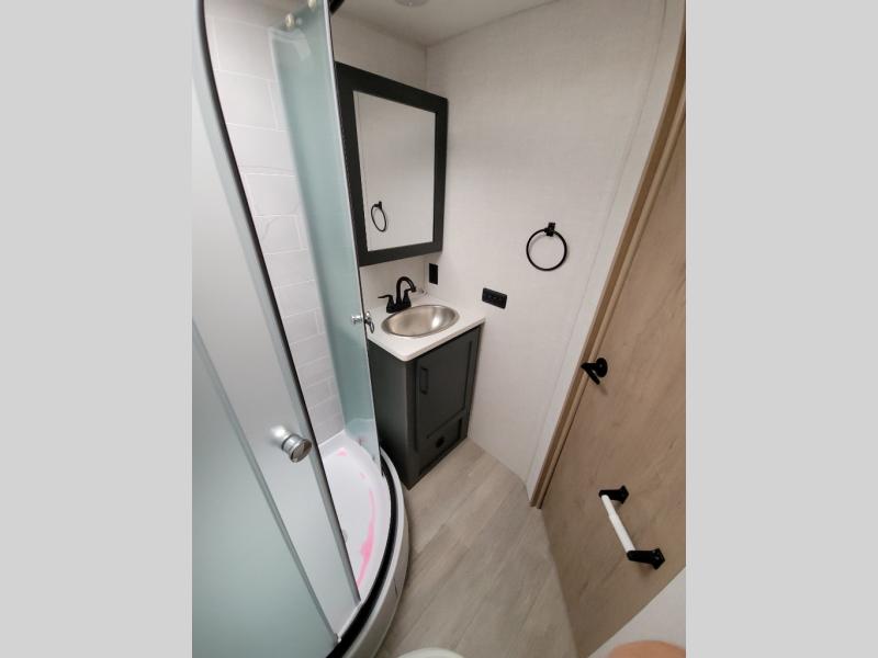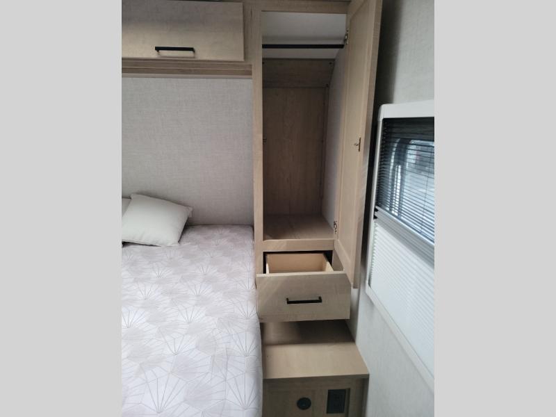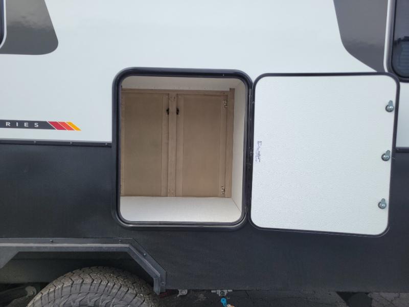 Head to your favorite campgrounds in this travel trailer! It features a front queen bed to lay your head on at night with nightstands and wardrobes on either side, plus an additional wardrobe and another hidden wardrobe behind the 12V HDTV/AV system on hinge. Prepare your best home cooked meals with the two burner cooktop and enjoy them at the jackknife sofa slide with a removable table. Behind the sofa are dual storage cubbies to keep your items out of the way too. With two pantries, you can bring all of your favorite snacks. You also have a rear corner bathroom with a 32" radius shower to rinse the sand out of your hair after a fun day at the beach!