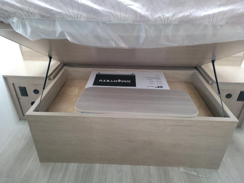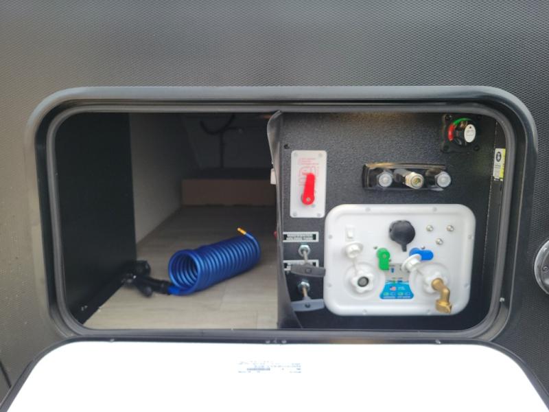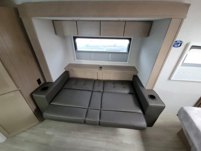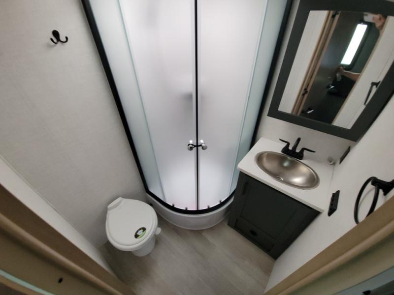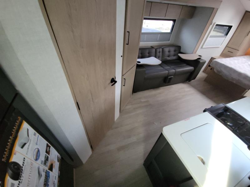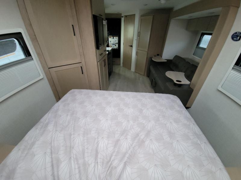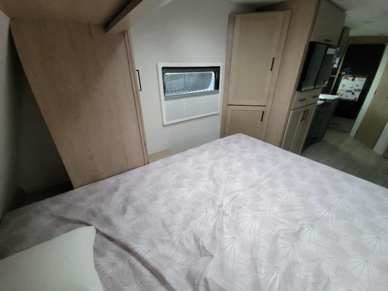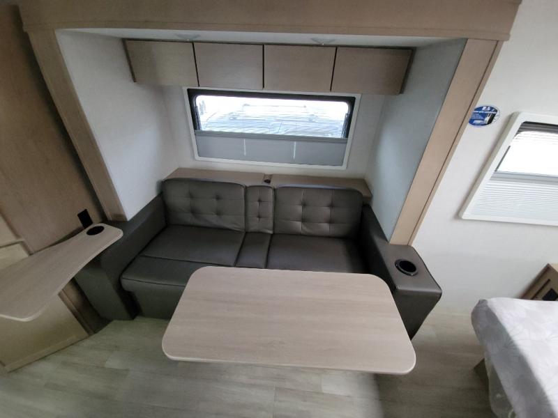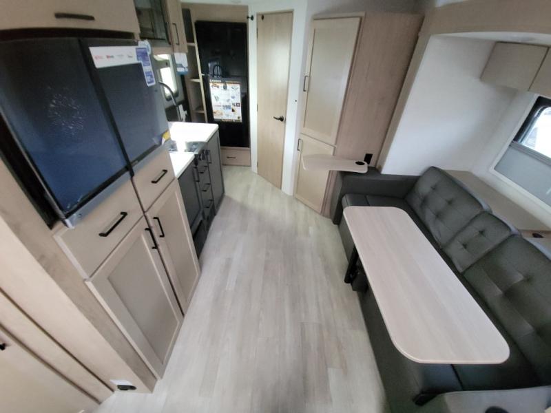 Head to your favorite campgrounds in this travel trailer! It features a front queen bed to lay your head on at night with nightstands and wardrobes on either side, plus an additional wardrobe and another hidden wardrobe behind the 12V HDTV/AV system on hinge. Prepare your best home cooked meals with the two burner cooktop and enjoy them at the jackknife sofa slide with a removable table. Behind the sofa are dual storage cubbies to keep your items out of the way too. With two pantries, you can bring all of your favorite snacks. You also have a rear corner bathroom with a 32" radius shower to rinse the sand out of your hair after a fun day at the beach!