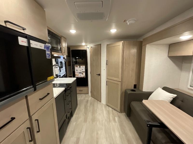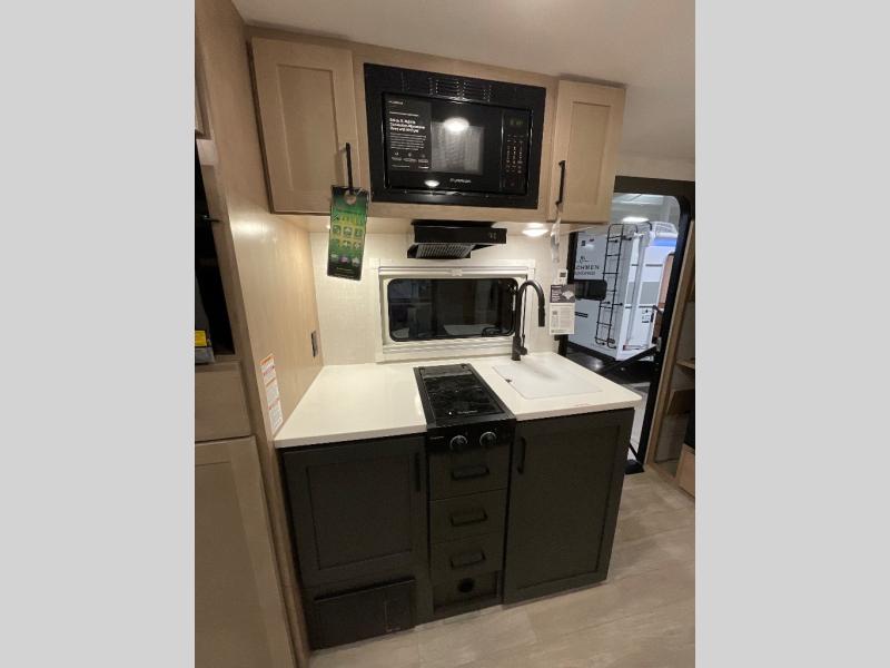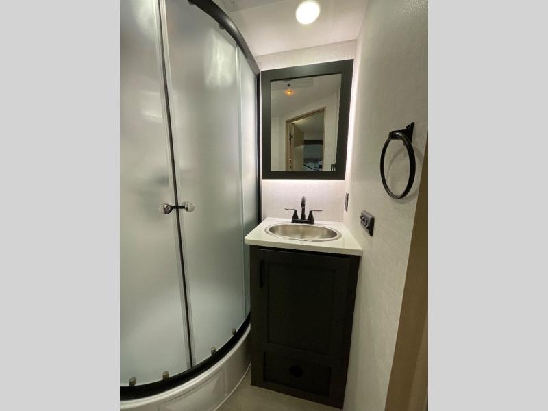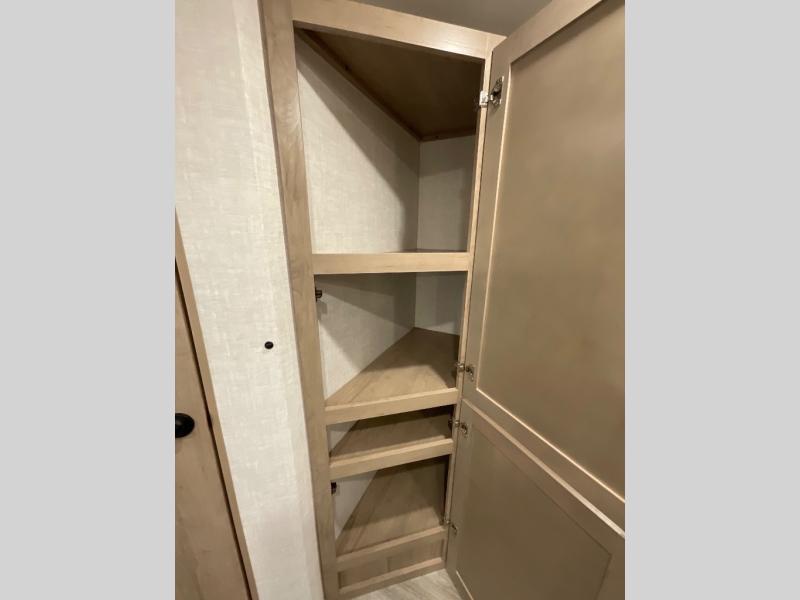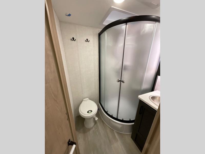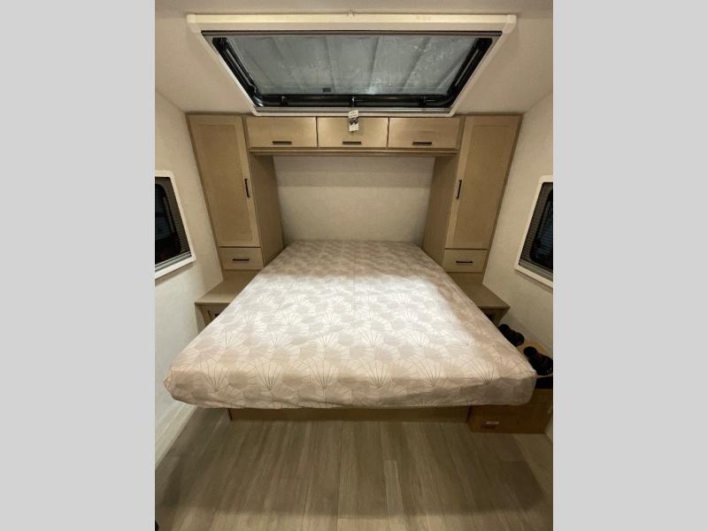 Head to your favorite campgrounds in this travel trailer! It features a front queen bed to lay your head on at night with nightstands and wardrobes on either side, plus an additional wardrobe and another hidden wardrobe behind the 12V HDTV/AV system on hinge. Prepare your best home cooked meals with the two burner cooktop and enjoy them at the jackknife sofa slide with a removable table. Behind the sofa are dual storage cubbies to keep your items out of the way too. With two pantries, you can bring all of your favorite snacks. You also have a rear corner bathroom with a 32" radius shower to rinse the sand out of your hair after a fun day at the beach!