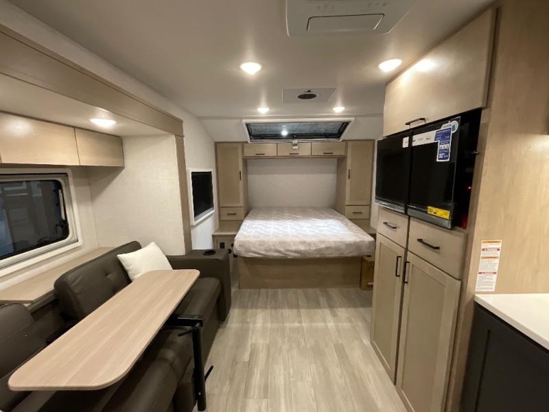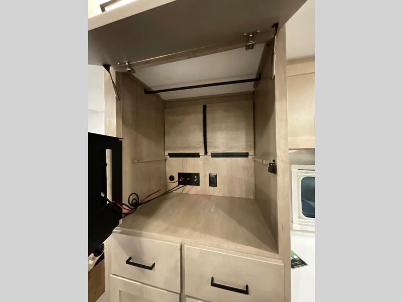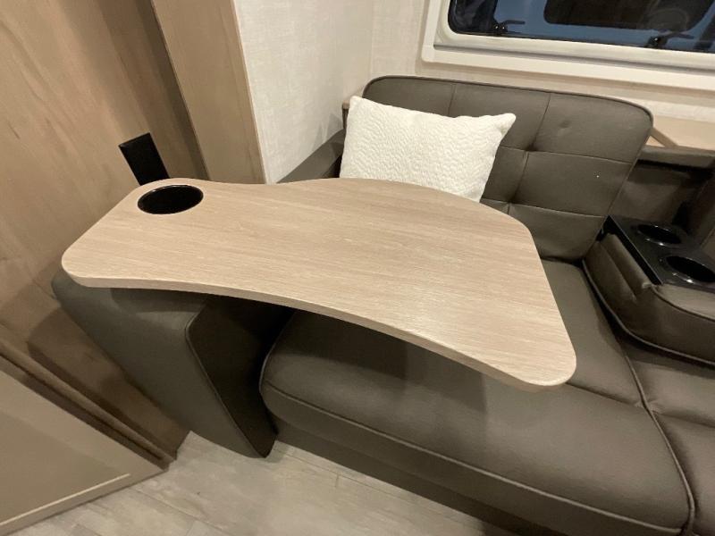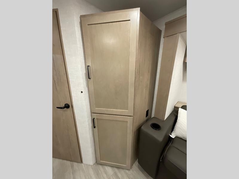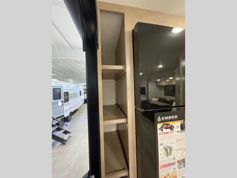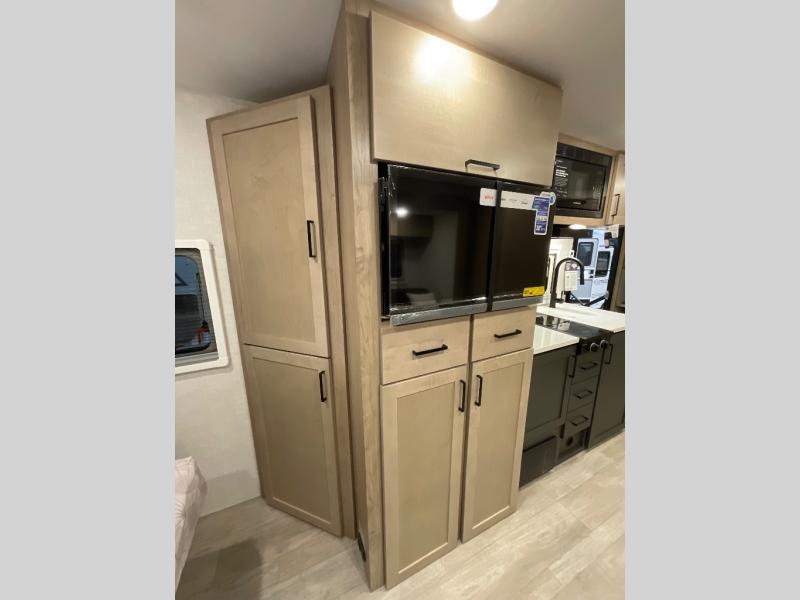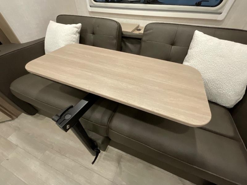 Head to your favorite campgrounds in this travel trailer! It features a front queen bed to lay your head on at night with nightstands and wardrobes on either side, plus an additional wardrobe and another hidden wardrobe behind the 12V HDTV/AV system on hinge. Prepare your best home cooked meals with the two burner cooktop and enjoy them at the jackknife sofa slide with a removable table. Behind the sofa are dual storage cubbies to keep your items out of the way too. With two pantries, you can bring all of your favorite snacks. You also have a rear corner bathroom with a 32" radius shower to rinse the sand out of your hair after a fun day at the beach!