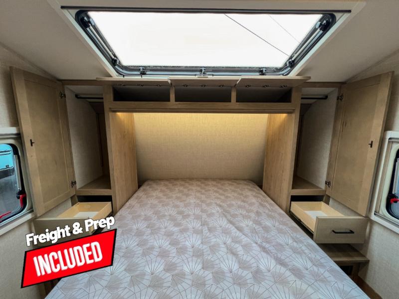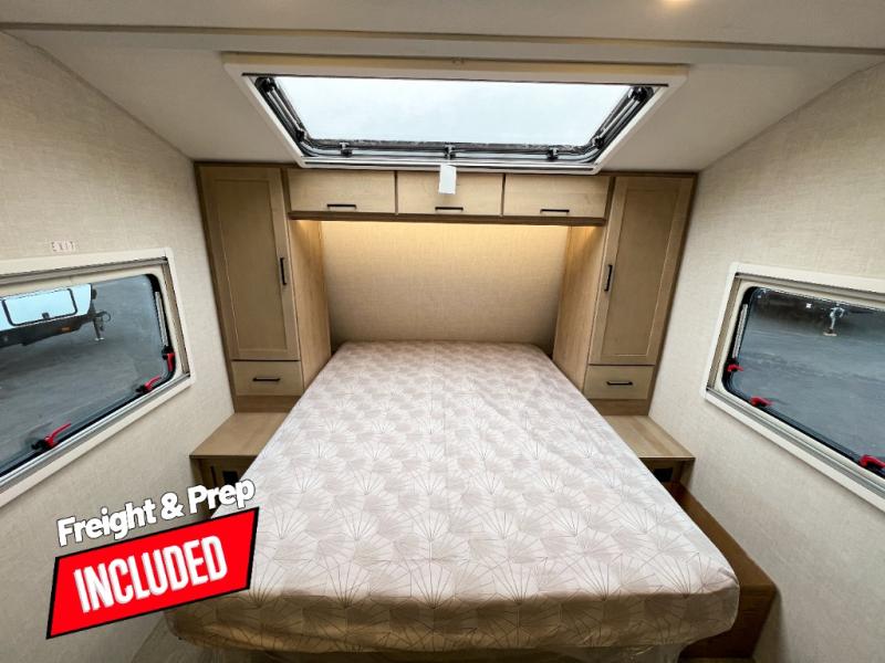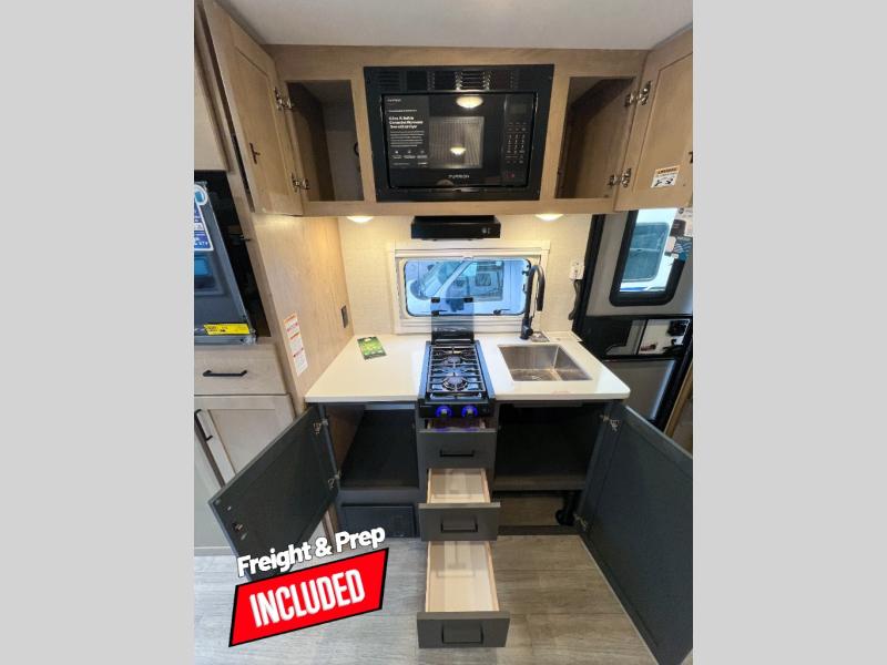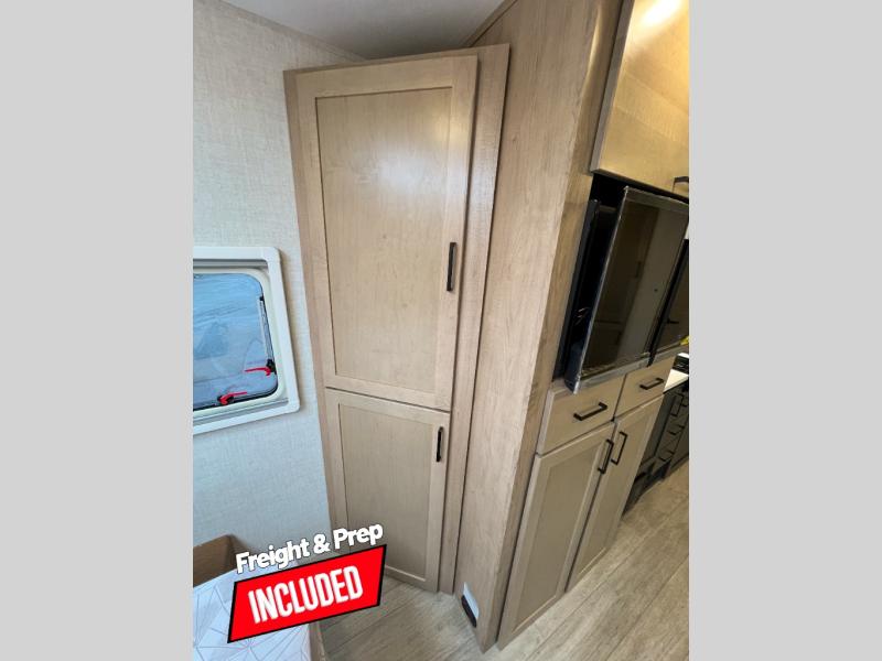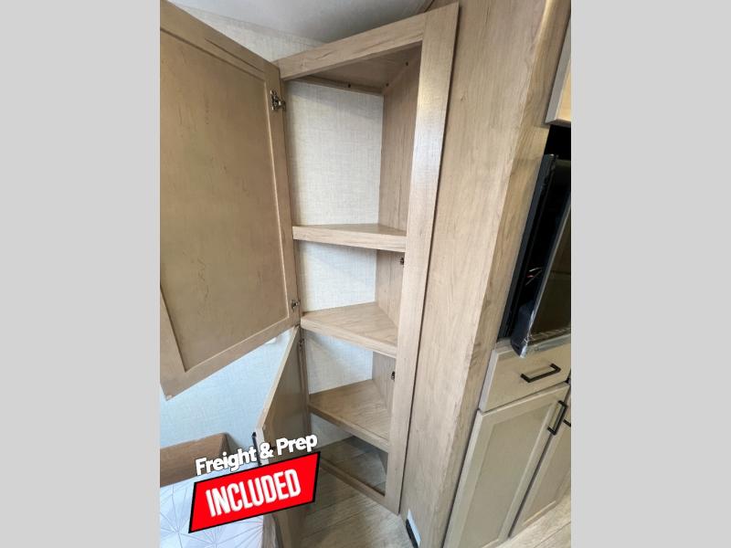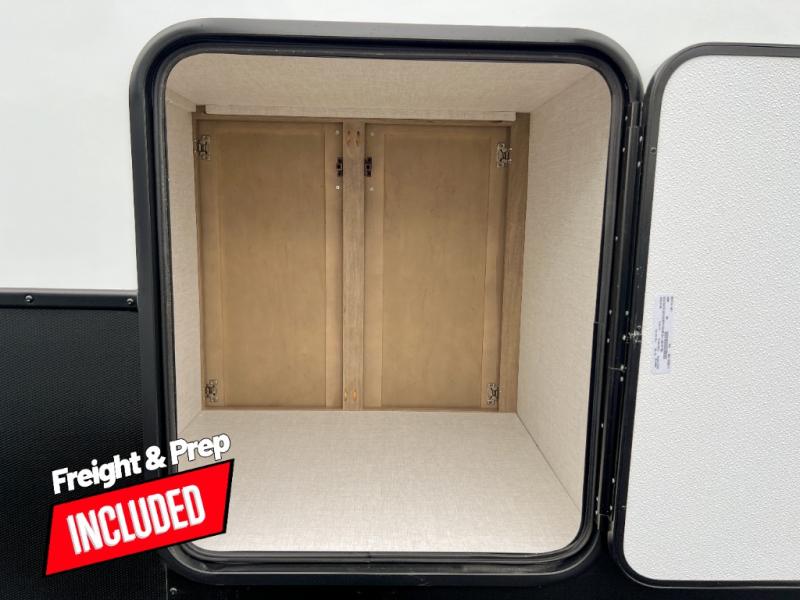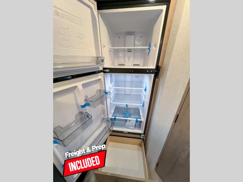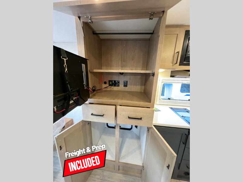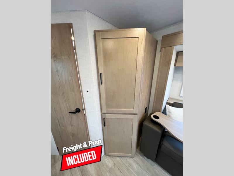 Head to your favorite campgrounds in this travel trailer! It features a front queen bed to lay your head on at night with nightstands and wardrobes on either side, plus an additional wardrobe and another hidden wardrobe behind the 12V HDTV/AV system on hinge. Prepare your best home cooked meals with the two burner cooktop and enjoy them at the jackknife sofa slide with a removable table. Behind the sofa are dual storage cubbies to keep your items out of the way too. With two pantries, you can bring all of your favorite snacks. You also have a rear corner bathroom with a 32" radius shower to rinse the sand out of your hair after a fun day at the beach!