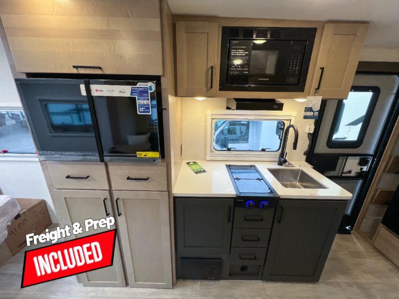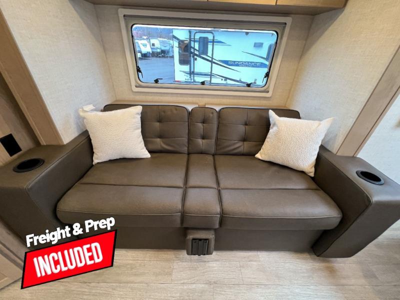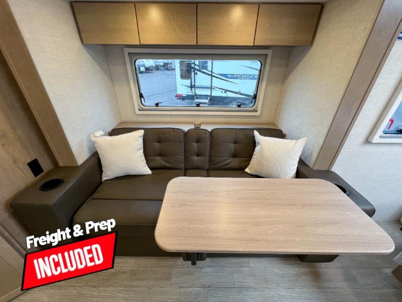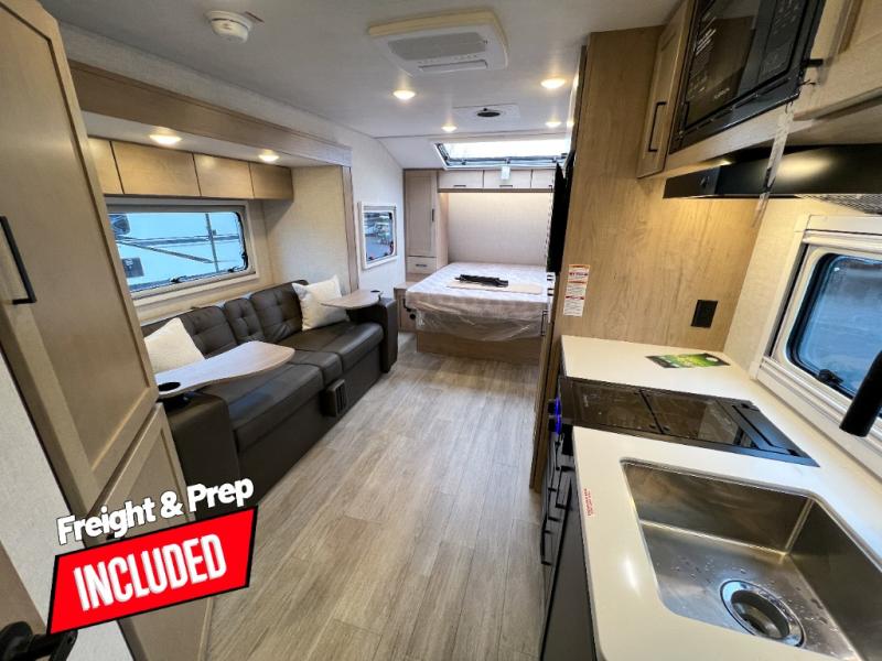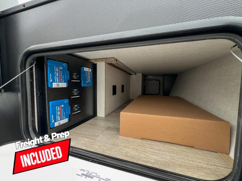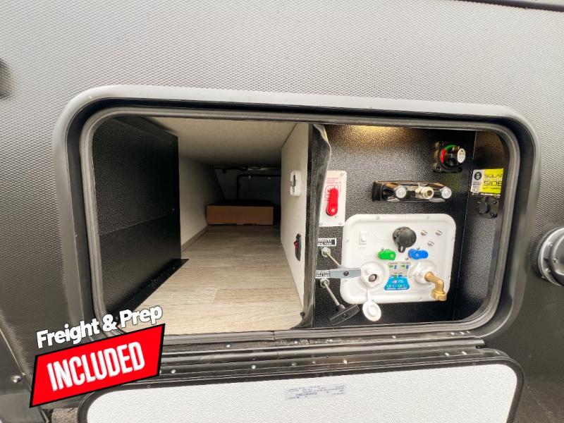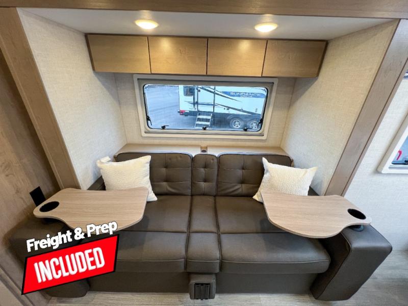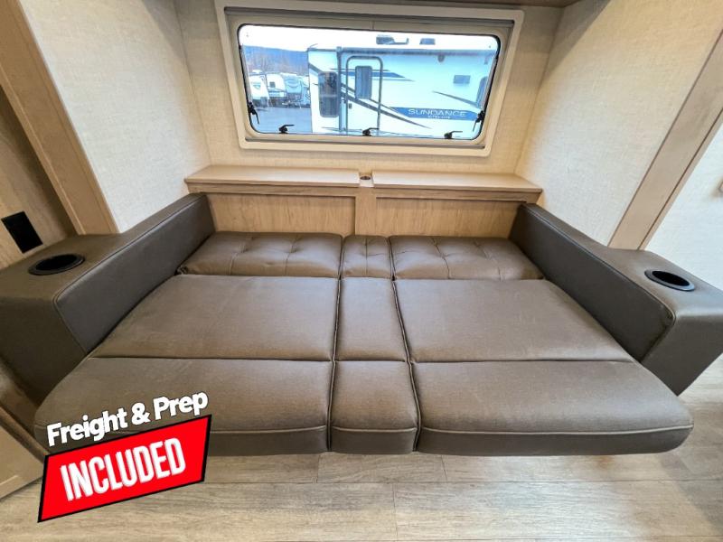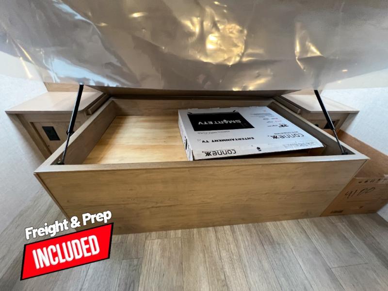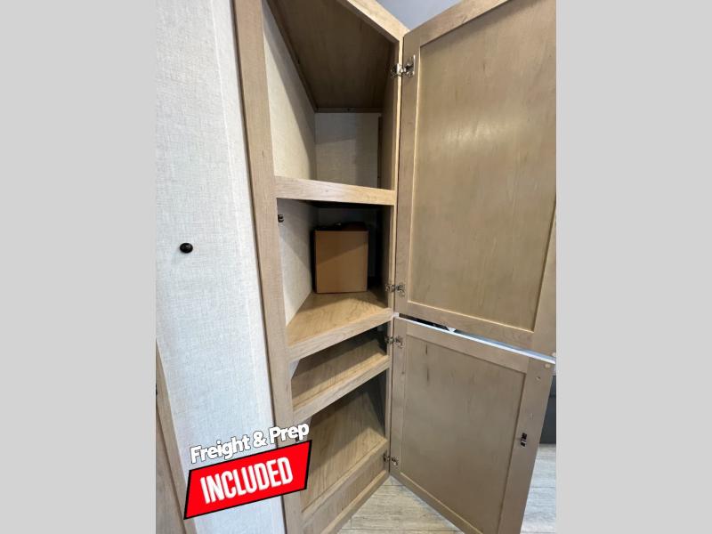 Head to your favorite campgrounds in this travel trailer! It features a front queen bed to lay your head on at night with nightstands and wardrobes on either side, plus an additional wardrobe and another hidden wardrobe behind the 12V HDTV/AV system on hinge. Prepare your best home cooked meals with the two burner cooktop and enjoy them at the jackknife sofa slide with a removable table. Behind the sofa are dual storage cubbies to keep your items out of the way too. With two pantries, you can bring all of your favorite snacks. You also have a rear corner bathroom with a 32" radius shower to rinse the sand out of your hair after a fun day at the beach!