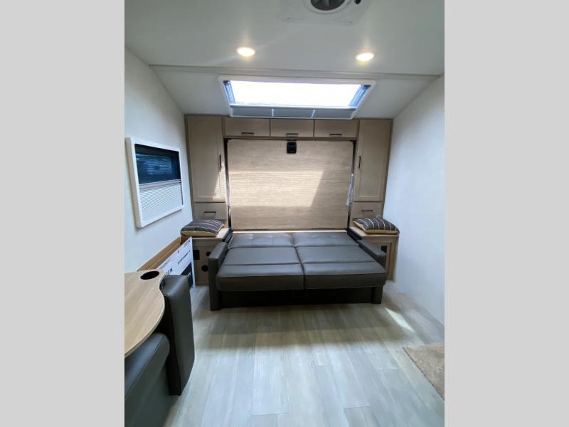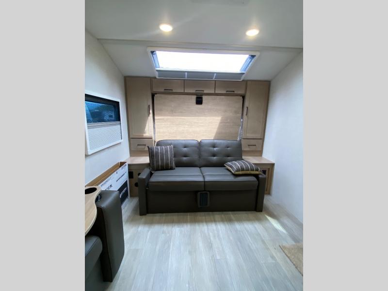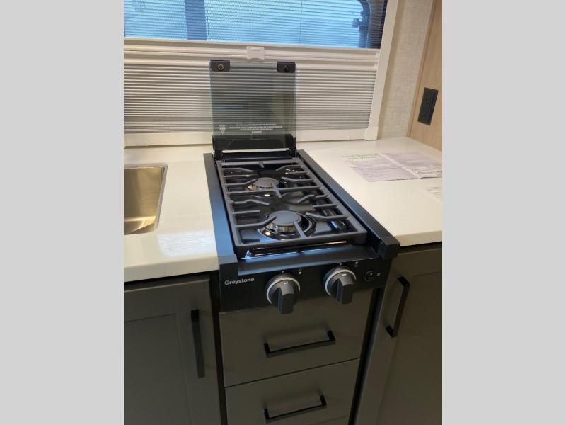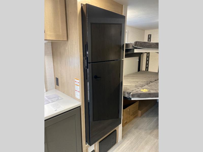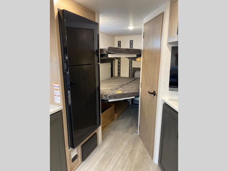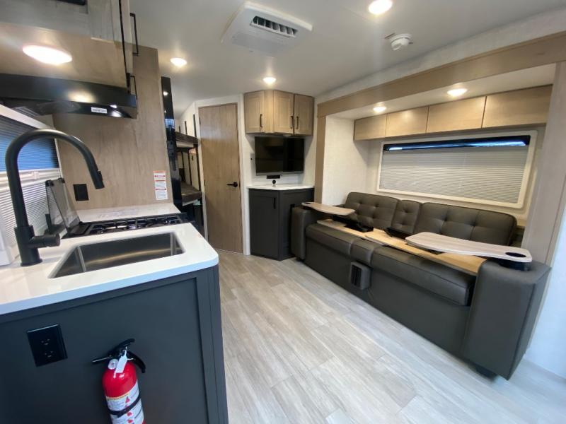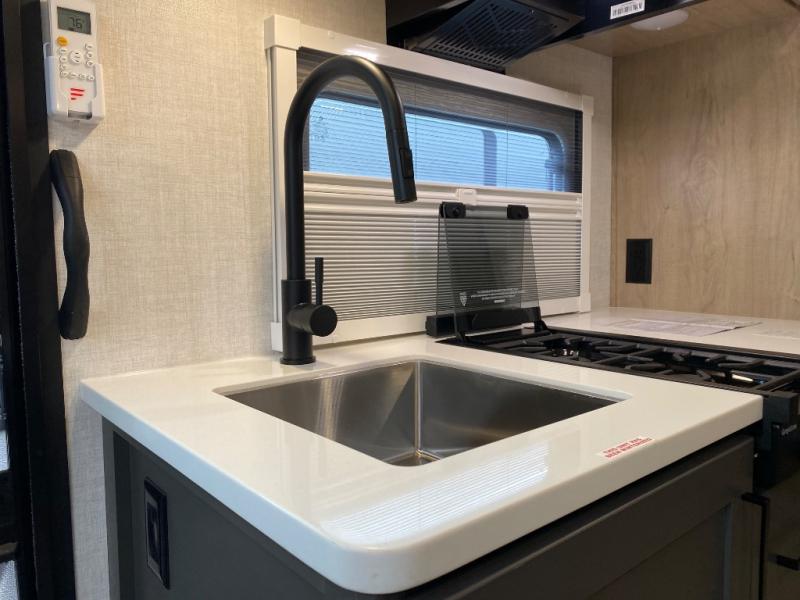You're going to love everything about this travel trailer that can comfortably sleep three to six people each night, depending on your bunk configurations. There is a spacious storage locker that can be used for hiking gear, plus a kayak/bike storage door for quick and easy packing. The Embertrack system lets you convert the benches to twin bunks, double-size bunks, a desk, or remove them altogether for more storage space. You will enjoy the queen-size Murphy bed up front, along with the "stargazer" skylight for nighttime views, along with dual nightstands and dual wardrobes to keep your clothes tidy. And in the morning you can relax on the jack-knife sofa with a removable table once the bed is put away. This trailer also includes a full kitchen with a 12V refrigerator, an air fryer convection microwave oven, a dual burner cooktop, and a stainless steel sink for easy clean-up.