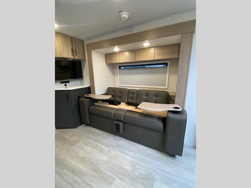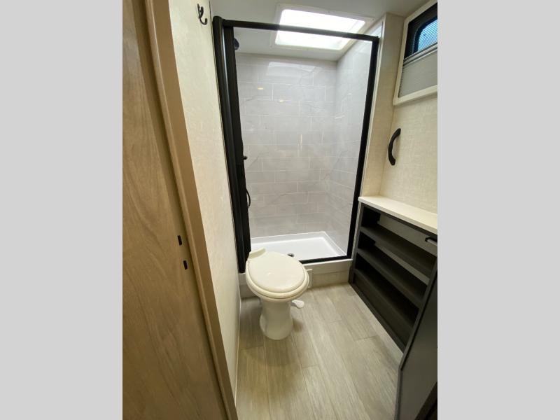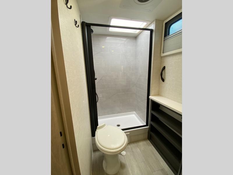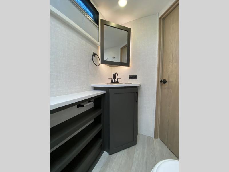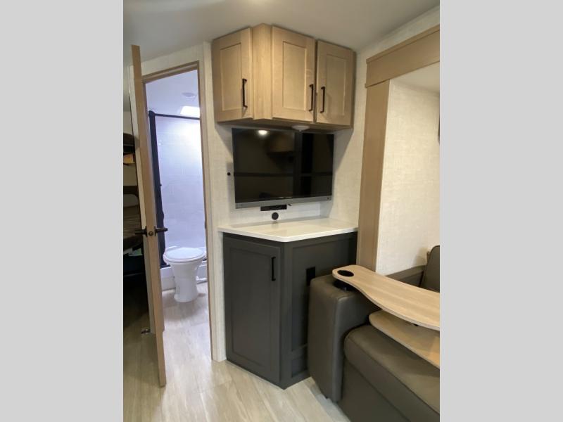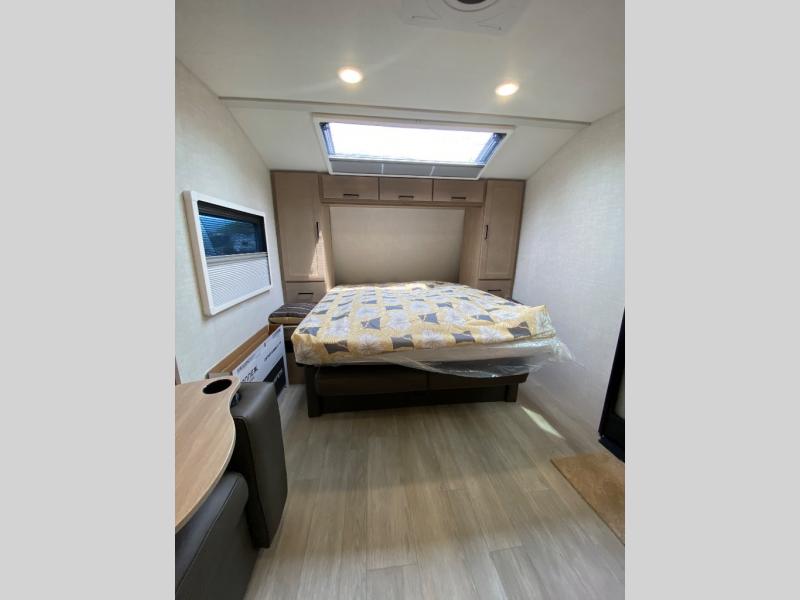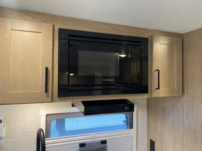 You're going to love everything about this travel trailer that can comfortably sleep three to six people each night, depending on your bunk configurations. There is a spacious storage locker that can be used for hiking gear, plus a kayak/bike storage door for quick and easy packing. The Embertrack system lets you convert the benches to twin bunks, double-size bunks, a desk, or remove them altogether for more storage space. You will enjoy the queen-size Murphy bed up front, along with the "stargazer" skylight for nighttime views, along with dual nightstands and dual wardrobes to keep your clothes tidy. And in the morning you can relax on the jack-knife sofa with a removable table once the bed is put away. This trailer also includes a full kitchen with a 12V refrigerator, an air fryer convection microwave oven, a dual burner cooktop, and a stainless steel sink for easy clean-up.