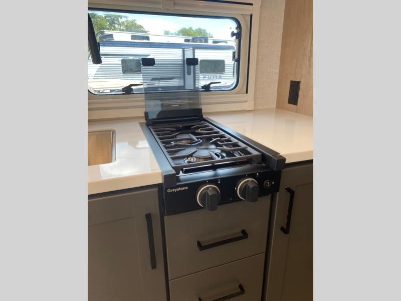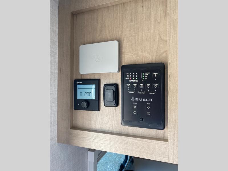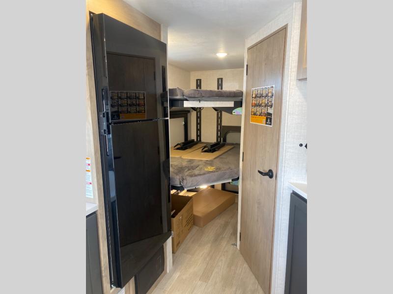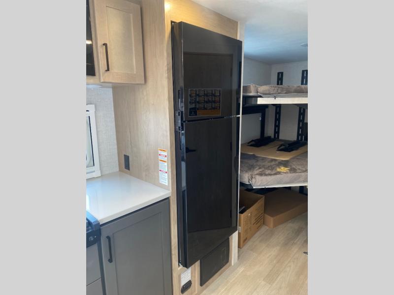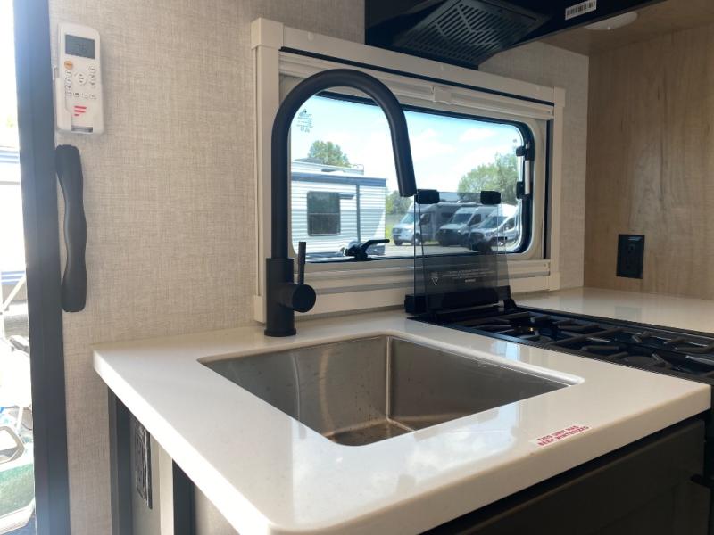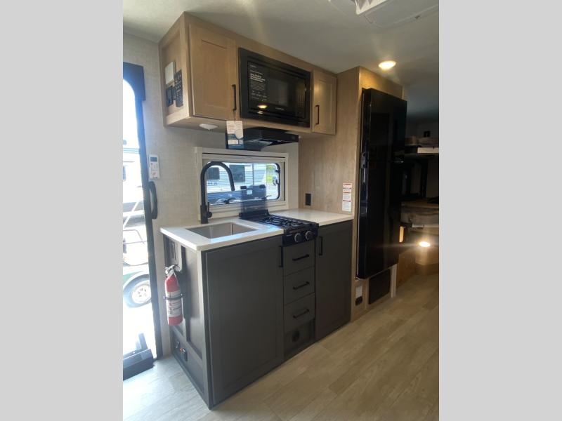 You're going to love everything about this travel trailer that can comfortably sleep three to six people each night, depending on your bunk configurations. There is a spacious storage locker that can be used for hiking gear, plus a kayak/bike storage door for quick and easy packing. The Embertrack system lets you convert the benches to twin bunks, double-size bunks, a desk, or remove them altogether for more storage space. You will enjoy the queen-size Murphy bed up front, along with the "stargazer" skylight for nighttime views, along with dual nightstands and dual wardrobes to keep your clothes tidy. And in the morning you can relax on the jack-knife sofa with a removable table once the bed is put away. This trailer also includes a full kitchen with a 12V refrigerator, an air fryer convection microwave oven, a dual burner cooktop, and a stainless steel sink for easy clean-up.