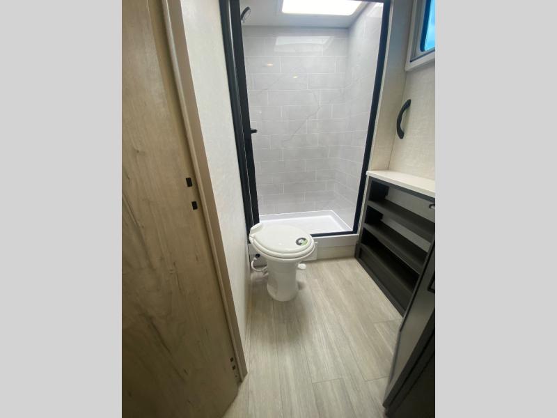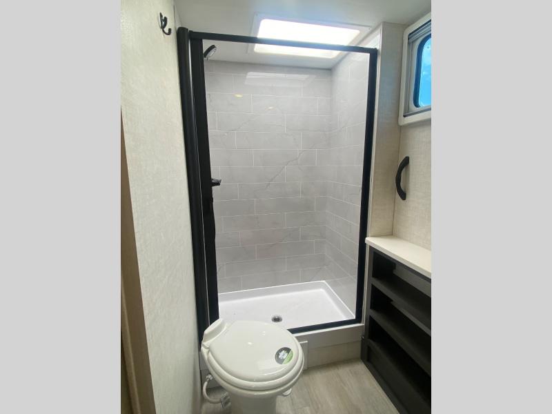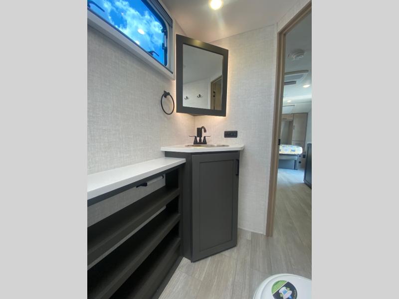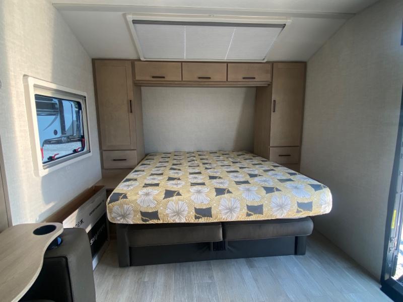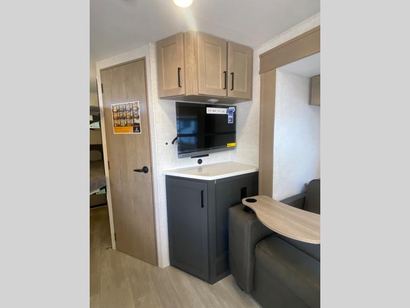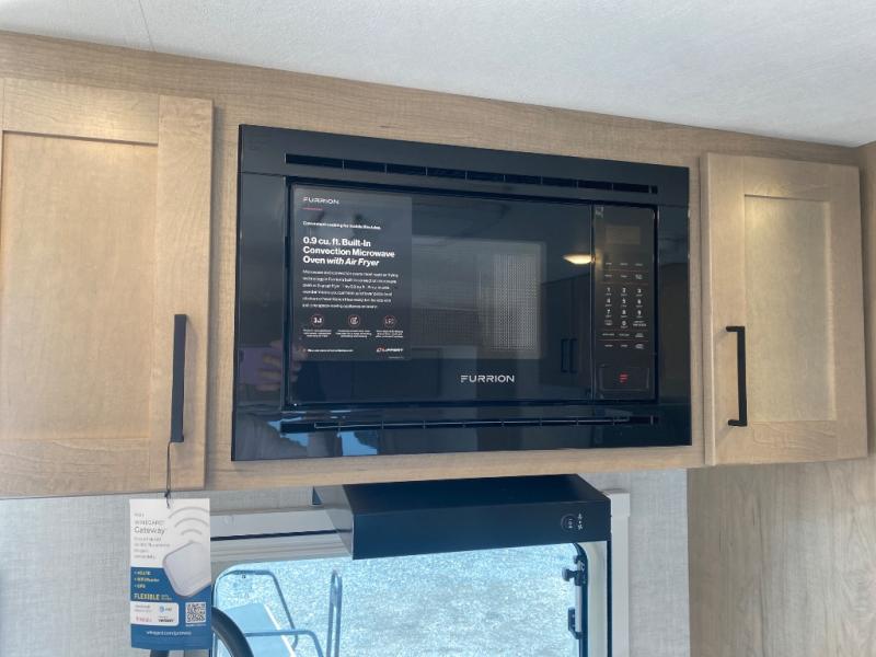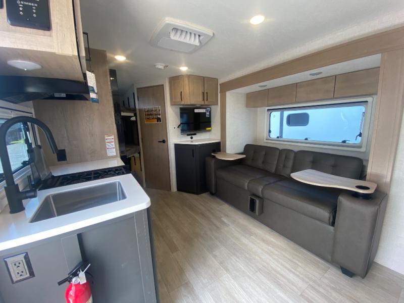 You're going to love everything about this travel trailer that can comfortably sleep three to six people each night, depending on your bunk configurations. There is a spacious storage locker that can be used for hiking gear, plus a kayak/bike storage door for quick and easy packing. The Embertrack system lets you convert the benches to twin bunks, double-size bunks, a desk, or remove them altogether for more storage space. You will enjoy the queen-size Murphy bed up front, along with the "stargazer" skylight for nighttime views, along with dual nightstands and dual wardrobes to keep your clothes tidy. And in the morning you can relax on the jack-knife sofa with a removable table once the bed is put away. This trailer also includes a full kitchen with a 12V refrigerator, an air fryer convection microwave oven, a dual burner cooktop, and a stainless steel sink for easy clean-up.