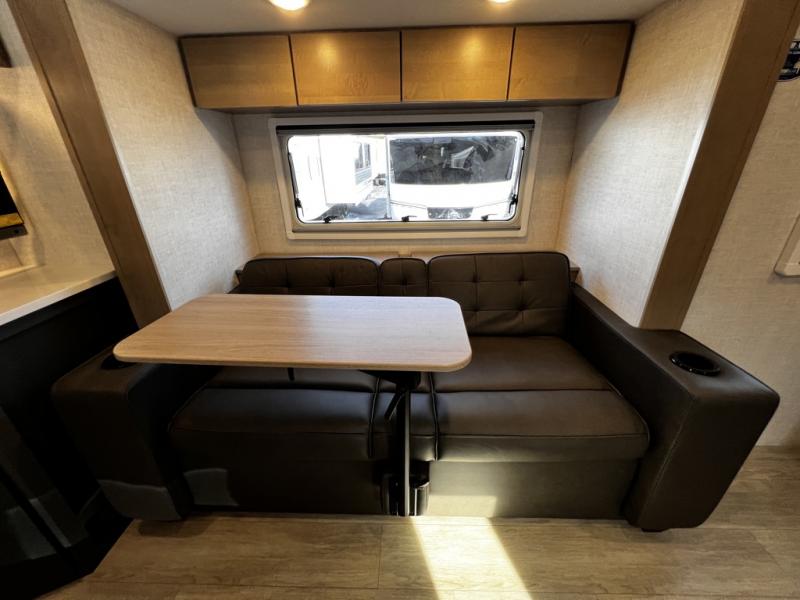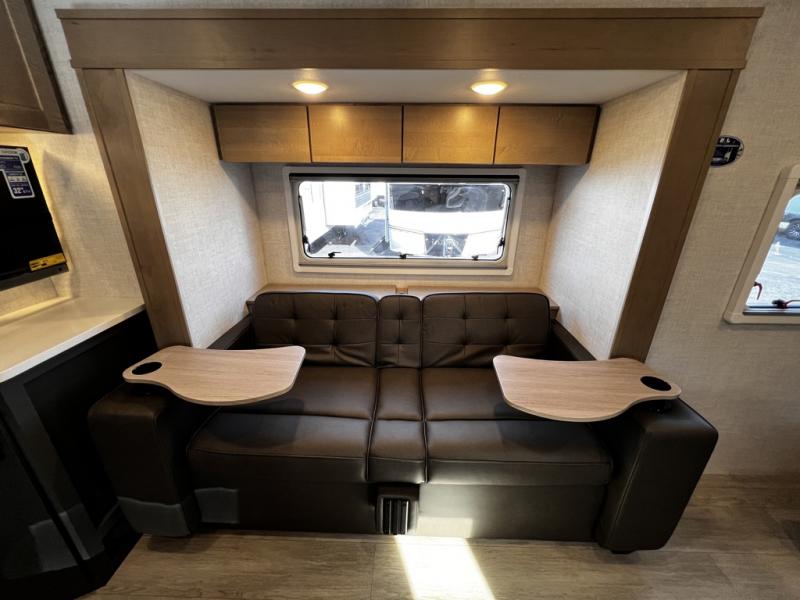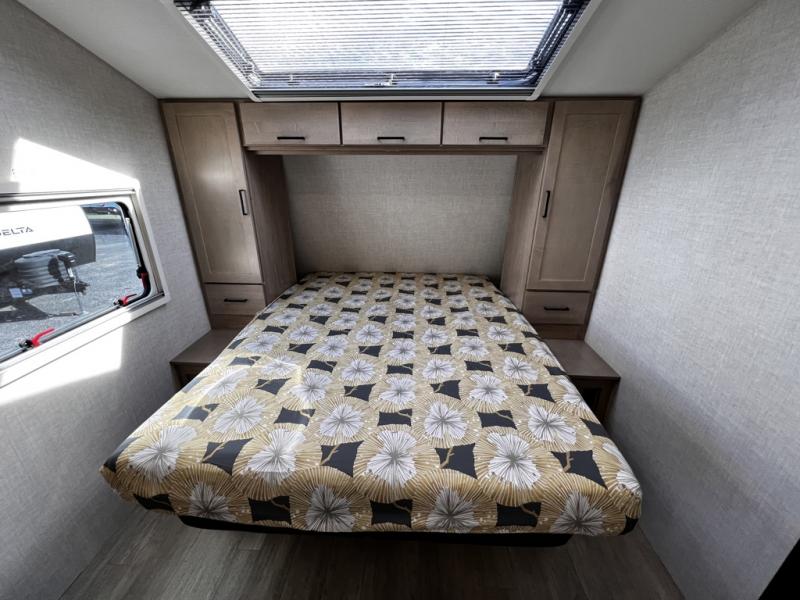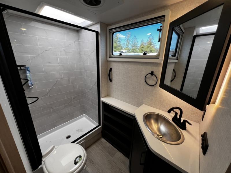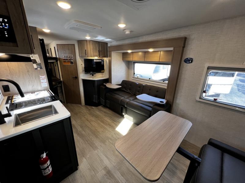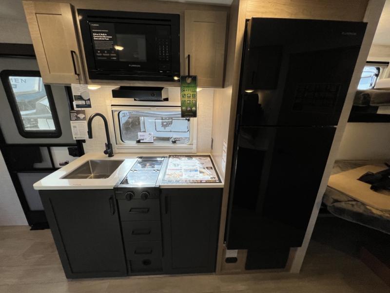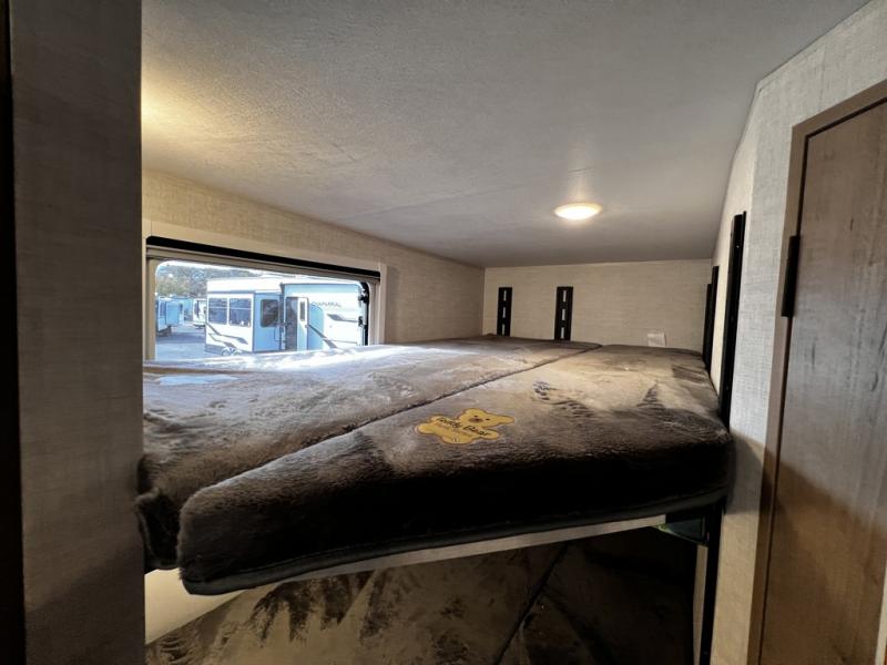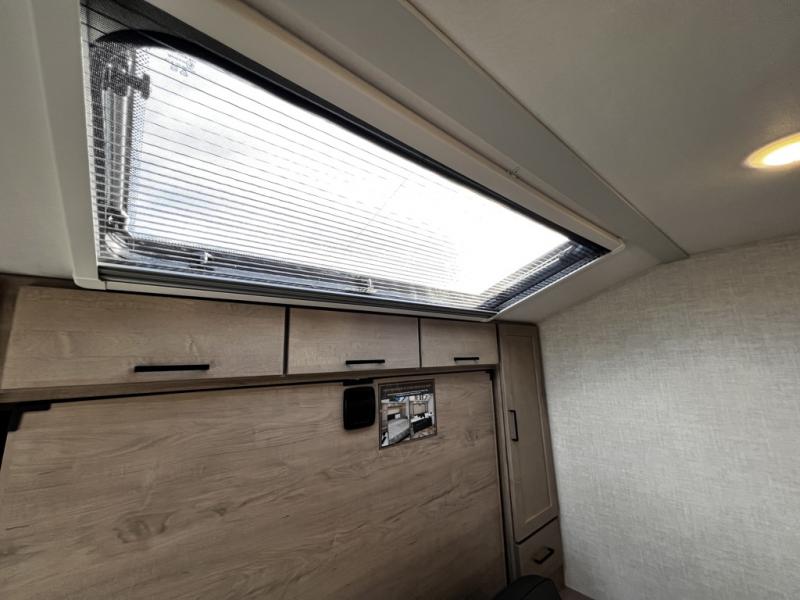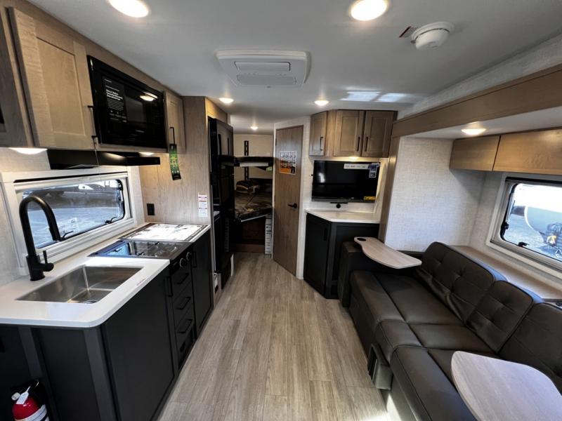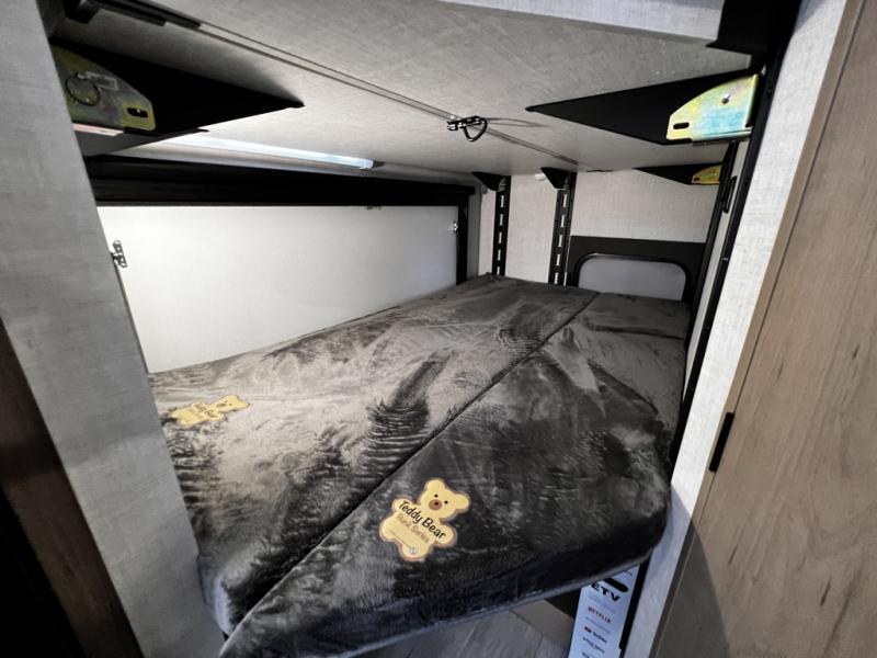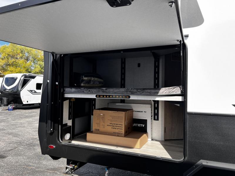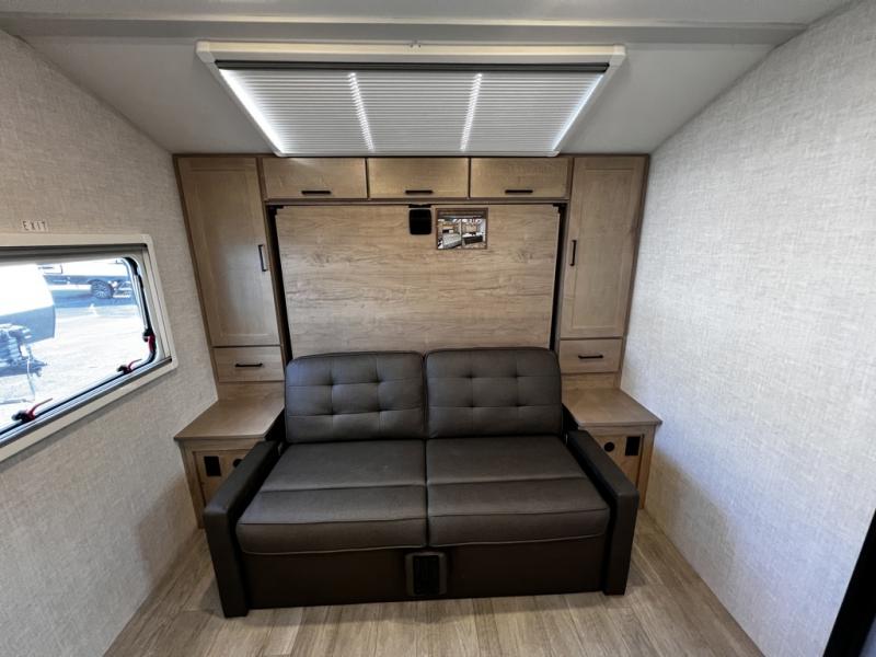 You're going to love everything about this travel trailer that can comfortably sleep three to six people each night, depending on your bunk configurations. There is a spacious storage locker that can be used for hiking gear, plus a kayak/bike storage door for quick and easy packing. The Embertrack system lets you convert the benches to twin bunks, double-size bunks, a desk, or remove them altogether for more storage space. You will enjoy the queen-size Murphy bed up front, along with the "stargazer" skylight for nighttime views, along with dual nightstands and dual wardrobes to keep your clothes tidy. And in the morning you can relax on the jack-knife sofa with a removable table once the bed is put away. This trailer also includes a full kitchen with a 12V refrigerator, an air fryer convection microwave oven, a dual burner cooktop, and a stainless steel sink for easy clean-up.