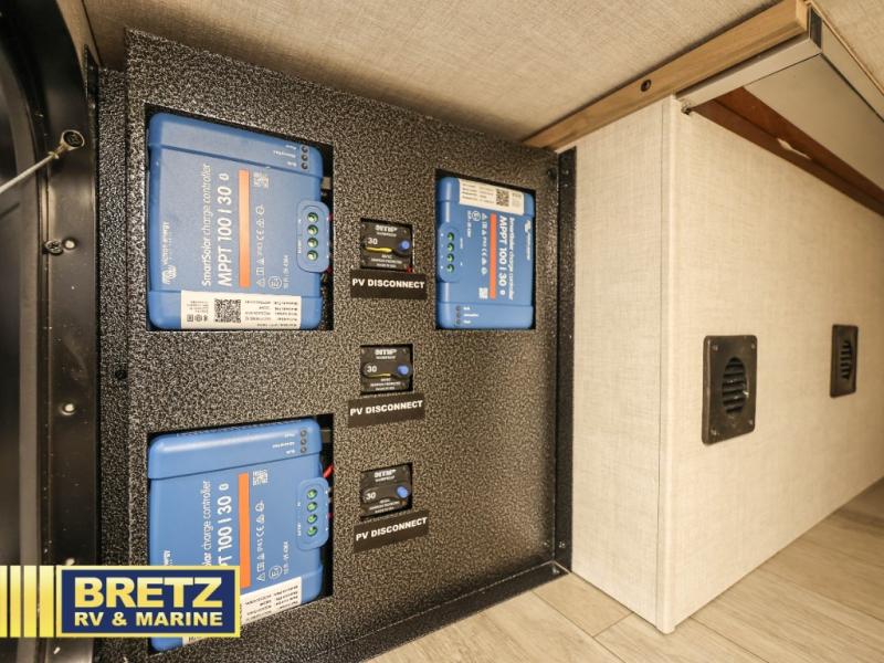 You're going to love everything about this travel trailer that can comfortably sleep three to six people each night, depending on your bunk configurations. There is a spacious storage locker that can be used for hiking gear, plus a kayak/bike storage door for quick and easy packing. The Embertrack system lets you convert the benches to twin bunks, double-size bunks, a desk, or remove them altogether for more storage space. You will enjoy the queen-size Murphy bed up front, along with the "stargazer" skylight for nighttime views, along with dual nightstands and dual wardrobes to keep your clothes tidy. And in the morning you can relax on the jack-knife sofa with a removable table once the bed is put away. This trailer also includes a full kitchen with a 12V refrigerator, an air fryer convection microwave oven, a dual burner cooktop, and a stainless steel sink for easy clean-up.