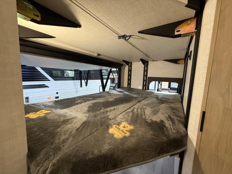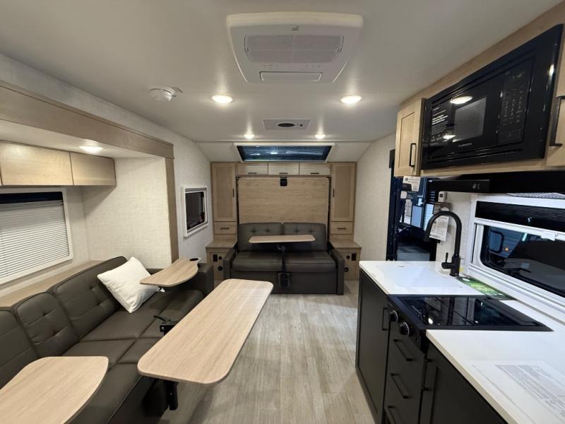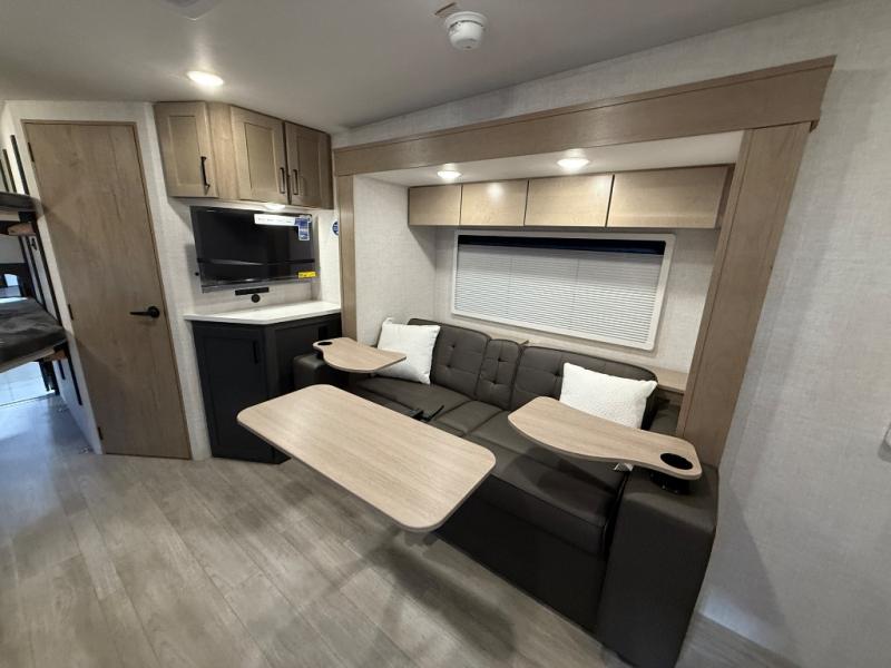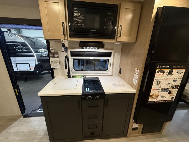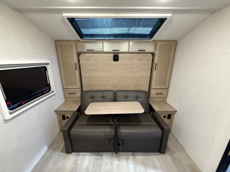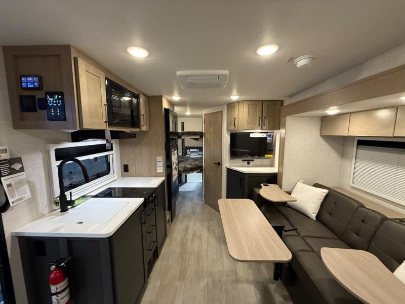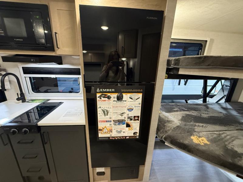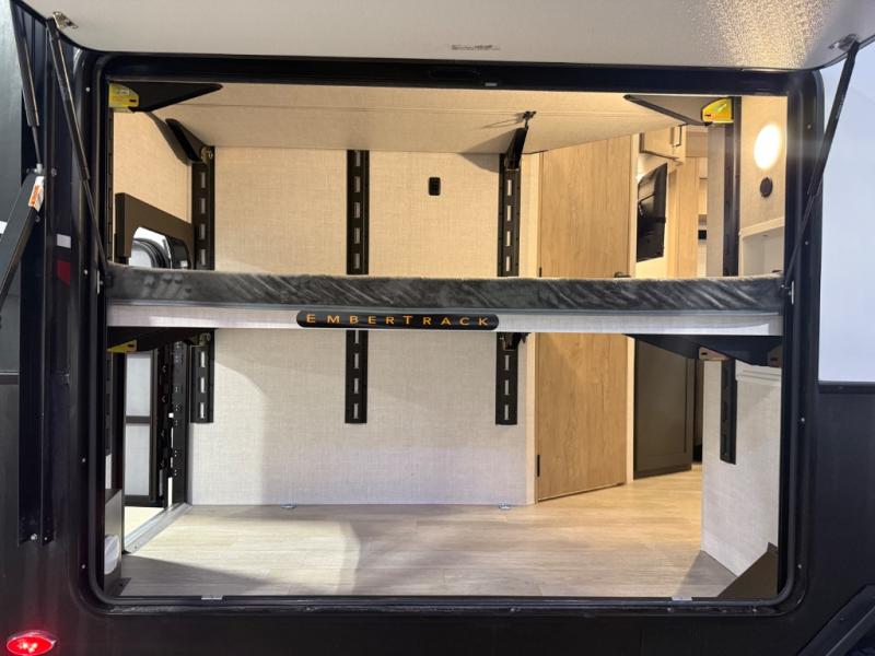 You're going to love everything about this travel trailer that can comfortably sleep three to six people each night, depending on your bunk configurations. There is a spacious storage locker that can be used for hiking gear, plus a kayak/bike storage door for quick and easy packing. The Embertrack system lets you convert the benches to twin bunks, double-size bunks, a desk, or remove them altogether for more storage space. You will enjoy the queen-size Murphy bed up front, along with the "stargazer" skylight for nighttime views, along with dual nightstands and dual wardrobes to keep your clothes tidy. And in the morning you can relax on the jack-knife sofa with a removable table once the bed is put away. This trailer also includes a full kitchen with a 12V refrigerator, an air fryer convection microwave oven, a dual burner cooktop, and a stainless steel sink for easy clean-up.