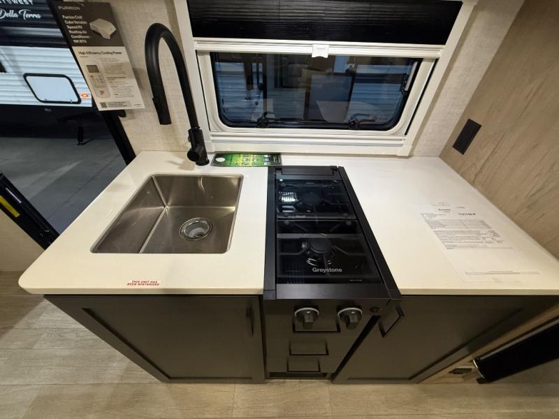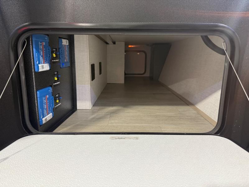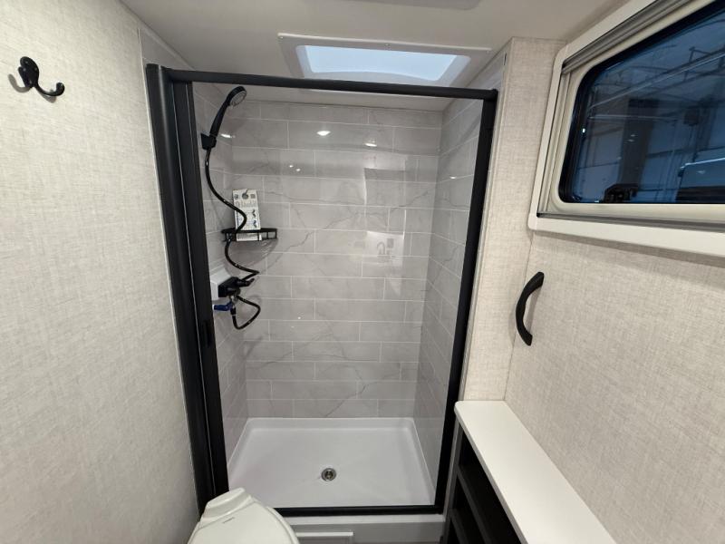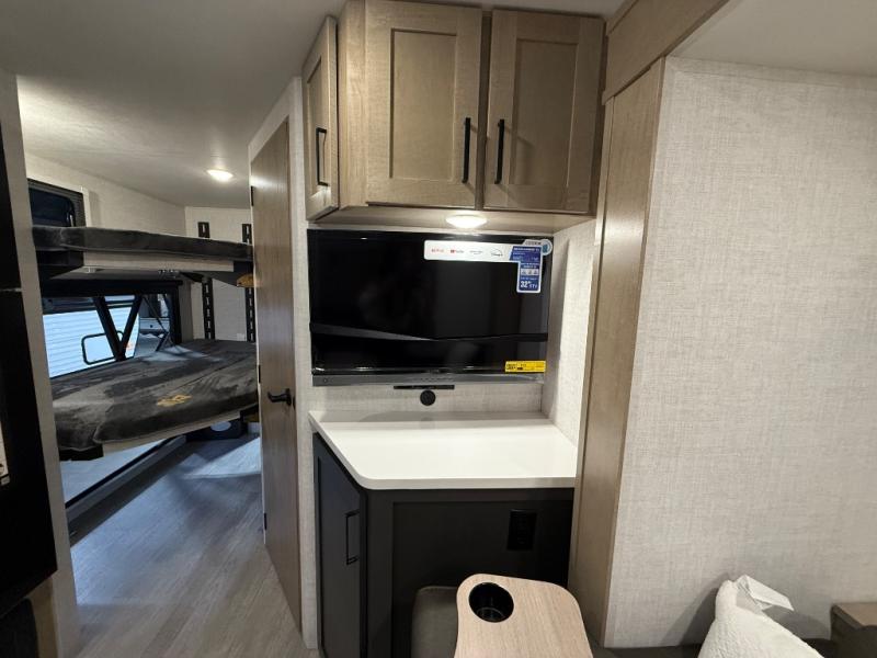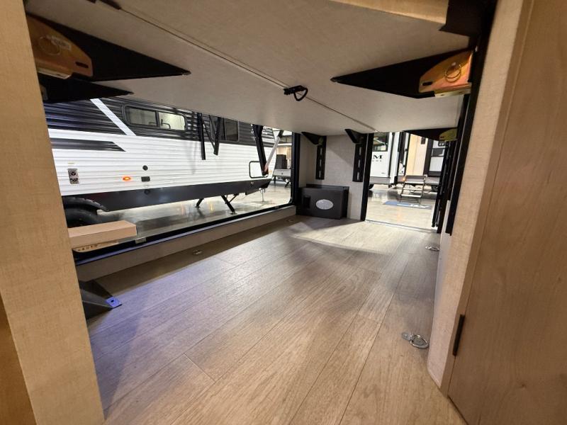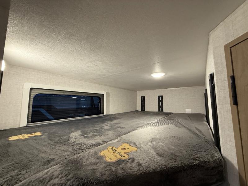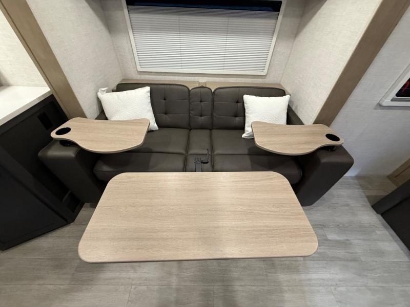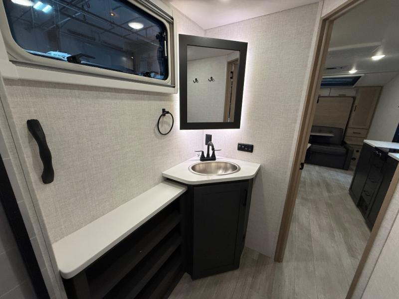 You're going to love everything about this travel trailer that can comfortably sleep three to six people each night, depending on your bunk configurations. There is a spacious storage locker that can be used for hiking gear, plus a kayak/bike storage door for quick and easy packing. The Embertrack system lets you convert the benches to twin bunks, double-size bunks, a desk, or remove them altogether for more storage space. You will enjoy the queen-size Murphy bed up front, along with the "stargazer" skylight for nighttime views, along with dual nightstands and dual wardrobes to keep your clothes tidy. And in the morning you can relax on the jack-knife sofa with a removable table once the bed is put away. This trailer also includes a full kitchen with a 12V refrigerator, an air fryer convection microwave oven, a dual burner cooktop, and a stainless steel sink for easy clean-up.