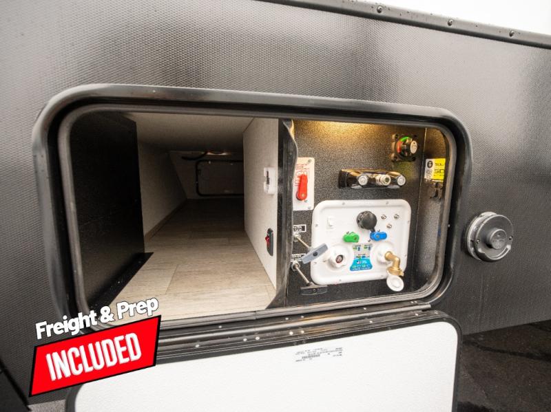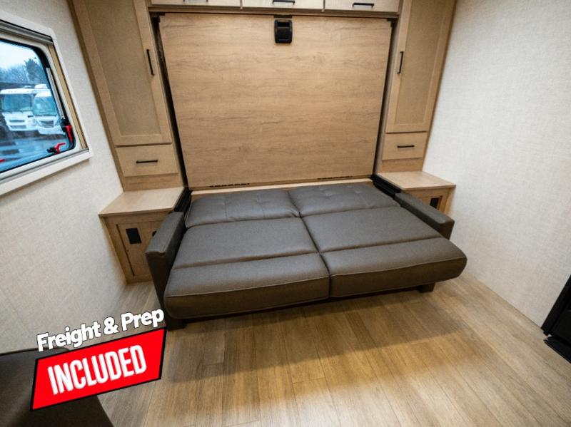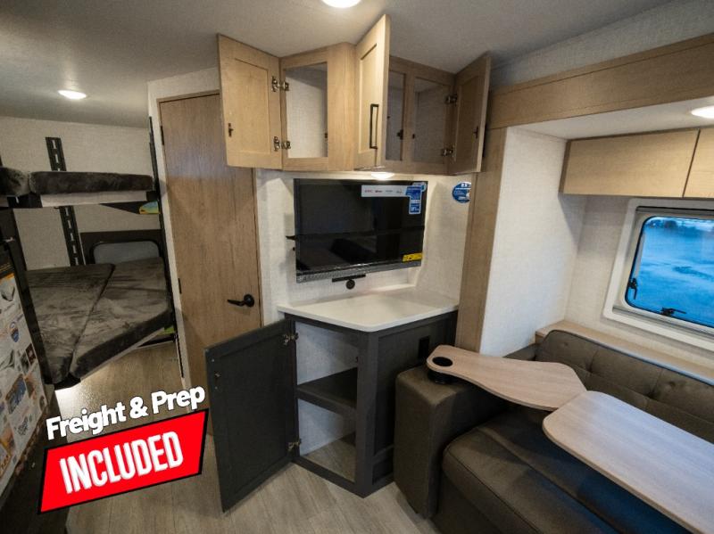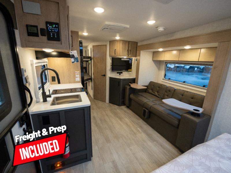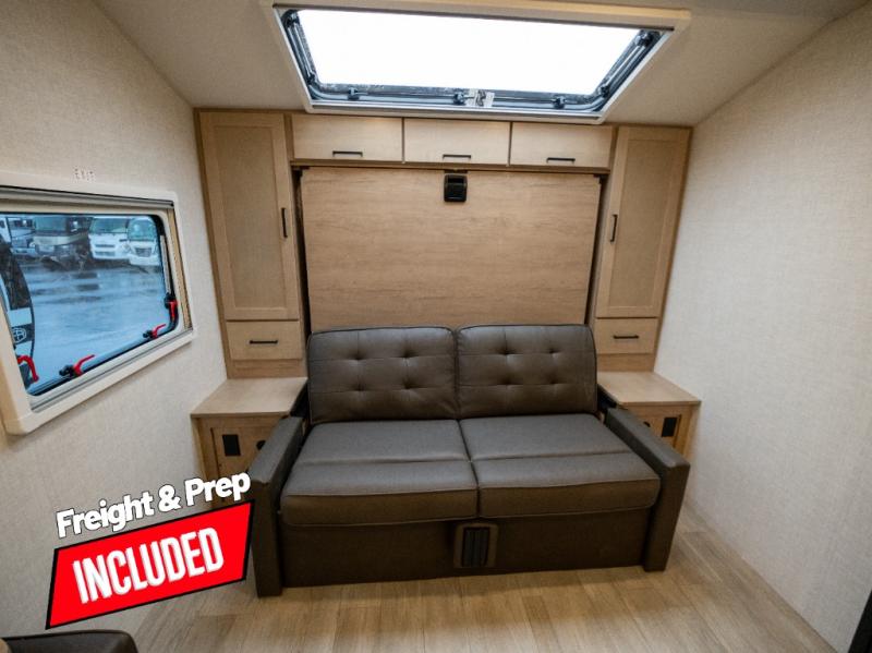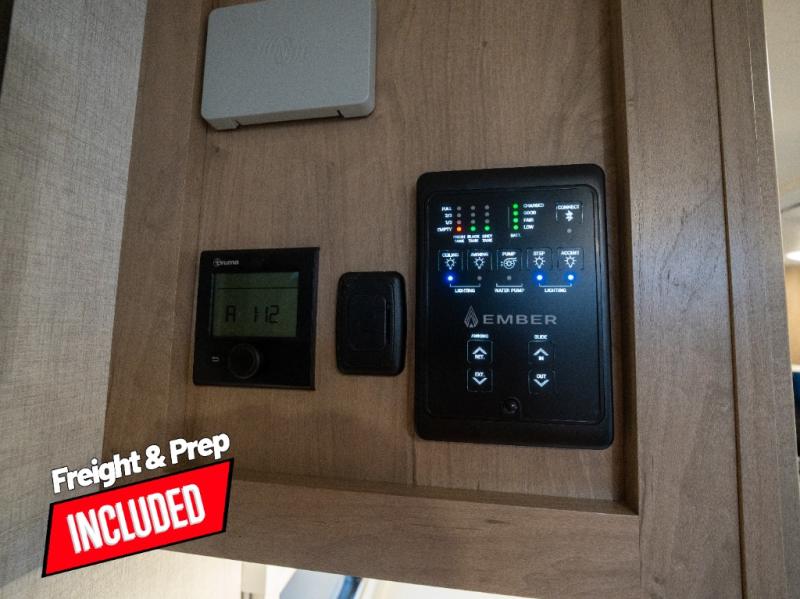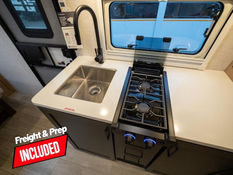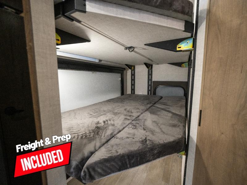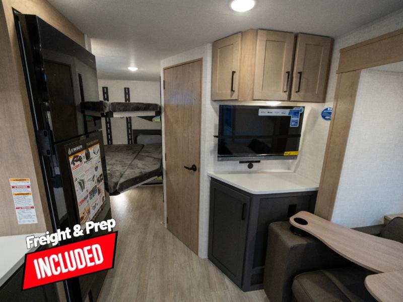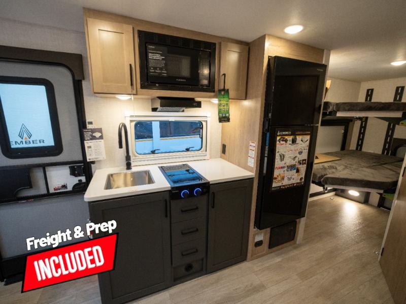 You're going to love everything about this travel trailer that can comfortably sleep three to six people each night, depending on your bunk configurations. There is a spacious storage locker that can be used for hiking gear, plus a kayak/bike storage door for quick and easy packing. The Embertrack system lets you convert the benches to twin bunks, double-size bunks, a desk, or remove them altogether for more storage space. You will enjoy the queen-size Murphy bed up front, along with the "stargazer" skylight for nighttime views, along with dual nightstands and dual wardrobes to keep your clothes tidy. And in the morning you can relax on the jack-knife sofa with a removable table once the bed is put away. This trailer also includes a full kitchen with a 12V refrigerator, an air fryer convection microwave oven, a dual burner cooktop, and a stainless steel sink for easy clean-up.