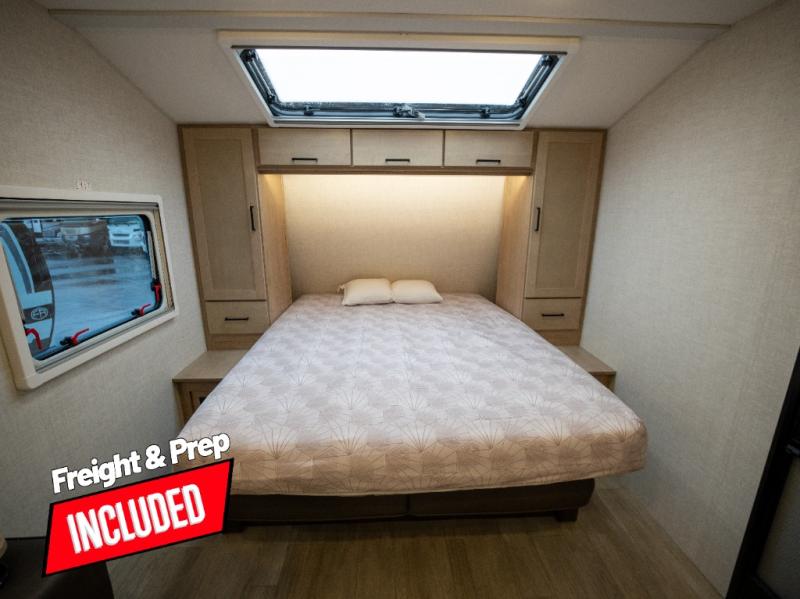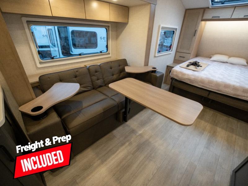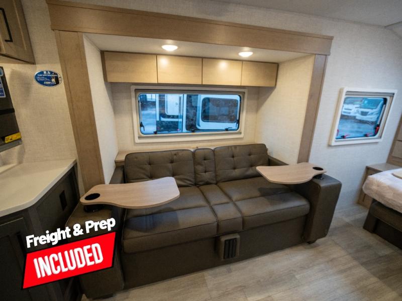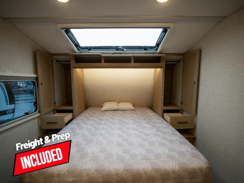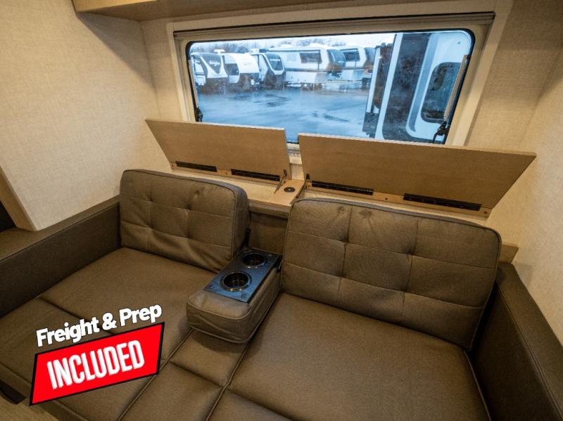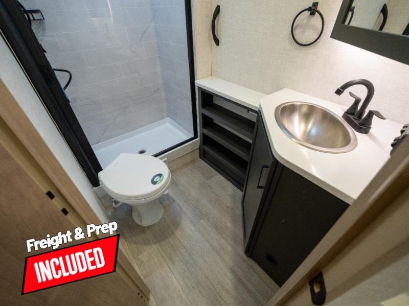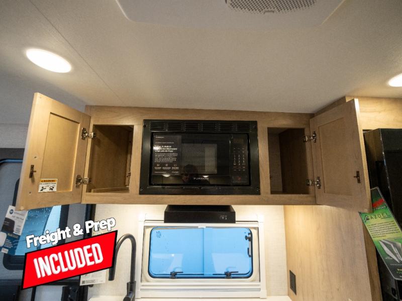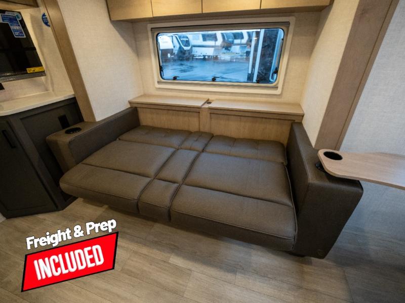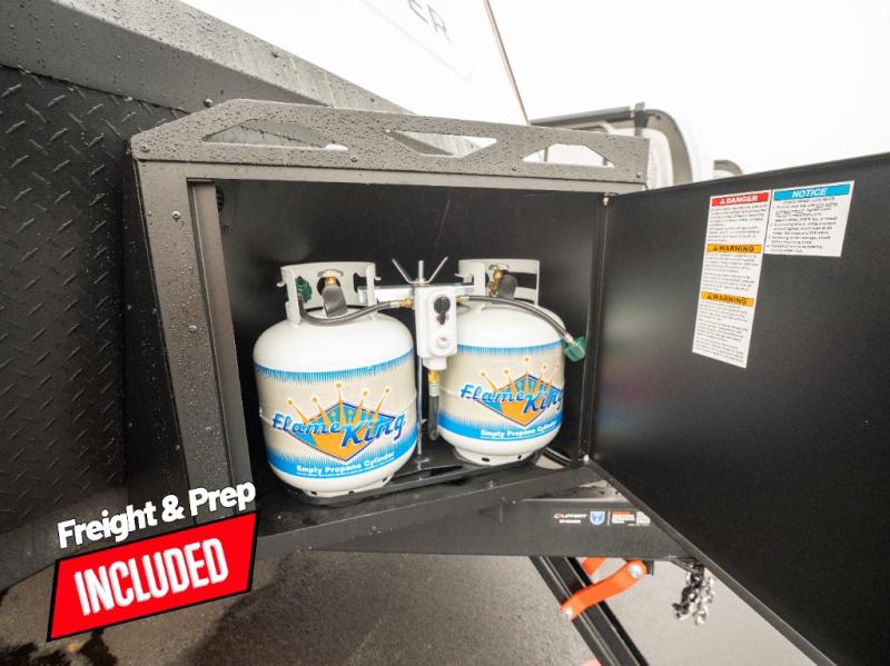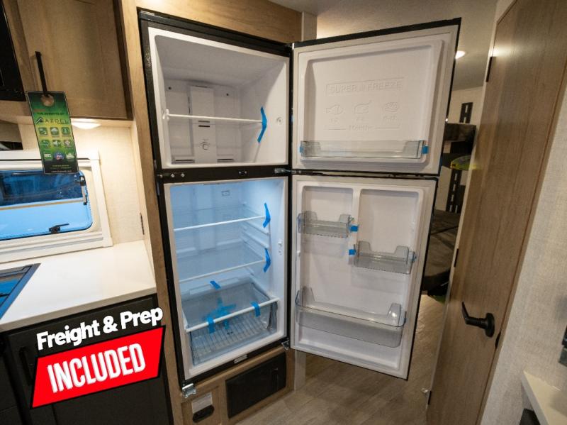 You're going to love everything about this travel trailer that can comfortably sleep three to six people each night, depending on your bunk configurations. There is a spacious storage locker that can be used for hiking gear, plus a kayak/bike storage door for quick and easy packing. The Embertrack system lets you convert the benches to twin bunks, double-size bunks, a desk, or remove them altogether for more storage space. You will enjoy the queen-size Murphy bed up front, along with the "stargazer" skylight for nighttime views, along with dual nightstands and dual wardrobes to keep your clothes tidy. And in the morning you can relax on the jack-knife sofa with a removable table once the bed is put away. This trailer also includes a full kitchen with a 12V refrigerator, an air fryer convection microwave oven, a dual burner cooktop, and a stainless steel sink for easy clean-up.