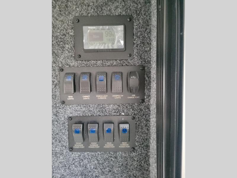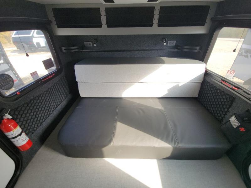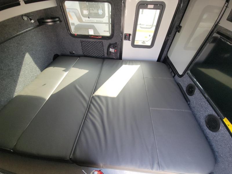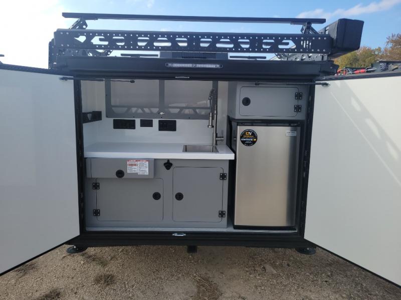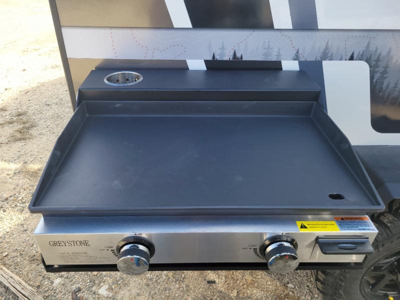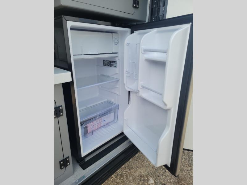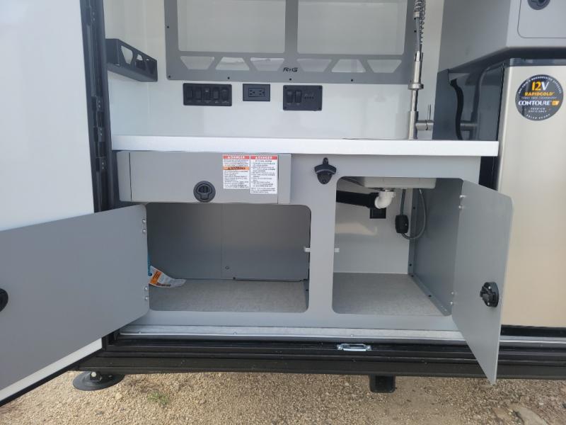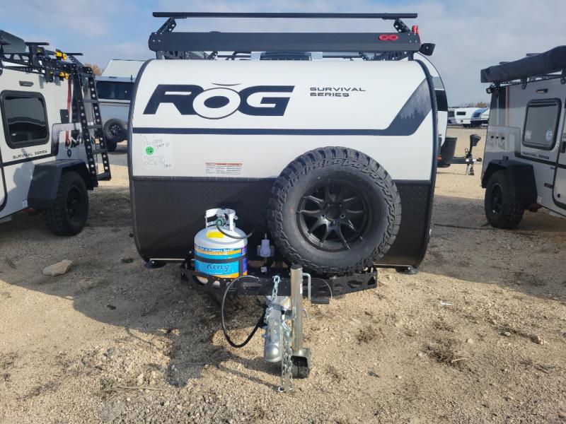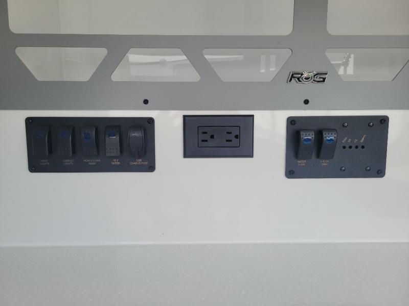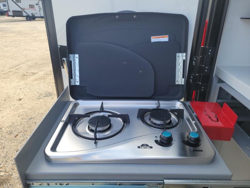 You will be so excited to test out this ROG travel trailer for yourself! The interior has great storage solutions to keep your camp gear secure. The rear outdoor kitchen has convenient amenities to help you eat well while you're away. You'll find a two-burner stove with cast-iron grates and a 3.3 cu. ft. 12V refrigerator to cook and store food. And the queen/futon mattress is sure to bring a great night's rest!