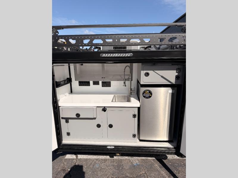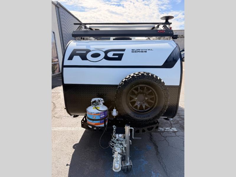 You will be so excited to test out this ROG travel trailer for yourself! The interior has great storage solutions to keep your camp gear secure. The rear outdoor kitchen has convenient amenities to help you eat well while you're away. You'll find a two-burner stove with cast-iron grates and a 3.3 cu. ft. 12V refrigerator to cook and store food. And the queen/futon mattress is sure to bring a great night's rest!