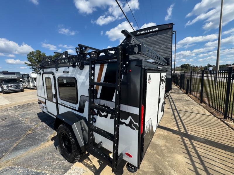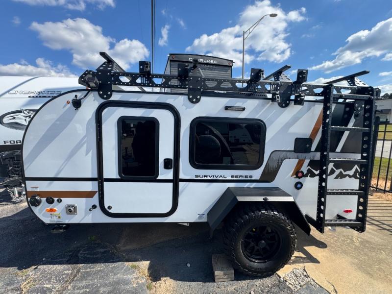 You'll be ready for anything in the 12RKSS Survival Series travel trailer! The rugged Survival Series upgrades make it suitable for the most extreme adventures, but you'll still love the comfortable living space, with amenities like a queen futon/mattress, AM/FM Bluetooth stereo, and tons of storage space. Outside you'll find a fully-equipped kitchen, with a removable table, 26" griddle, two burner cooktop, 3.3 cu. ft. refrigerator, and a stainless steel sink. The optional Power-Up package adds a 200-watt solar panel, 100 aH lithium battery, a battery monitor with custom bezel, and two extra battery trays so you will be prepared to go truly off-grid.