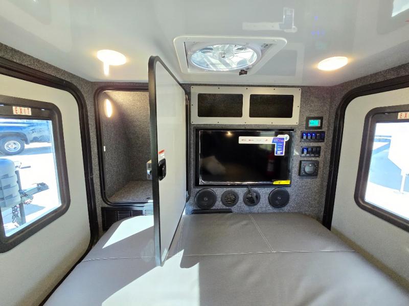 The Encore RV ROG Survival Series travel trailers offers tons of extra features for those who want to take on tougher terrain. The exterior is equipped with useful tools like an off-grid ladder, a splitting axe and a chopping axe, and an overland shovel. The optional roof rack has four 74" crossbars, and a pair of flood lights are mounted there as well. Custom Survival Series graphics also set this one apart, and the standard flag bracket with mount and pole can be equipped with an American or Canadian flag. And for some extra bonus items, you will love the personal water filtration system, first aid kit, and the Survival Hacks book, which will surely come in handy!