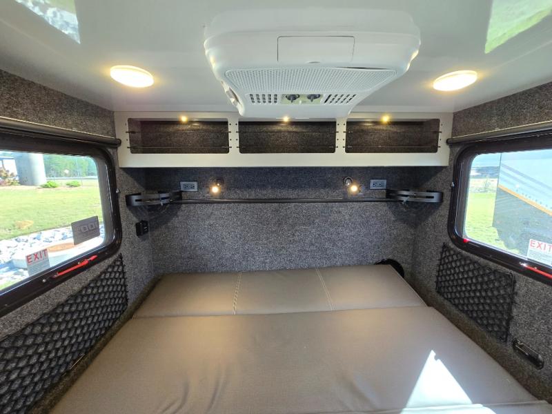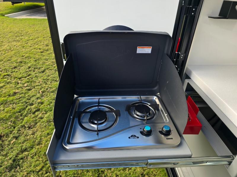 You'll be ready for anything in the 12RKSS Survival Series travel trailer! The rugged Survival Series upgrades make it suitable for the most extreme adventures, but you'll still love the comfortable living space, with amenities like a queen futon/mattress, AM/FM Bluetooth stereo, and tons of storage space. Outside you'll find a fully-equipped kitchen, with a removable table, 26" griddle, two burner cooktop, 3.3 cu. ft. refrigerator, and a stainless steel sink. The optional Power-Up package adds a 200-watt solar panel, 100 aH lithium battery, a battery monitor with custom bezel, and two extra battery trays so you will be prepared to go truly off-grid.