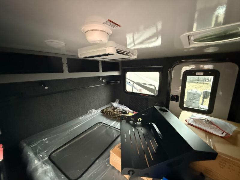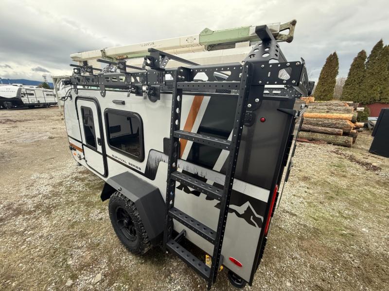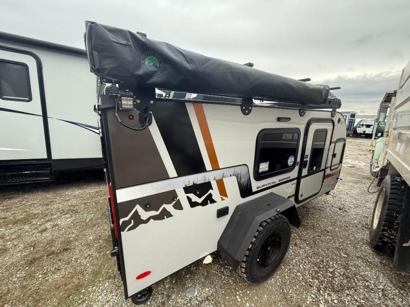 You'll be ready for anything in the 12RKSS Survival Series travel trailer! The rugged Survival Series upgrades make it suitable for the most extreme adventures, but you'll still love the comfortable living space, with amenities like a queen futon/mattress, AM/FM Bluetooth stereo, and tons of storage space. Outside you'll find a fully-equipped kitchen, with a removable table, 26" griddle, two burner cooktop, 3.3 cu. ft. refrigerator, and a stainless steel sink. The optional Power-Up package adds a 200-watt solar panel, 100 aH lithium battery, a battery monitor with custom bezel, and two extra battery trays so you will be prepared to go truly off-grid.